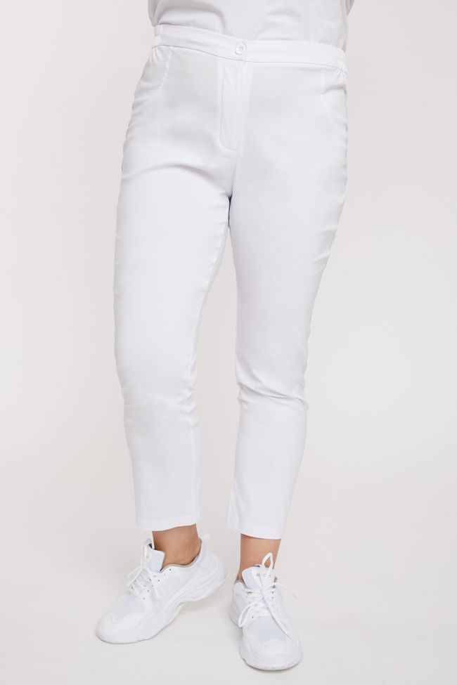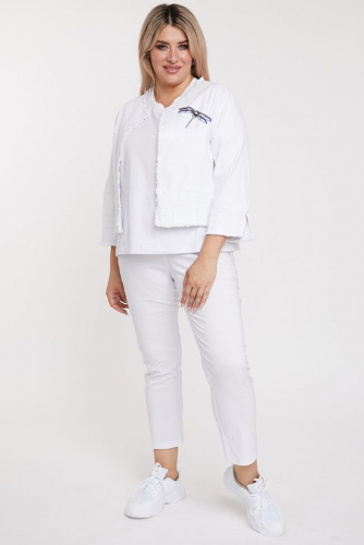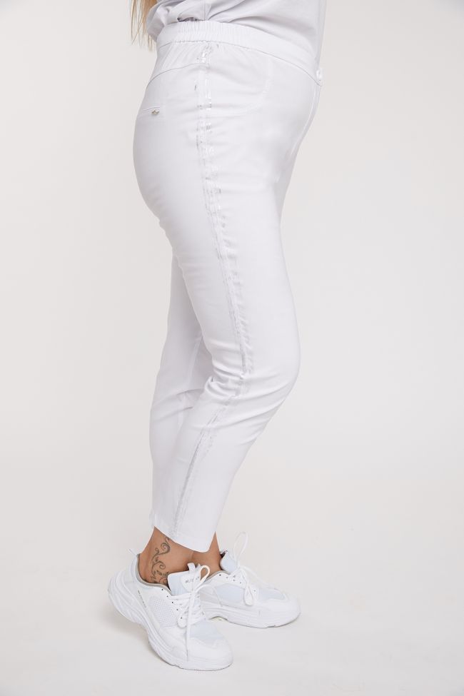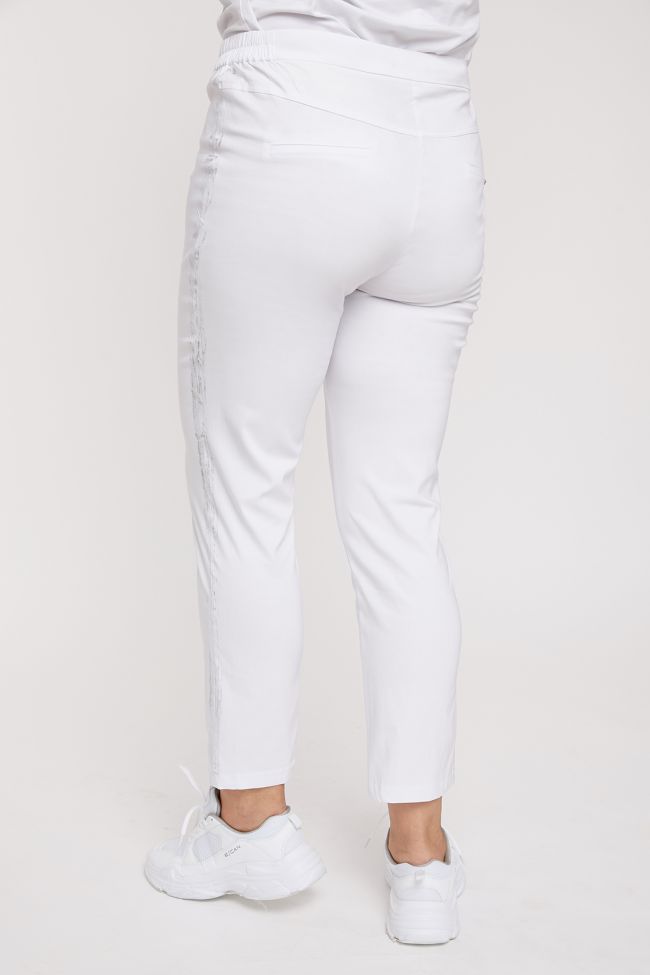 белый Эффектные брюки полуприлегающего силуэта из ткани стрейч. Передние половинки с подрезным бочком, имитирующим карманы. По боковым швам нанесен принт "лампасы". На задних половинках кокетка и прорезные карманы-обманки с листочкой. Модель с комфортной высокой посадкой на талии. Верх с комбинированным поясом, дополнен резинкой по бокам. Центр переда с застежкой на петлю-пуговицу и молнию. Низ зауженный.