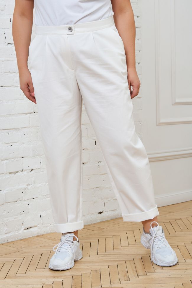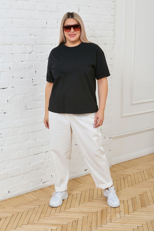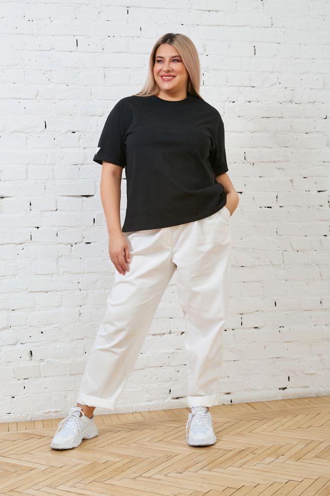 белый Брюки свободного силуэта -  бойфренды. Выполнены из хлопковой ткани с добавлением эластана Модель с комфортной высокой посадкой и комбинированным поясом, с застежкой на тесьму-молнию и пуговицу. Брюки прямого кроя, бедра и голени  плотно не облегают.  По переду удобные наклонные карманы с листочкой. Они отлично вписываются в " уличный" стиль и подойдут для повседневной носки. Сочетаются с любыми блузами, рубашками ,майками. Изделие после стирки дает усадку, просьба учитывать это.