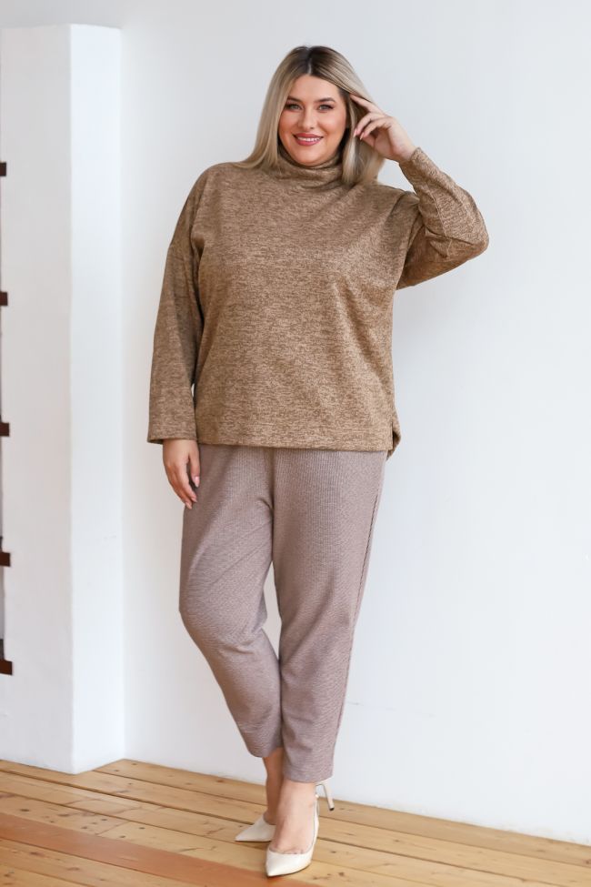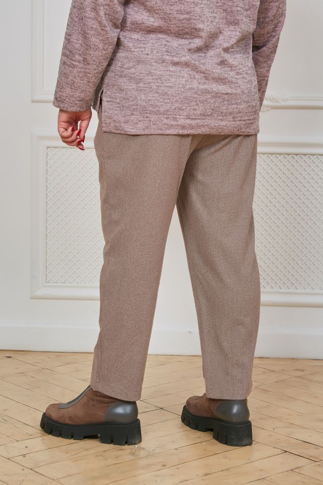 коричневый Брюки укороченные, зауженные к низу, выполнены из плотного костюмного трикотажа. Модель с комфортной высокой посадкой на талии, без застежки. Верх с комбинированным поясом, дополнен резинкой сзади, с переходом на перед, по переду вставка со шнуром. Передние половинки с удобными наклонными карманами с отрезным бочком. Длина изделия по внутреннему шву 65 см.