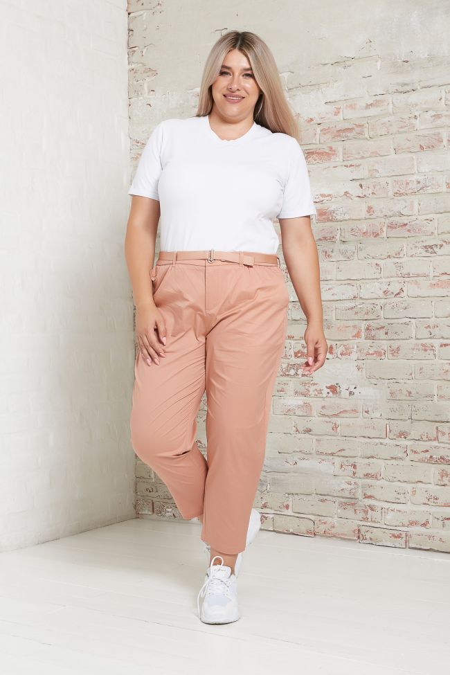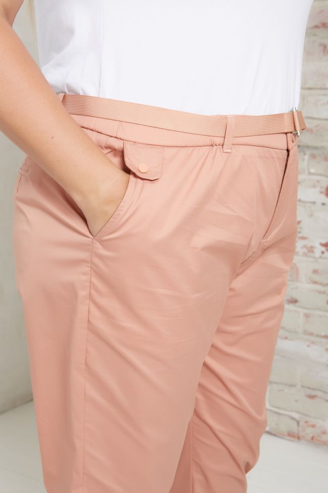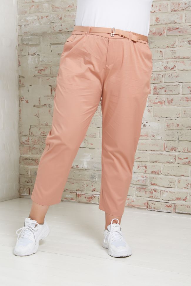 пудровый Стильные укороченные брюки, с наклонными карманами по бокам и складками по талии. Выполнены из хлопковой брючной ткани. Модель с комфортной высокой посадкой и комбинированным поясом,  застежка - гульфик на молнию и пуговицу. На задних половинках прорезные карманы в рамку. Модель составит гармоничный комплект с однотонными и принтованными топами и блузами. Отличный вариант для стильного повседневного гардероба. В комплекте прилагается ремешок.Длина по внутреннему шву 63 см