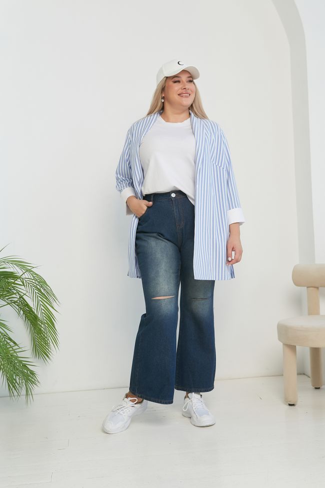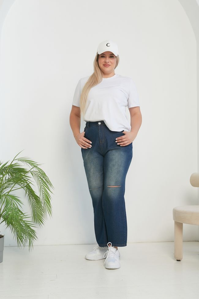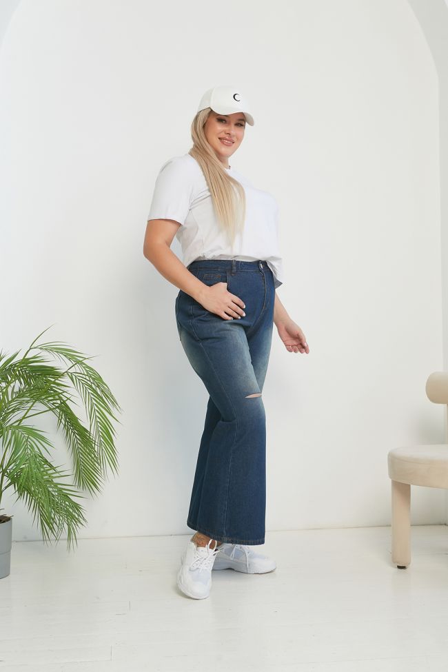 темно-синий Стильные джинсы-клеш с рваными коленями, выполнены из плотной хлопковой ткани. Модель с комфортной высокой посадкой и поясом, дополненным шлевками. По центру застежка - гульфик на молнию и пуговицу. По переду удобные карманы с подрезным бочком, на задних половинках накладные карманы.