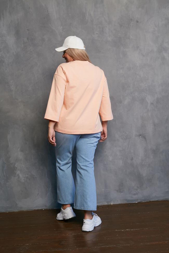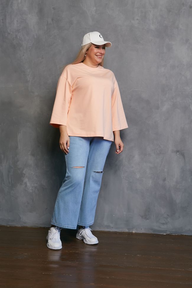 голубой Стильные джинсы-клеш с рваными коленями, выполнены из плотной хлопковой ткани. Модель с комфортной высокой посадкой и поясом, дополненным шлевками. По центру застежка - гульфик на молнию и пуговицу. По переду удобные карманы с подрезным бочком, на задних половинках накладные карманы.