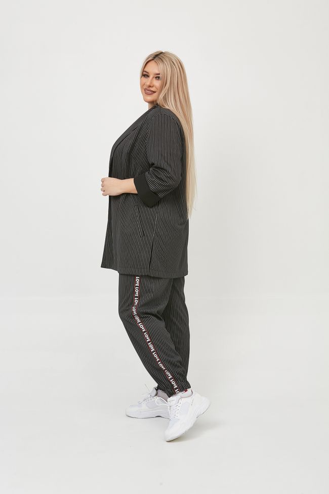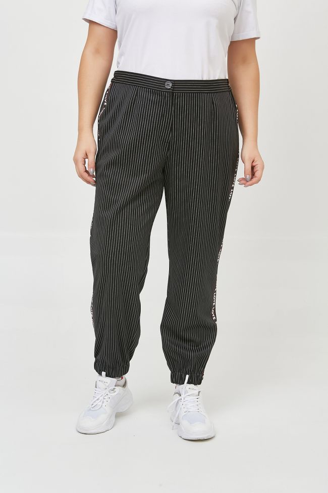 черный Эффектные брюки из костюмной ткани в полоску, с высокой посадкой по фигуре. Модель на комбинированном поясе, с застежкой на  молнию и пуговицу. По боковым швам модный акцент в виде яркой репсовой ленты - лампасов. Низ присборен на широкую резину. Отличный вариант для стильного повседневного гардероба.Длина по внутреннему шву 71 см.