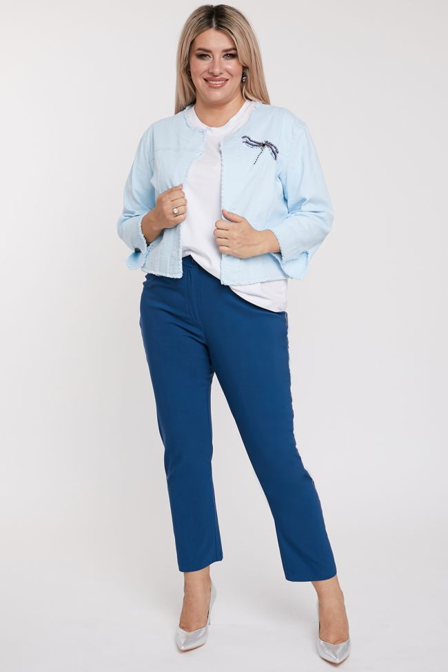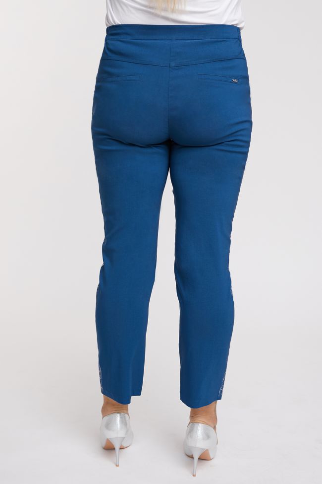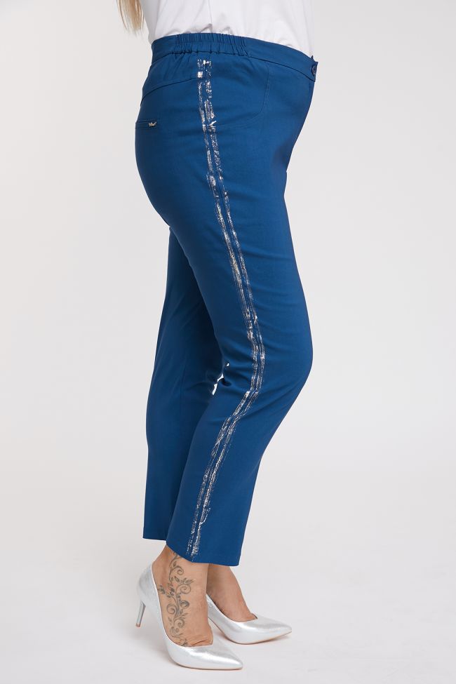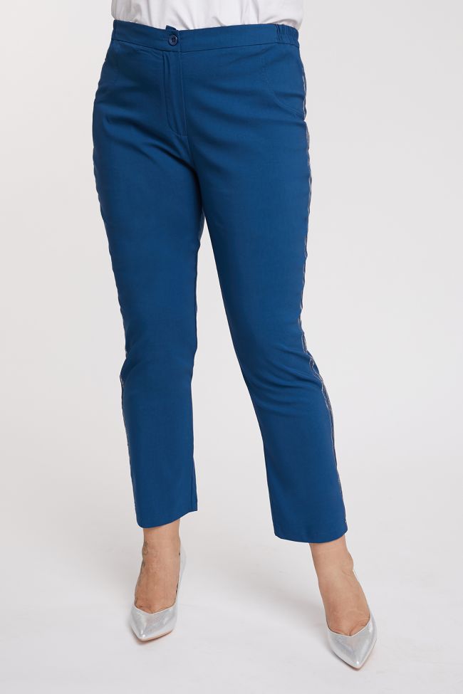 синий Эффектные брюки полуприлегающего силуэта из ткани стрейч. Передние половинки с подрезным бочком, имитирующим карманы. По боковым швам нанесен принт "лампасы". На задних половинках кокетка и прорезные карманы-обманки с листочкой. Модель с комфортной высокой посадкой на талии. Верх с комбинированным поясом, дополнен резинкой по бокам. Центр переда с застежкой на петлю-пуговицу и молнию. Низ зауженный.
