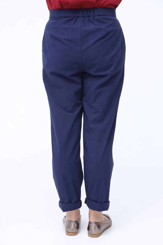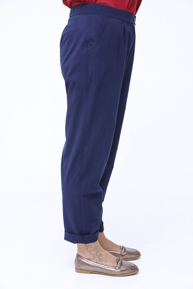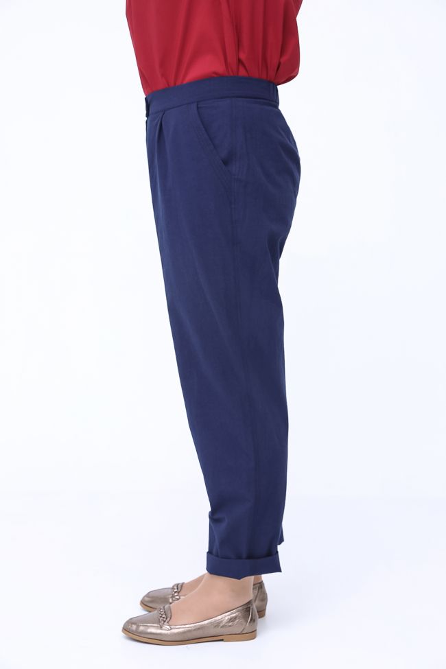 темно-синий Эффектные брюки "чинос", свободного силуэта, с наклонными карманами по бокам и складками по талии. Выполнены из хлопковой ткани. Модель с комфортной высокой посадкой и комбинированным поясом,  застежка - гульфик на молнию и пуговицу. Модель составит гармоничный комплект с однотонными и принтованными топами и блузами. Отличный вариант для стильного повседневного гардероба.