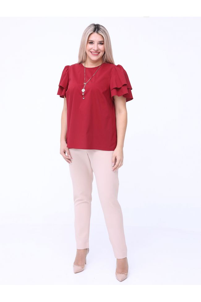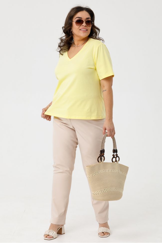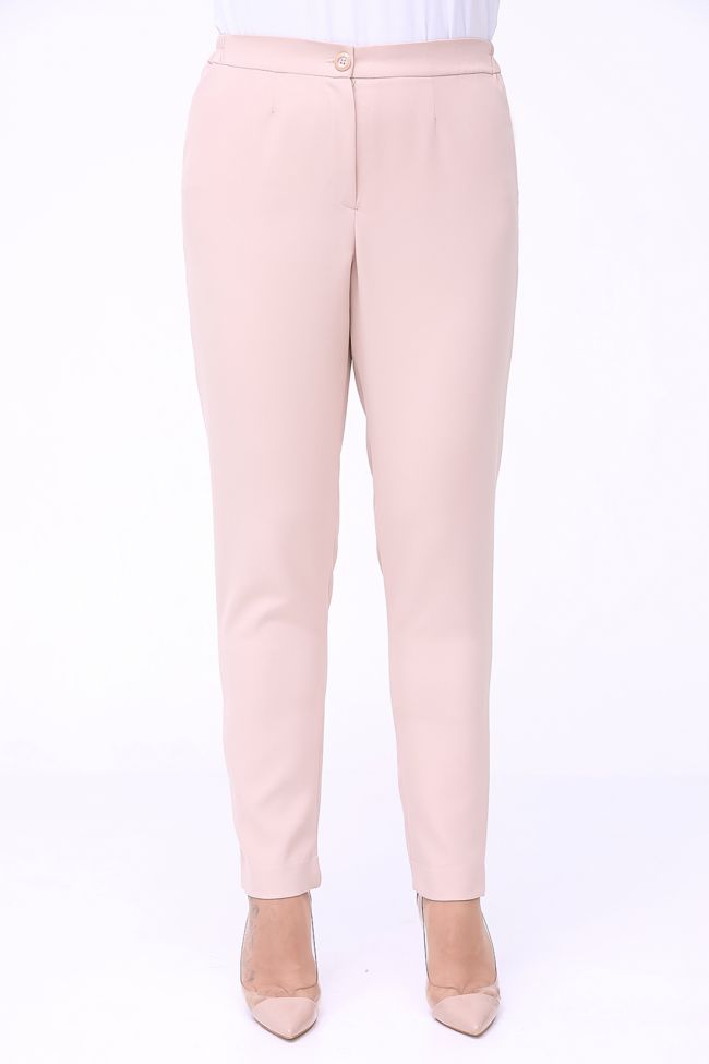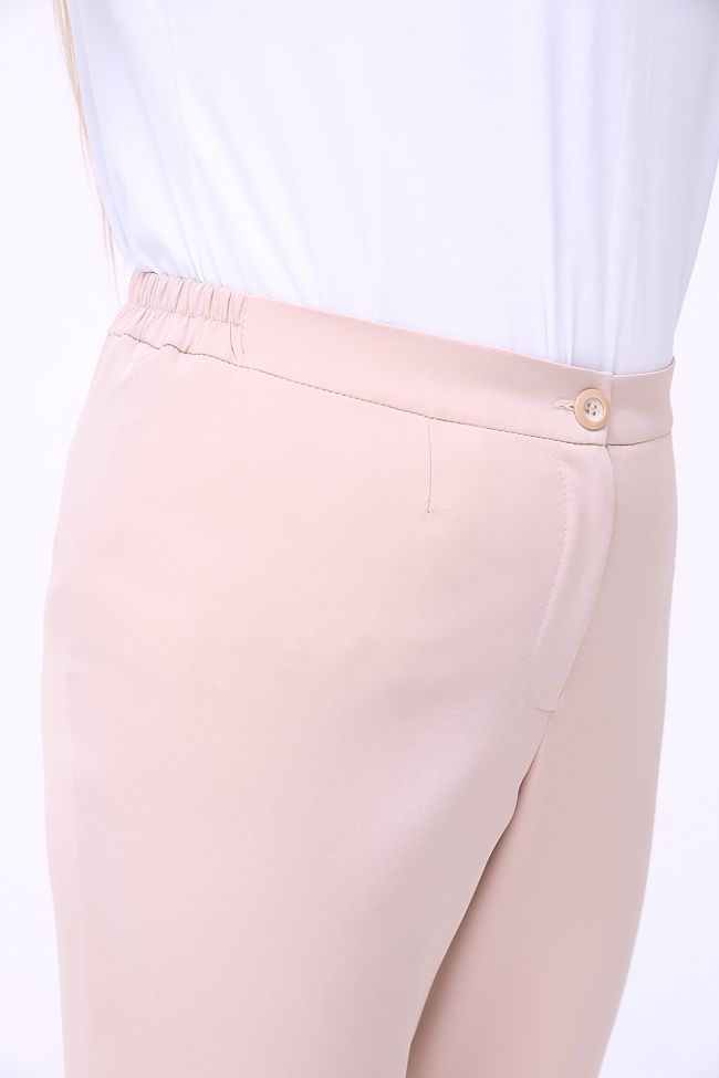 бежевый Брюки полуприлегающего силуэта из костюмной ткани "Барби". Модель с комфортной высокой посадкой на талии. Верх с комбинированным  поясом, дополнен резинкой по бокам. Центр переда с застежкой гульфик на молнии. Низ зауженный. Длина изделия с поясом по боковому шву - 108 см.