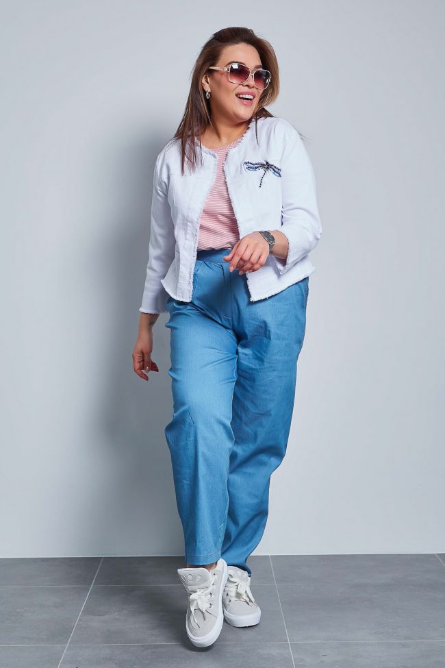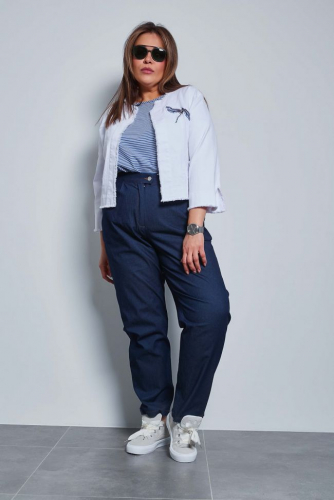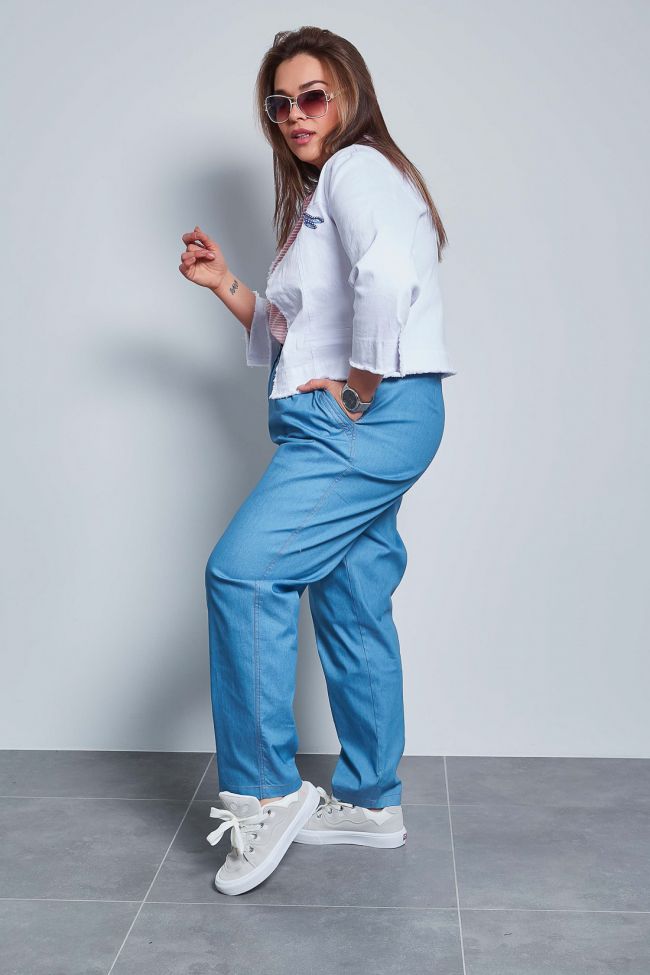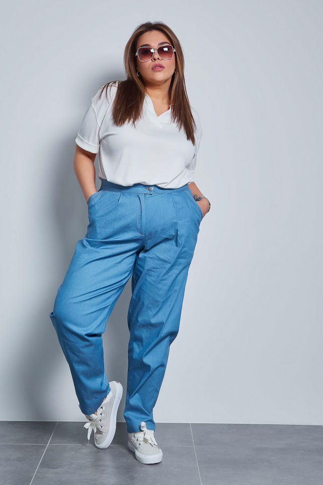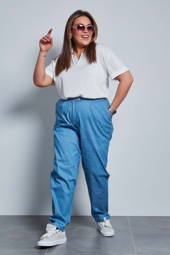 голубой Эффектные брюки "чинос", свободного силуэта, с наклонными карманами по бокам и складками по талии. Выполнены из джинсовой ткани. Модель с комфортной высокой посадкой и комбинированным поясом,  застежка - гульфик на молнию и пуговицу. Модель составит гармоничный комплект с однотонными и принтованными топами и блузами. Отличный вариант для стильного повседневного гардероба. Как и любые, джинсы перед первой ноской рекомендуем постирать.