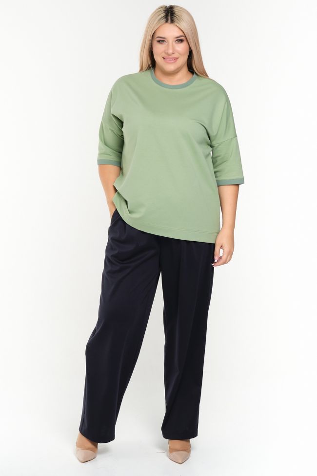 темно-синий Стильные брюки  свободного силуэта из трикотажа "Джерси". Модель с комфортной высокой посадкой на талии, без застежки. Верх с поясом на широкой резинке. Передние половинки с аккуратными складками и удобными карманами с отрезным бочком. Низ прямой.
