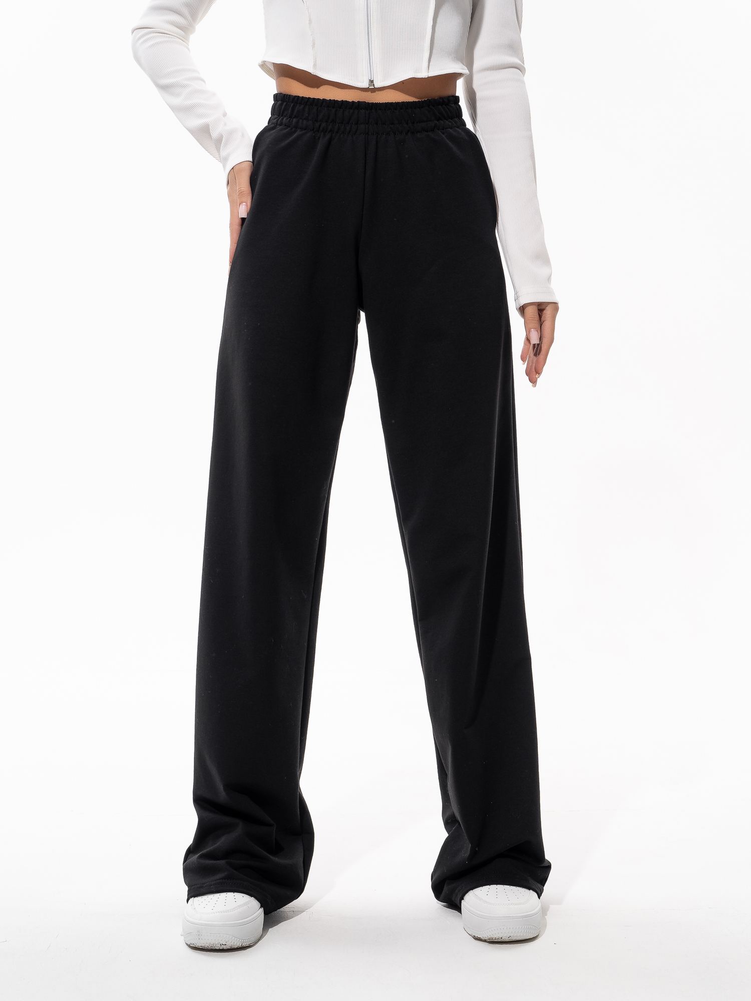 Женские широкие брюки-палаццо из футера черного цвета , с боковыми карманами. Завышенная линия талии, высокий пояс на эластичной резинке. Изделие выполнено из трикотажа премиального качества - ПЕНЬЕ, с содержанием хлопка более 92%
