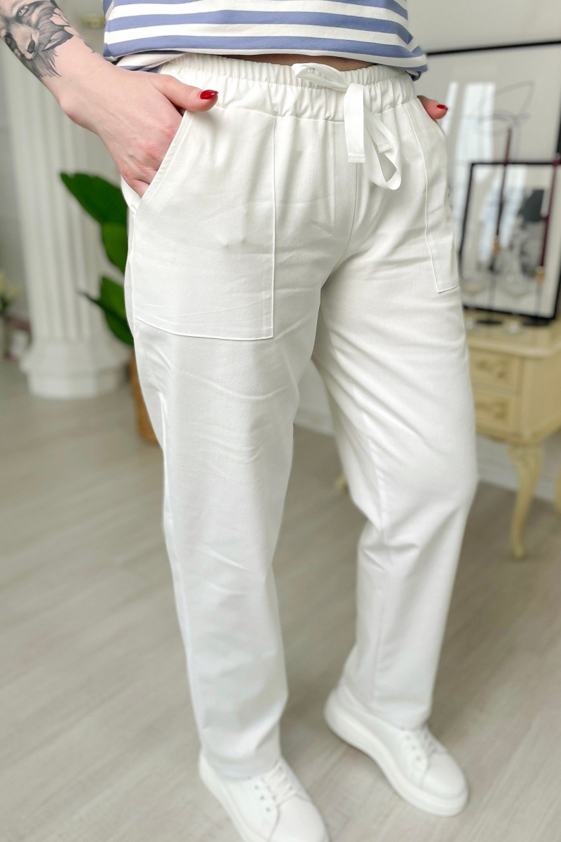 "Брюки женские из текстильной ткани (джинс) слегка заужены к низу. По переду расположены накладные карманы. Вверх брюк обработан поясом с широкой резинкой. В пояс вставлена тесьма.