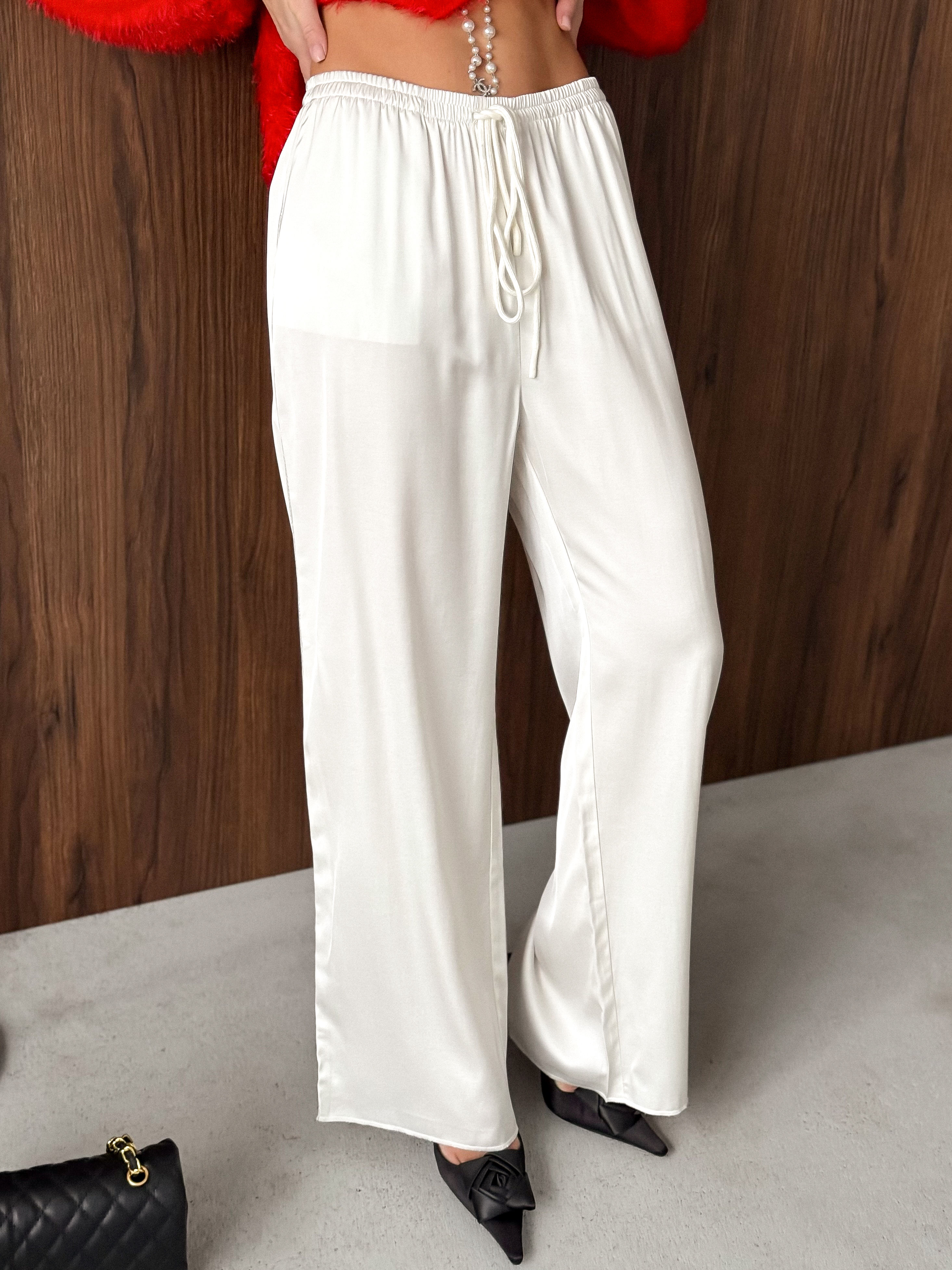 Брюки из вискозного полотна. Пояс на резинке дополнительно кулиса со шнуром. В боковых швах карманы и серебристый кант.