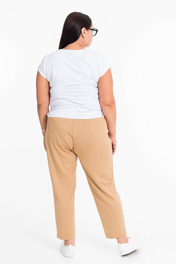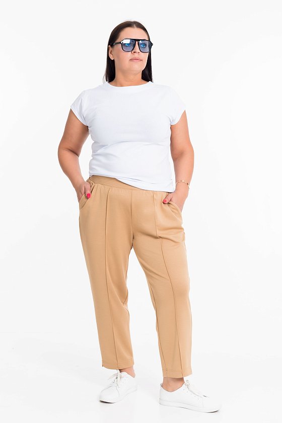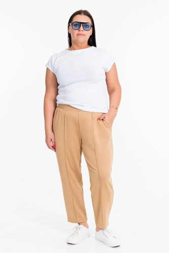 Женские брюки из интерлочного полотна выполнены в лаконичном и универсальном стиле. Модель со стрелками подчёркивает аккуратный силуэт и придаёт образу элегантность. Брюки свободного покроя, комфортные в носке, к низу слегка заужены, что делает их современными и практичными. Подходят как для повседневных образов, так и для более деловых комплектов.