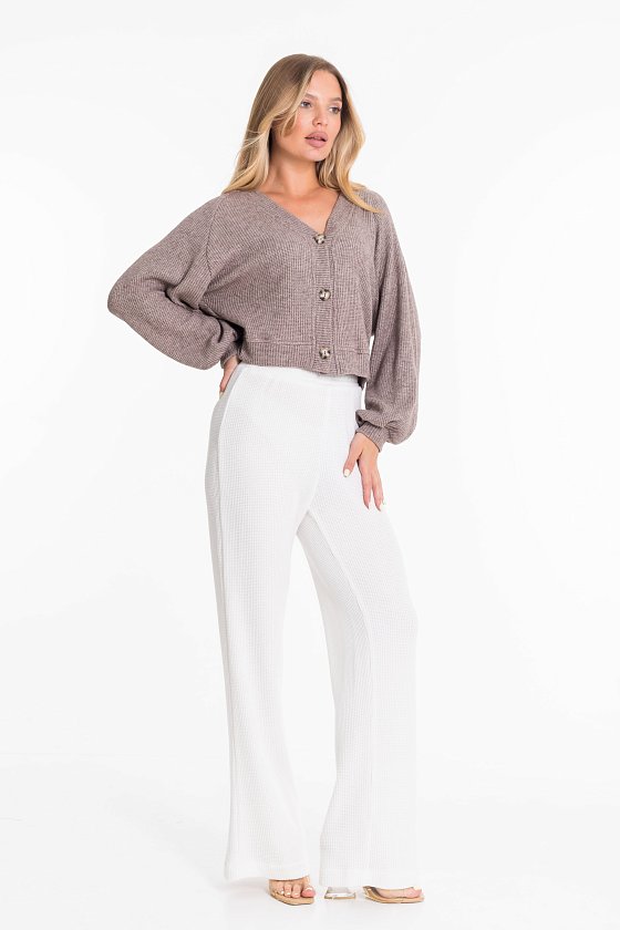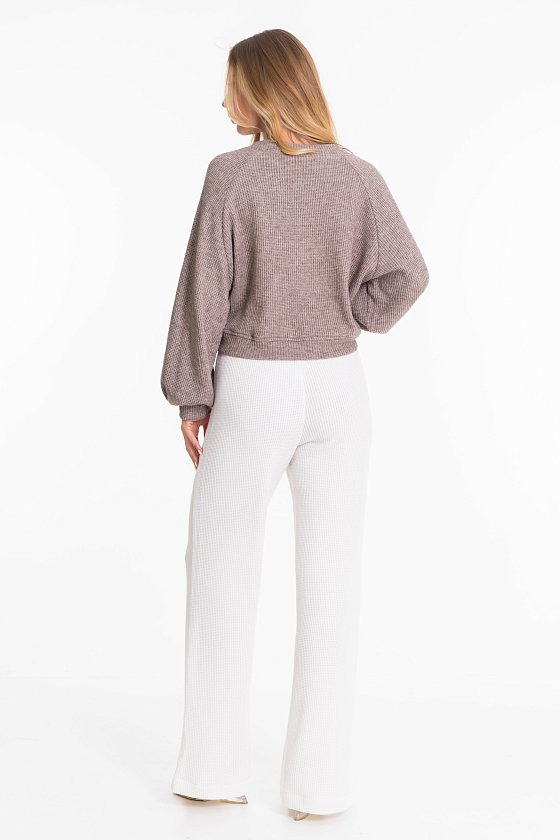 Женские брюки — отличный выбор для повседневной носки. Они изготовлены из вязаного полотна. Брюки свободного силуэта не сковывают движений, а широкий пояс на резинке обеспечивает комфортную посадку.