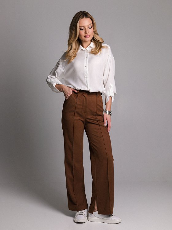 Брюки из материала «замша диагональ» станут стильным акцентом гардероба. Мягкая фактура ткани дарит комфорт и подчеркивает элегантность, а разрез внизу штанин добавляет современный штрих и делает образ более динамичным. Отлично сочетаются с рубашками, блузами и повседневными топами, позволяя создавать как деловые, так и расслабленные комплекты.