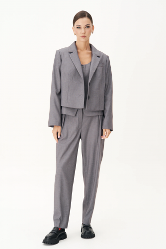 Брюки широкие, на притачном поясе со шлёвками, классической брючной застёжкой на потайные крючки и молнию. Передние половинки брюк с 2-ми мягкими складками-защипами, наклонными боковыми карманами. Задние половинки брюк с вытачками и прорезными карманами с листочкой.Длина брюк около 106 см.