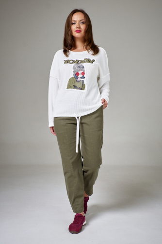 Брюки из хлопкового джинса со стрейчем длиной до косточки, силуэтной формы "бананы", с четырьмя функциональными карманами и одним декоративным. Передние и задние половинки брюк с вертикальными швами по центру. В боковой части,  на уровне колена, горизотальные подезы. Ширина брюк по низ  регулируетсяхлястикм с засежкой на пуговцу.  Изделие декорировано хольнитенами и нашивками.