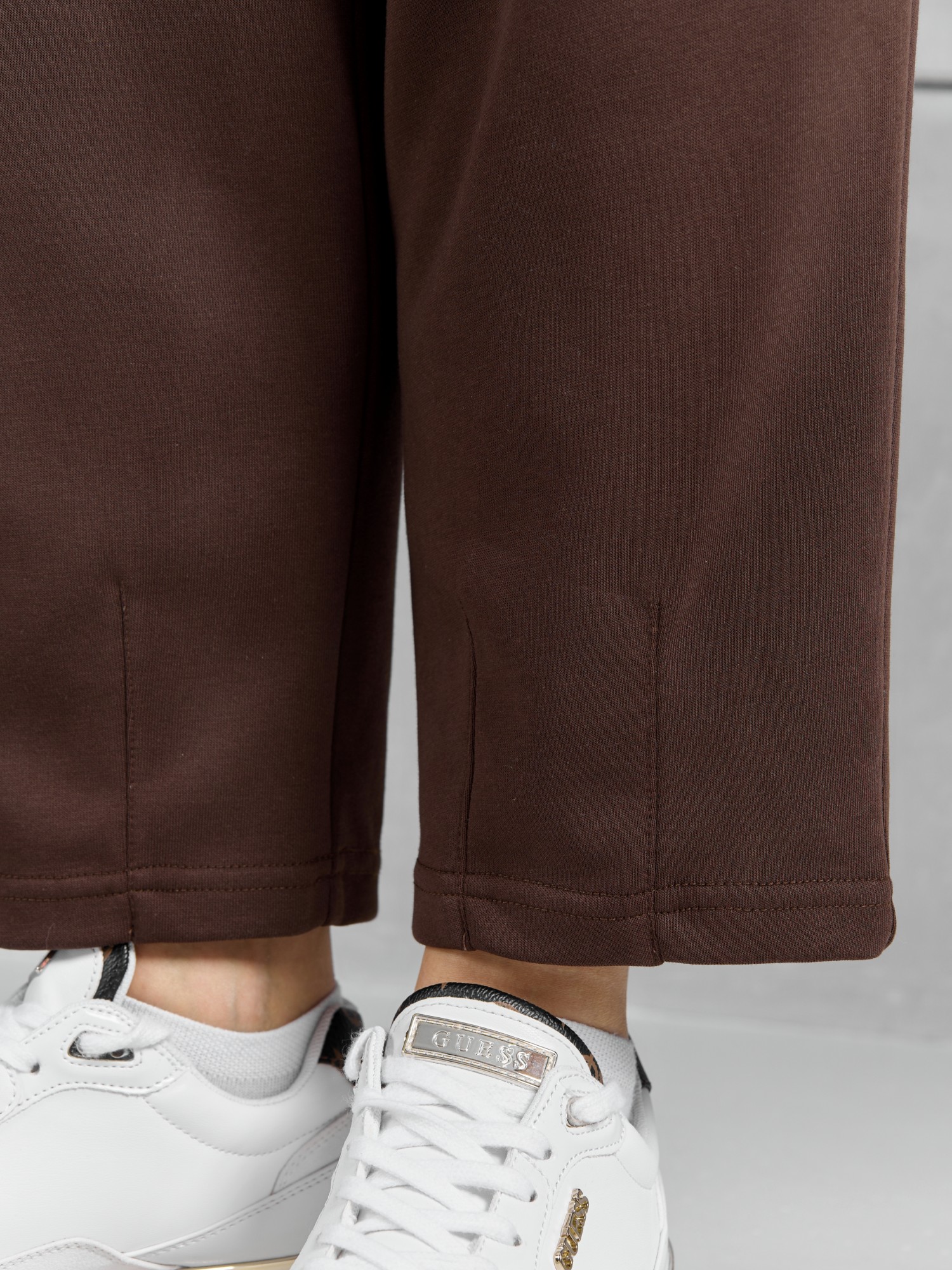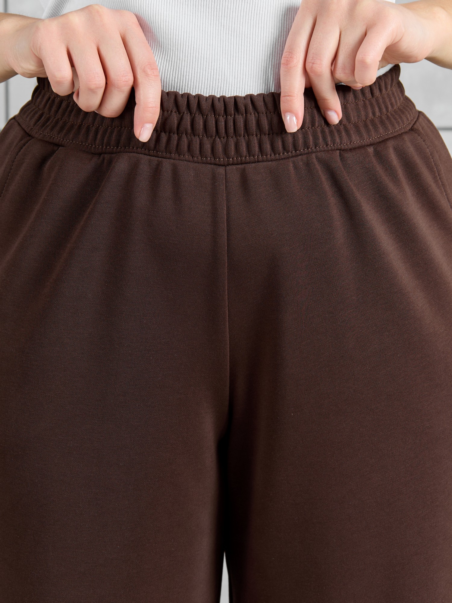 Брюки женские укороченные, на притачном поясе с эластичной тесьмой внутри и карманами в боковых швах. На нижних частях передних половин застрочены две вертикальные складочки-защипы.