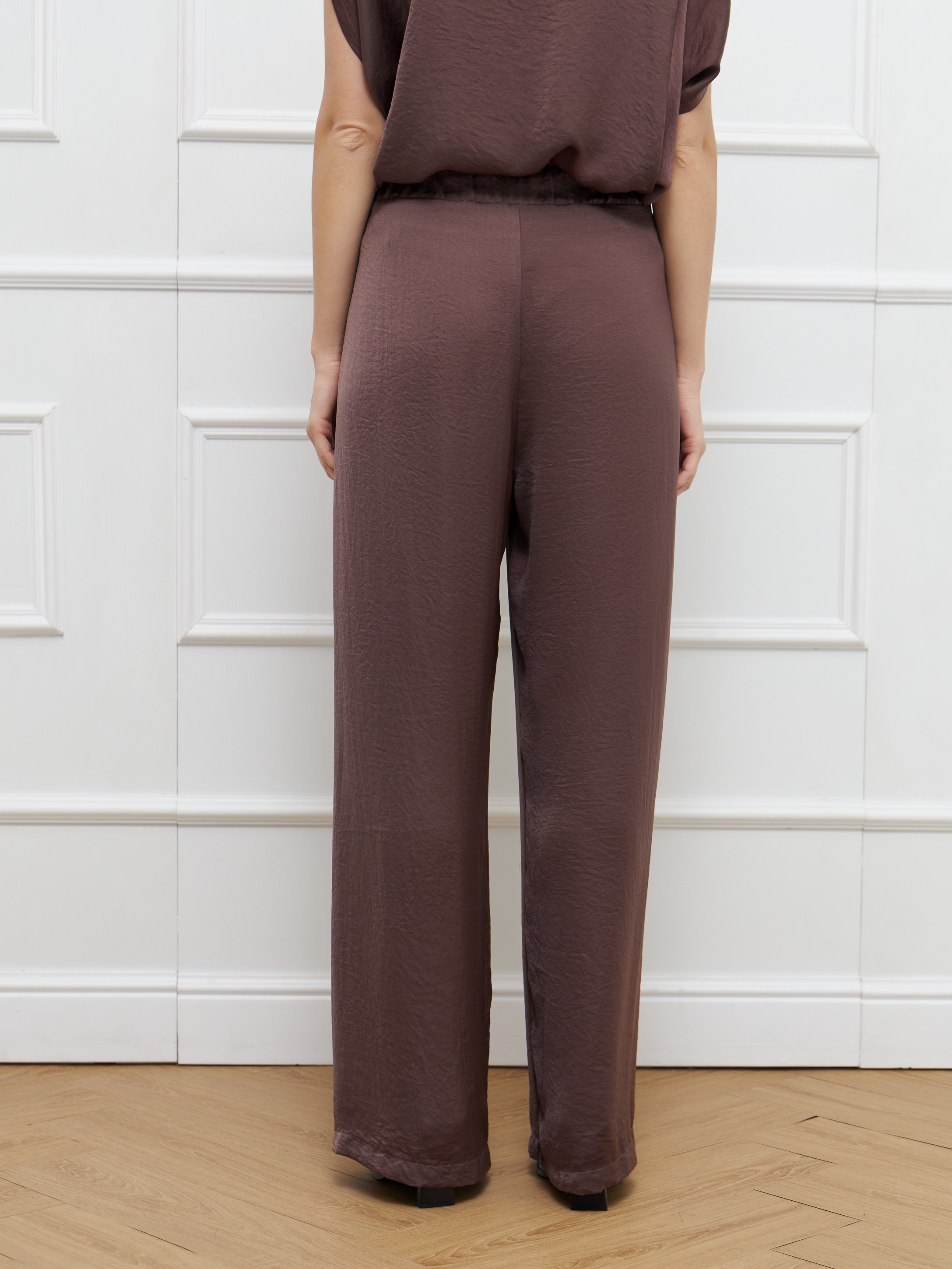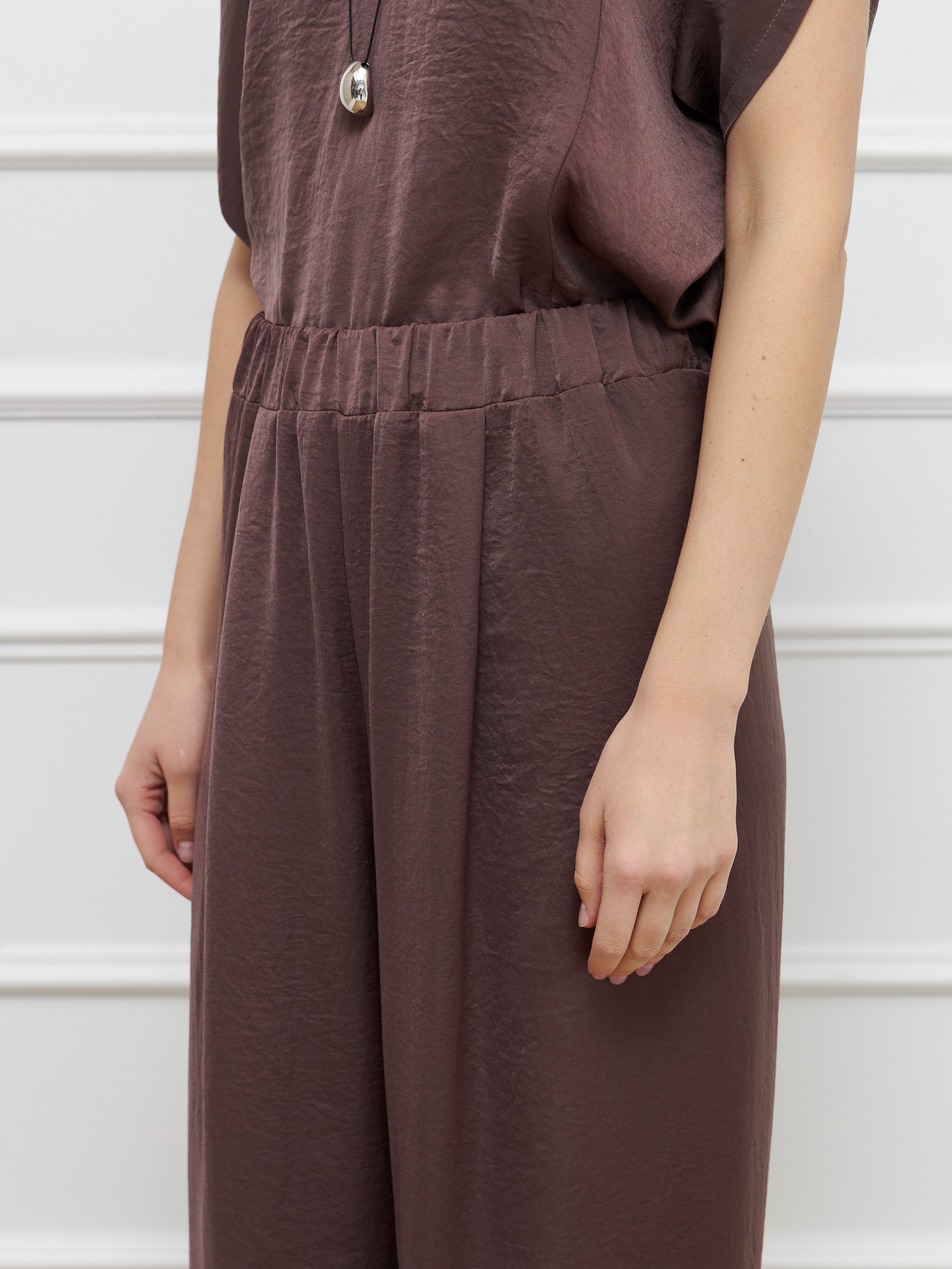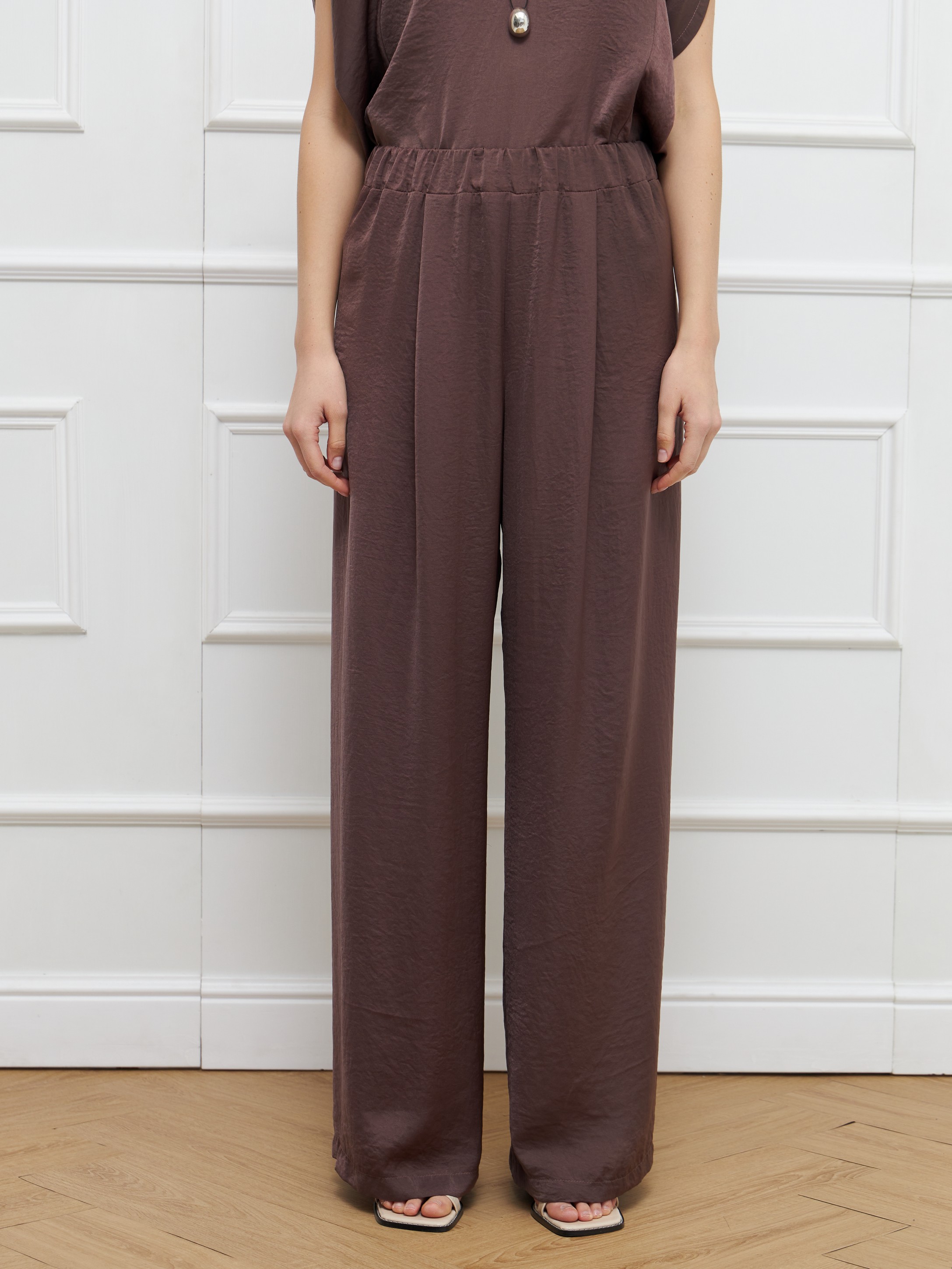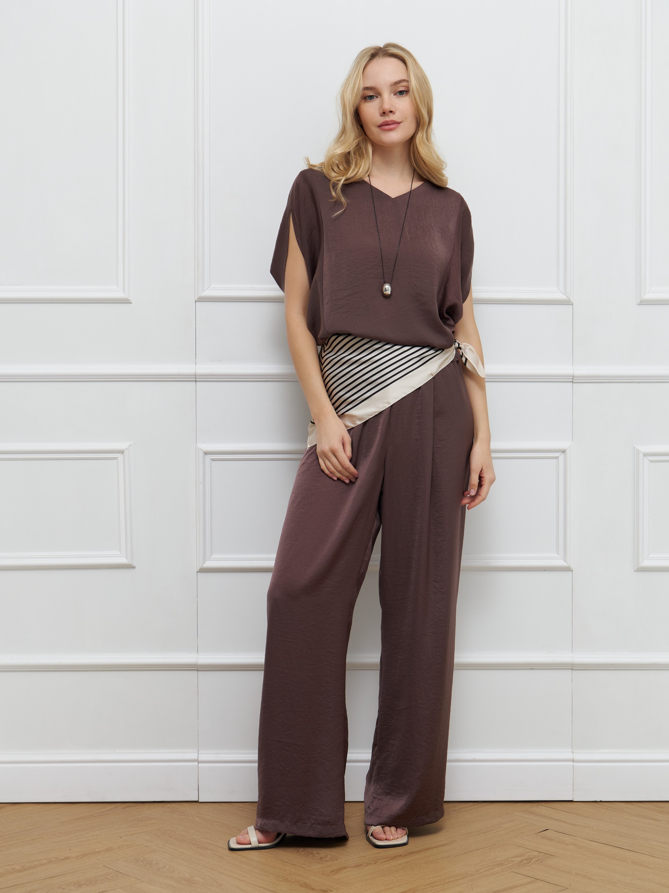 Широкие брюки без бокового шва, с мягкими складками спереди, на эластичном поясе, выполнены из невесомого искусственного шелка. Легкая струящаяся модель в трюфельном оттенке, представлена на фото с блузкой  Д-249 ТРФ(Л5).