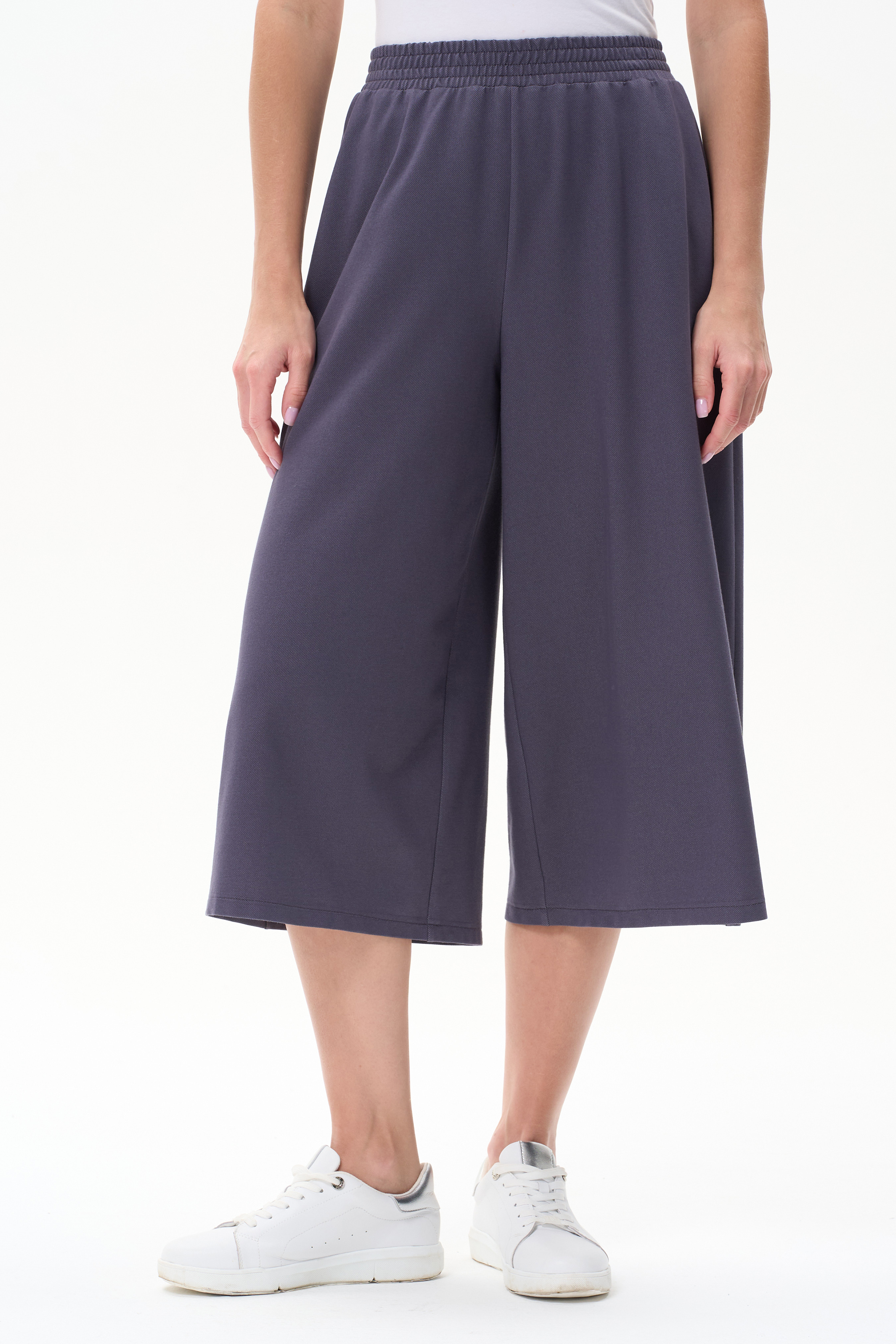 80% хлопок, 14% полиэстер, 6% эластан Модные брюки выполнены из тонкого джинскотта 165 гр в трендовом оттенке Утренний туман. Благодаря конструкции и объему модель выглядит как юбка. Длина изделия до середины икр, пояс с эластичной лентой внутри. Рост модели 175 см