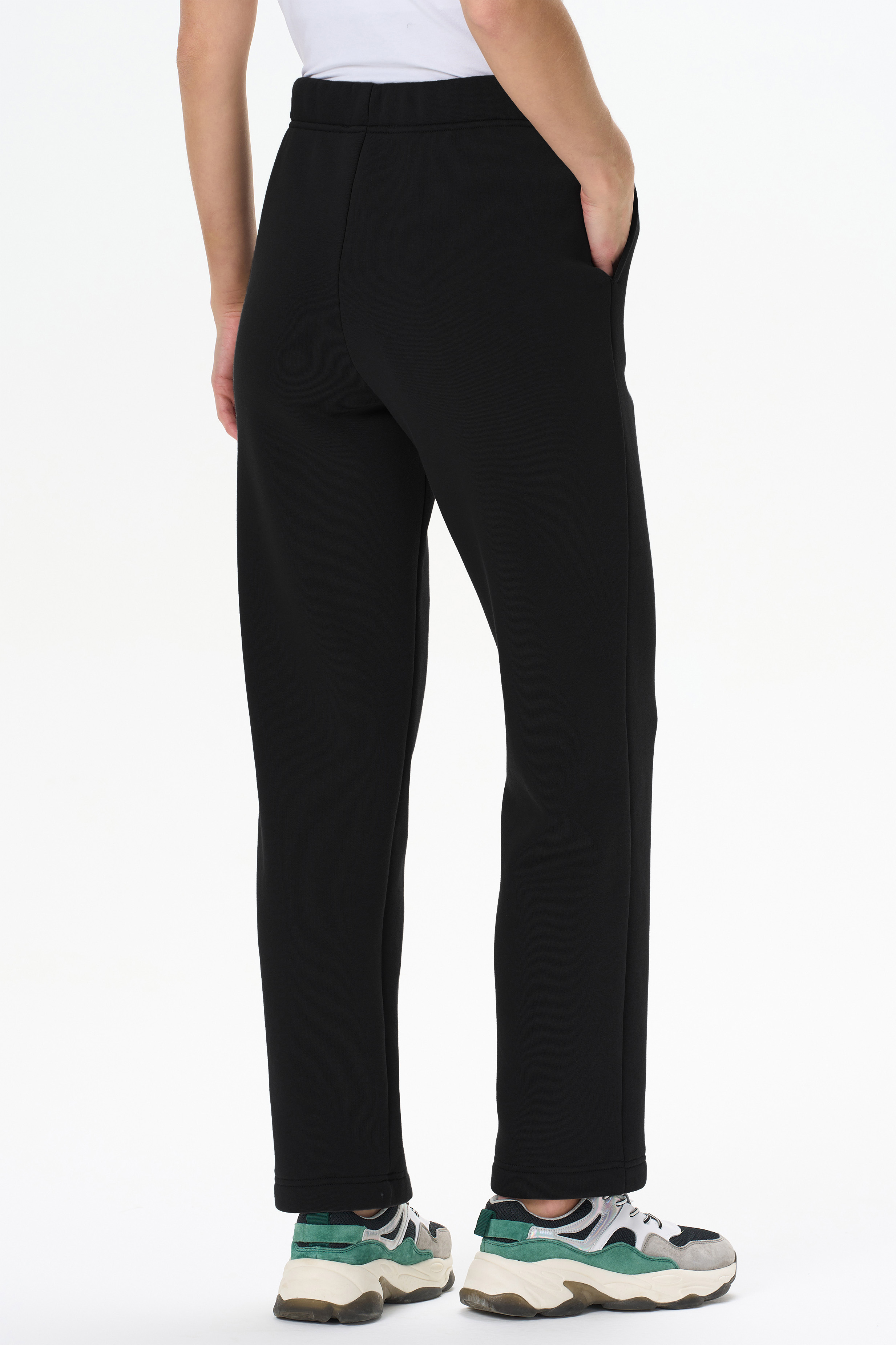 Стильные прямые брюки с карманами из хлопкового футера высокого качества 3-х нитки стриженный начес. Цельнокроеный пояс с эластичной лентой внутри. Длина брюк по боковом шву в 44 размере 107см. Рост модели на фото 177см.