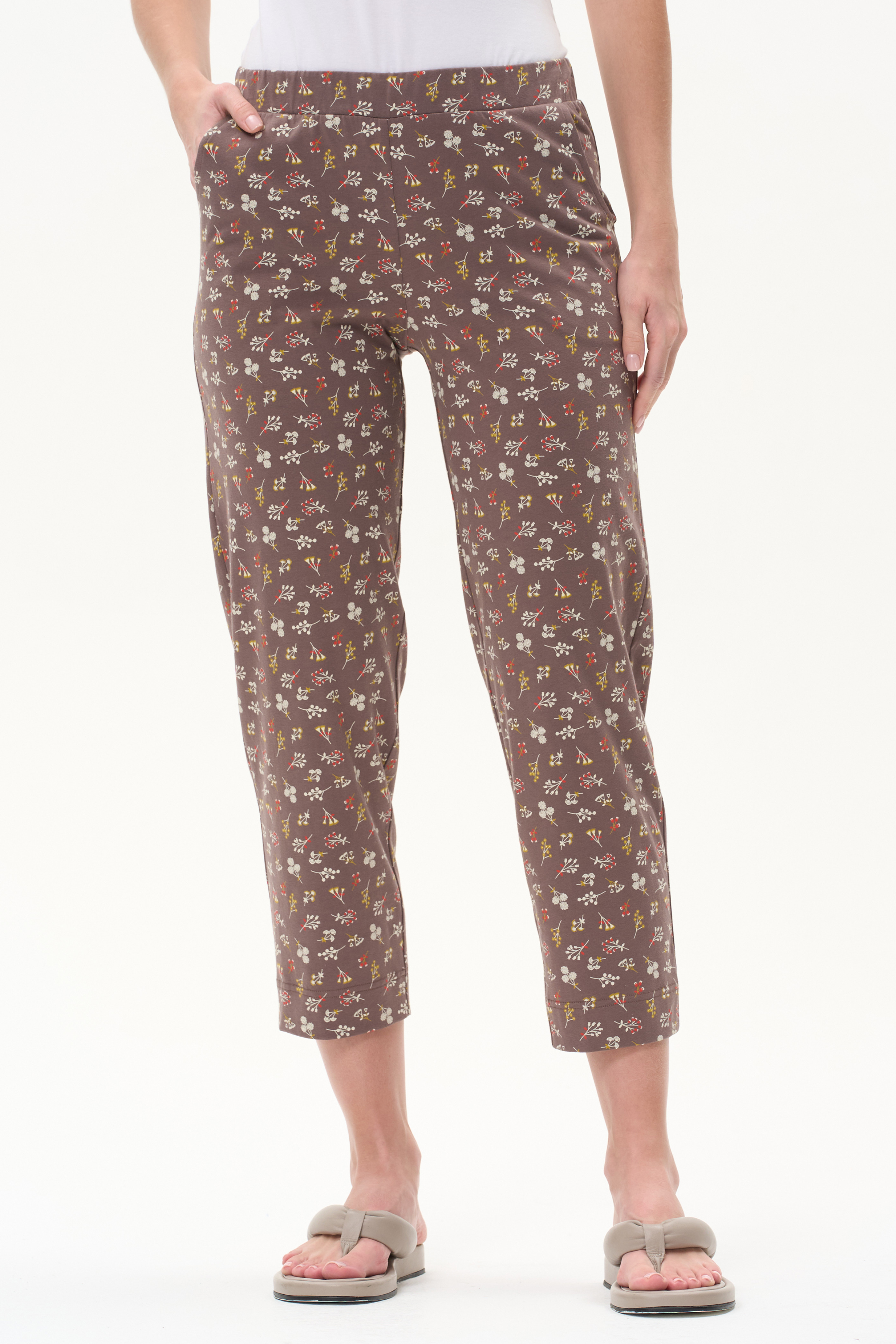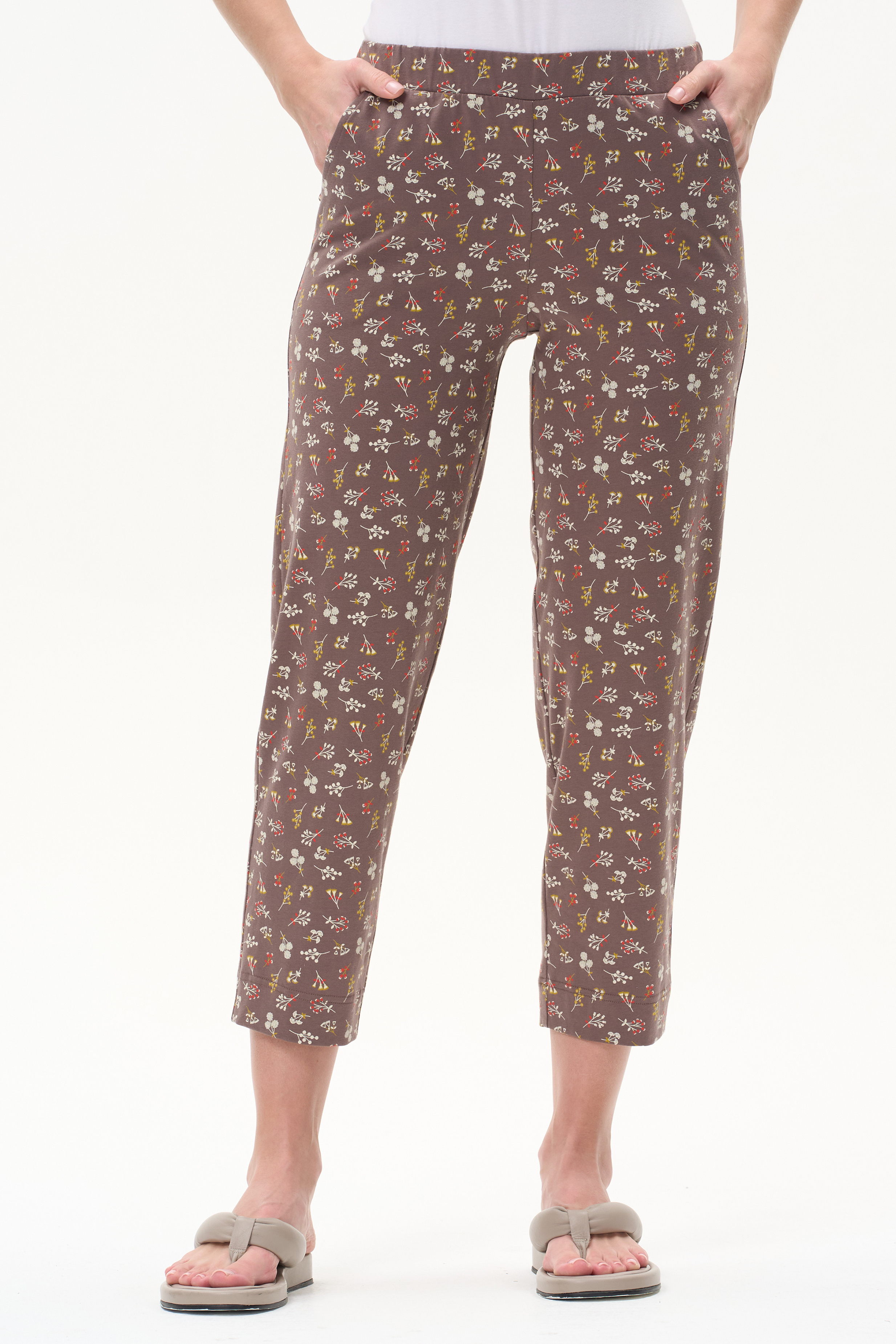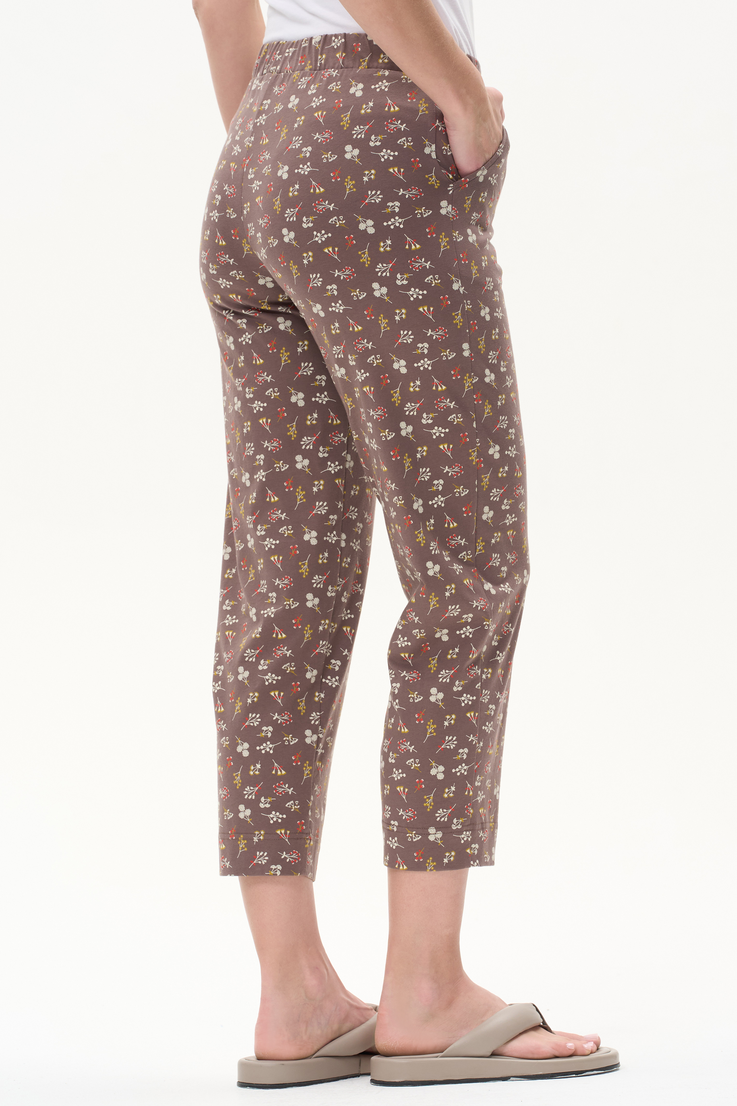 100% хлопок Универсальные брюки, длиной 7/8 из хлопкового полотна. Пояс с эластичной лентой, два фигурных боковых кармана. Рост модели 175 см.