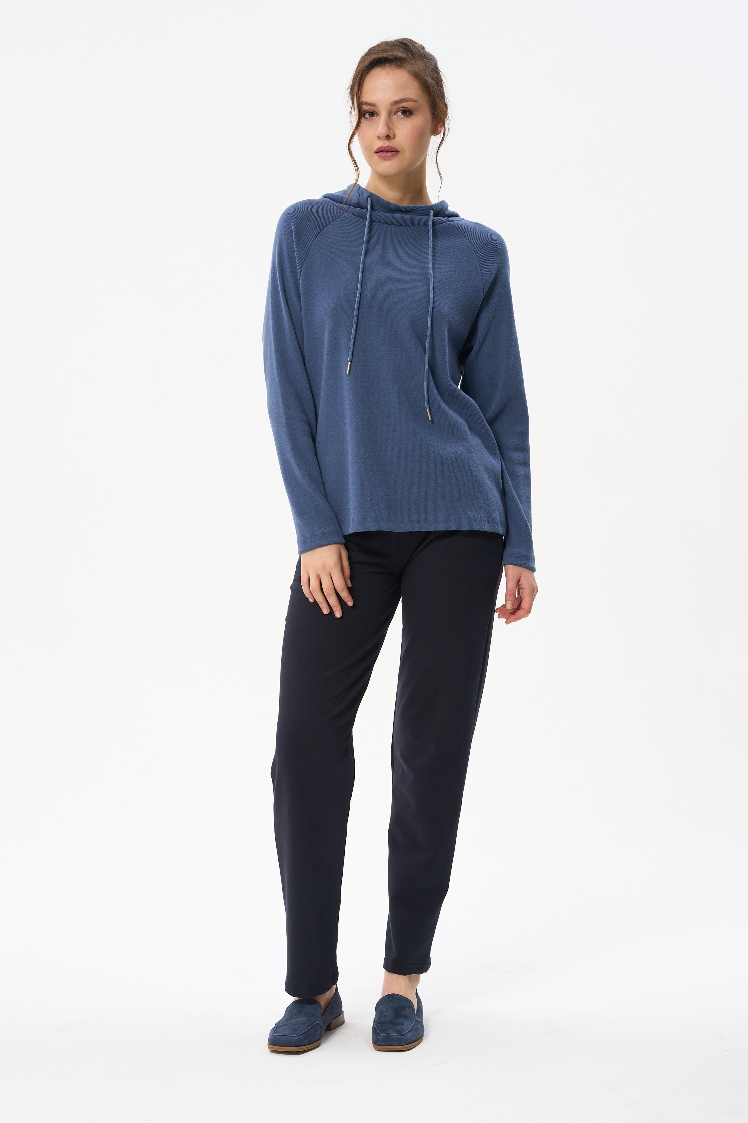 Повседневные, чуть зауженные, брюки с карманами из хлопкового футера. Пояс выполнен из кашкорсе с эластичной лентой. Фигурный вход в карман оформлен кашкорсе. Длина по боковому шву (без учета пояса) в 44 размере 100см. Рост модели на фото 177