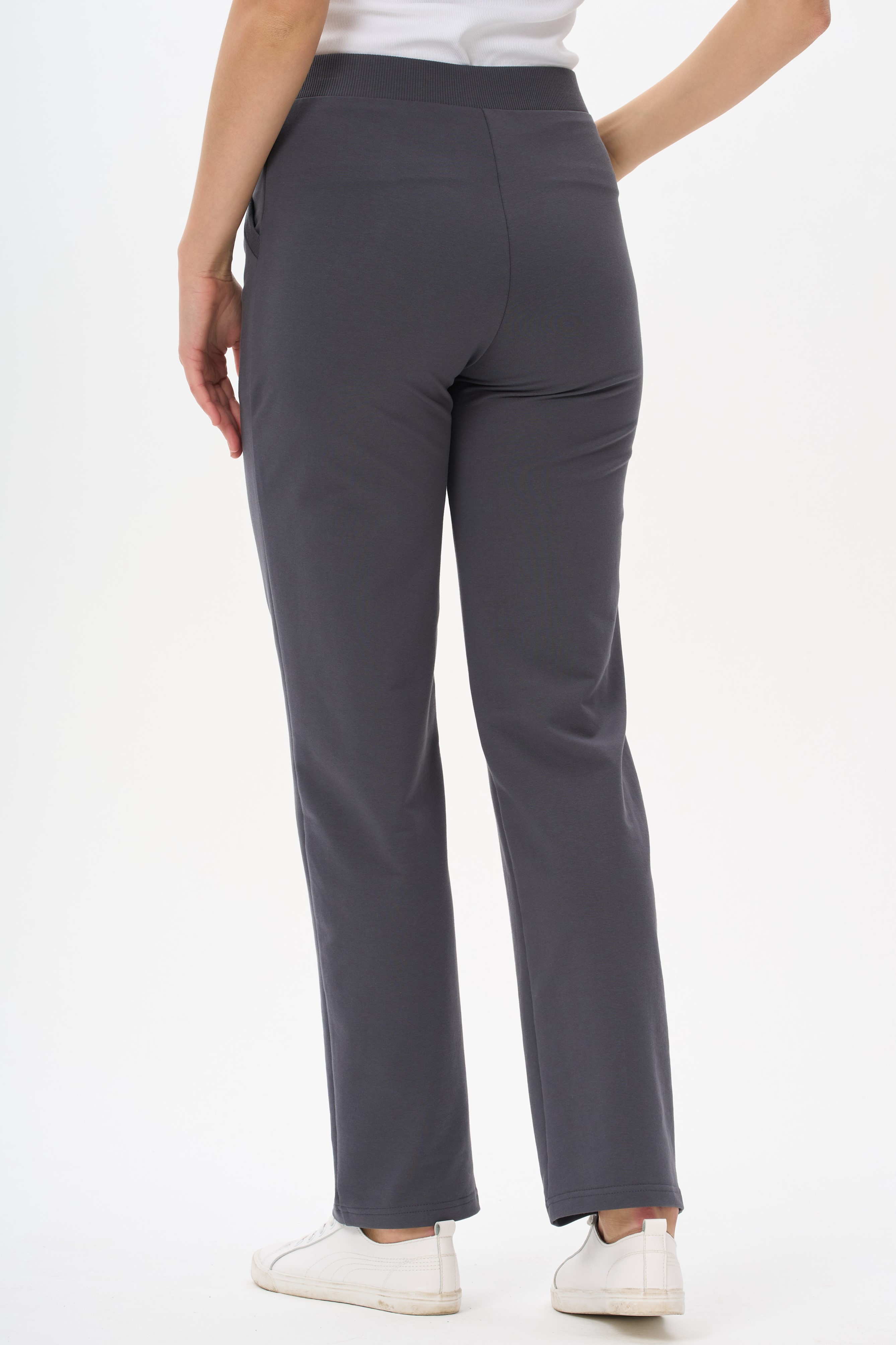 80% хлопок, 14% полиэстер, 6% эластан Повседневные, чуть зауженные, брюки с карманами из хлопкового футера. Пояс выполнен из кашкорсе с эластичной лентой. Фигурный вход в карман оформлен кашкорсе. Длина по боковому шву(без учета пояса) в 44 размере 100см. Рост модели на фото 177