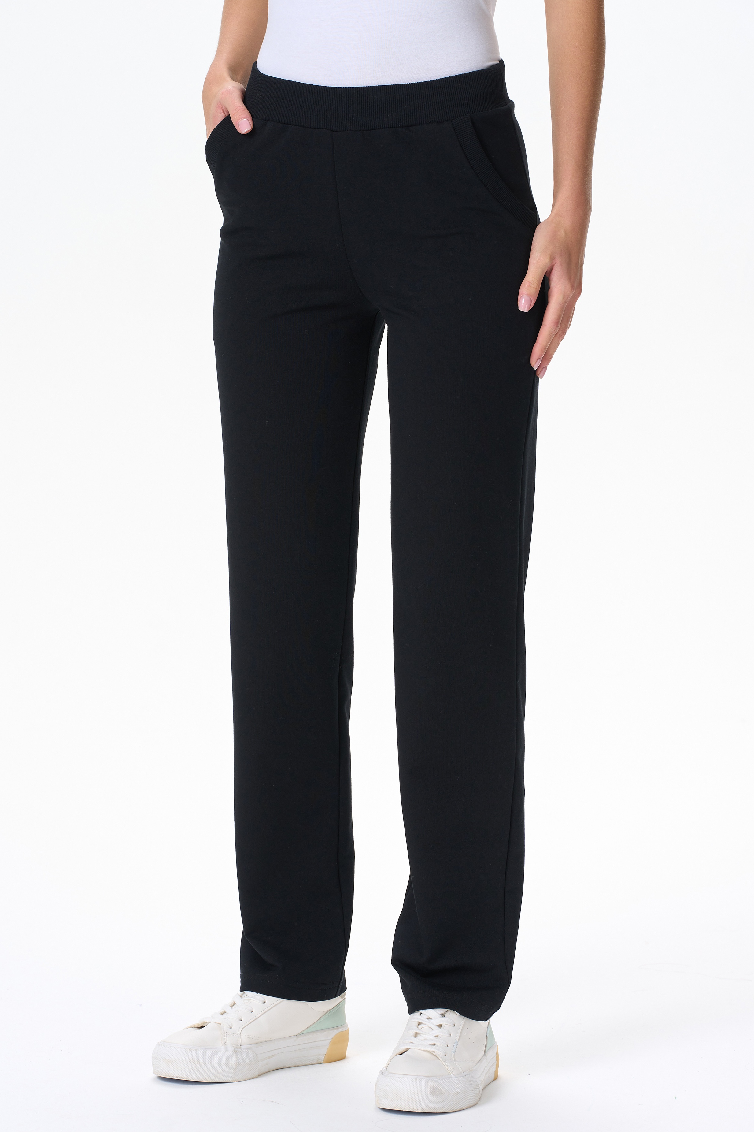 Повседневные, чуть зауженные, брюки с карманами из хлопкового футера. Пояс выполнен из кашкорсе с эластичной лентой. Фигурный вход в карман оформлен кашкорсе. Длина по боковому шву(без учета пояса) в 44 размере 100см. Рост модели на фото 175