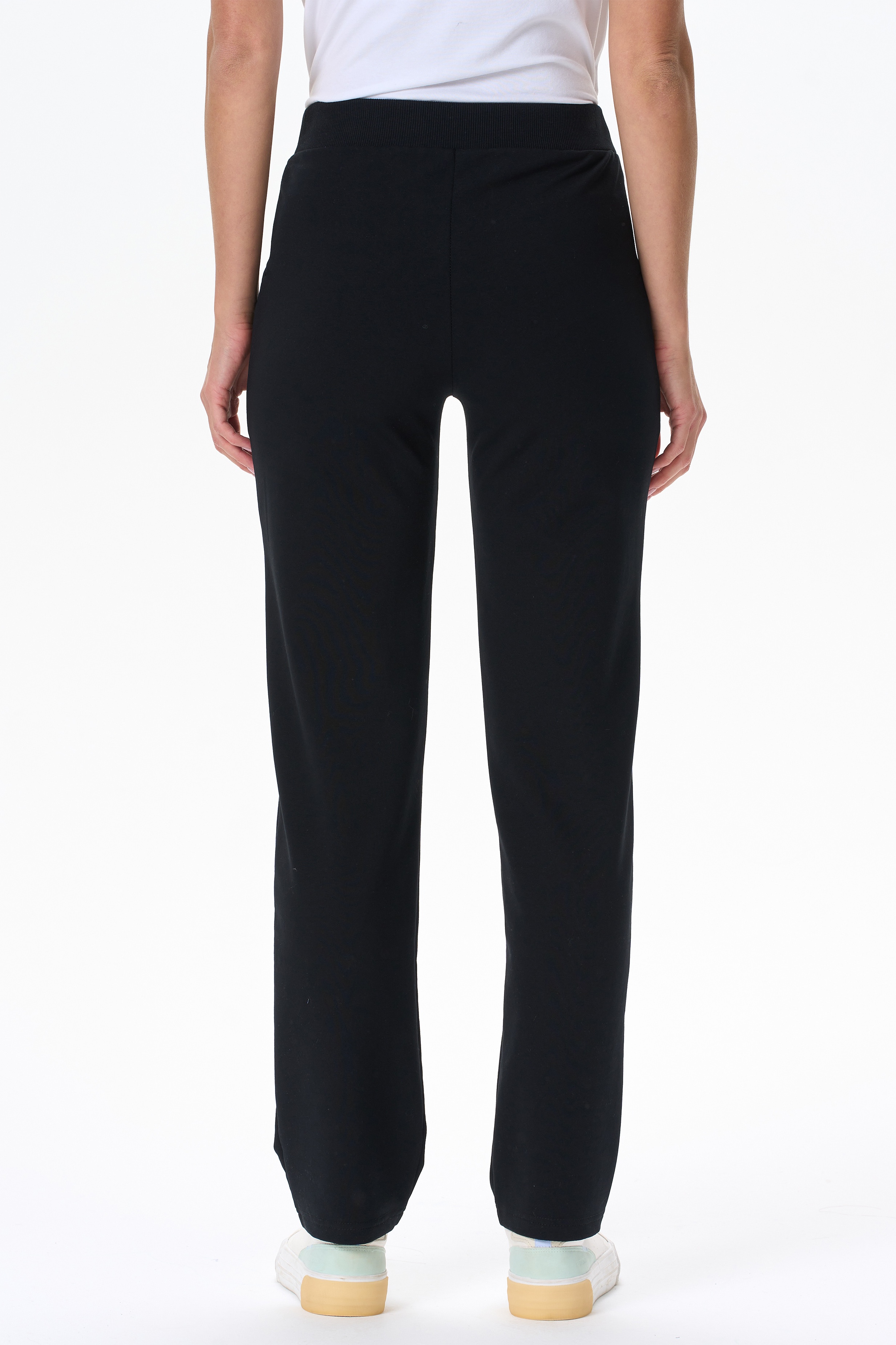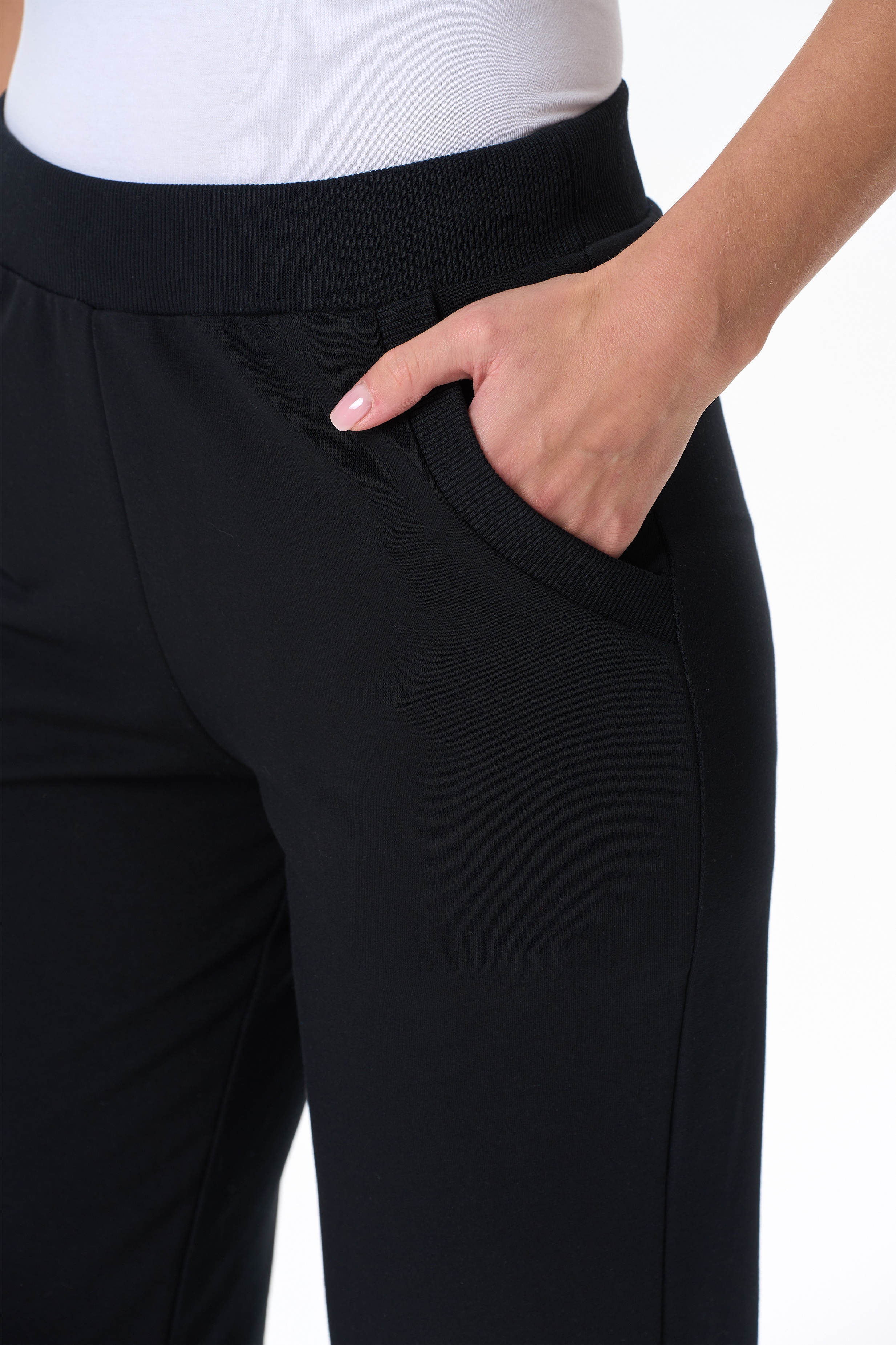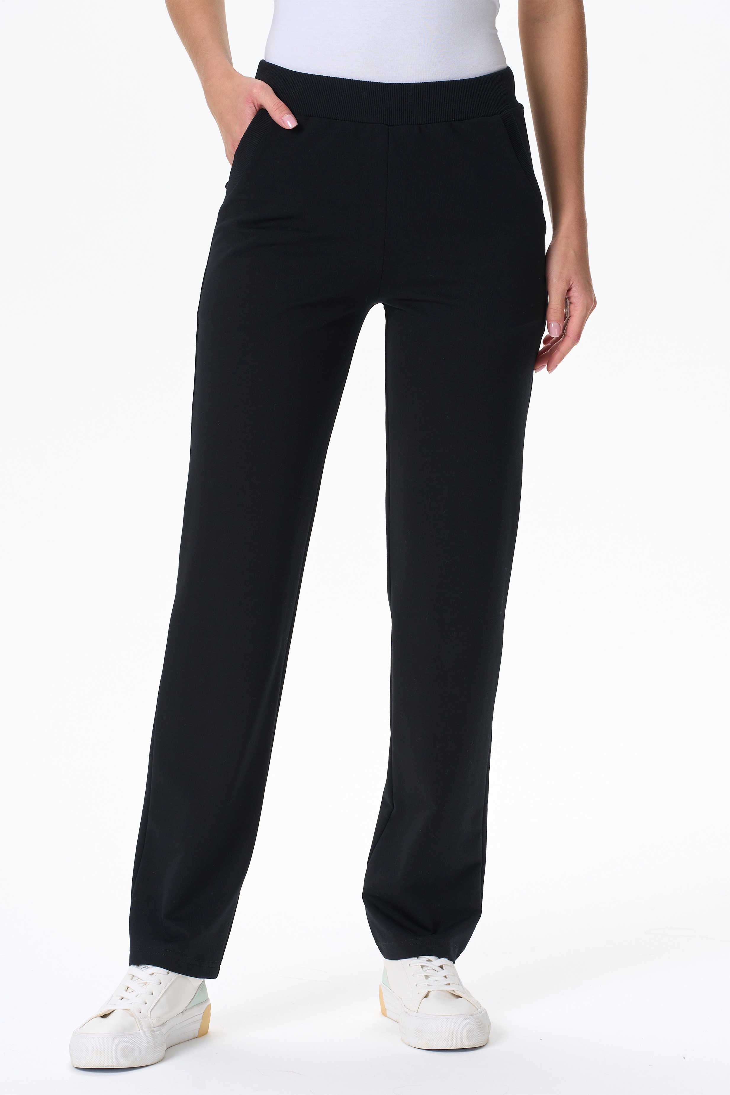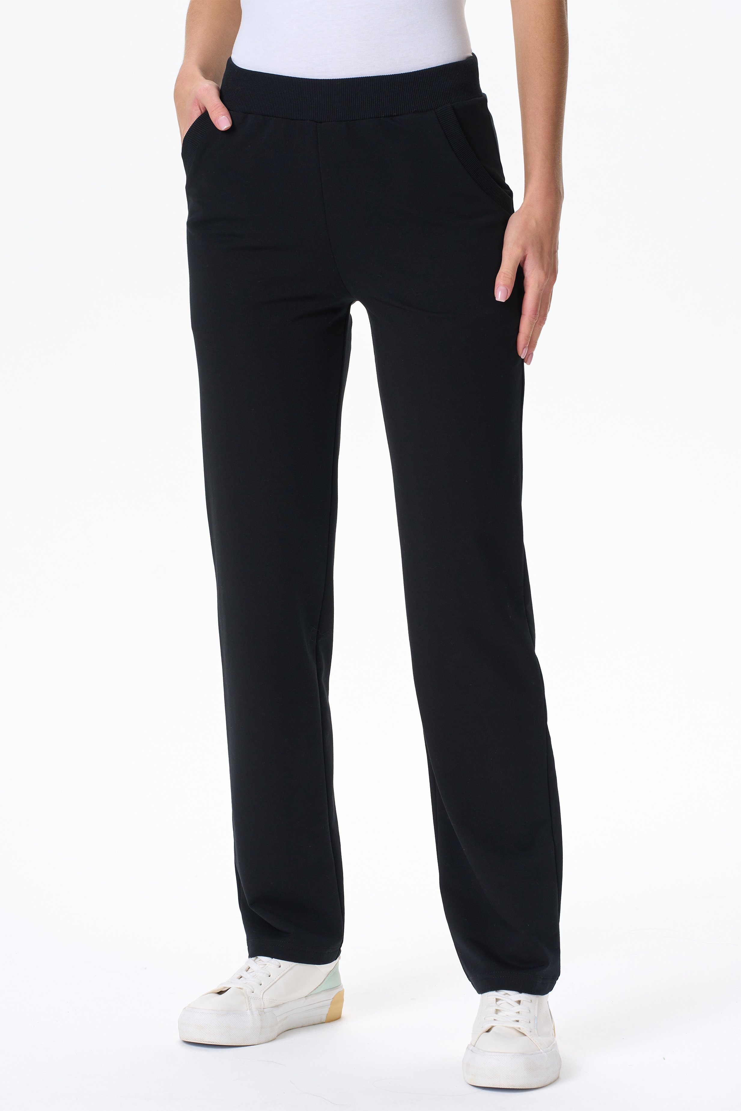 80% хлопок, 14% полиэстер, 6% эластан Повседневные, чуть зауженные, брюки с карманами из хлопкового футера. Пояс выполнен из кашкорсе с эластичной лентой. Фигурный вход в карман оформлен кашкорсе. Длина по боковому шву(без учета пояса) в 44 размере 100см. Рост модели на фото 175