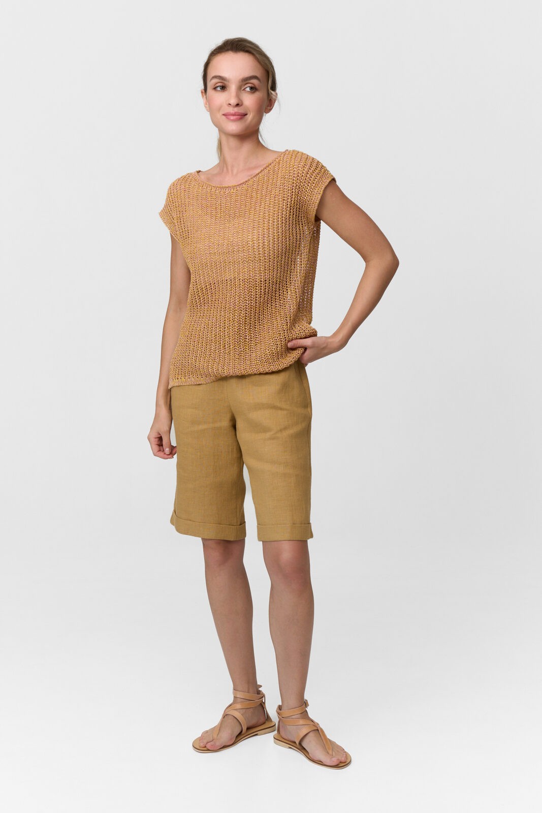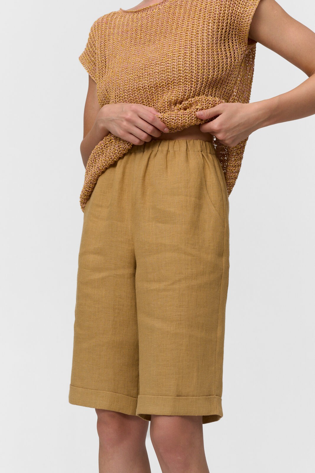 Шорты женские прямые, до колена. Карманы в отрезном бочке. Пояс цельнокроеный на резинке. По низу цельнокроеные манжеты.