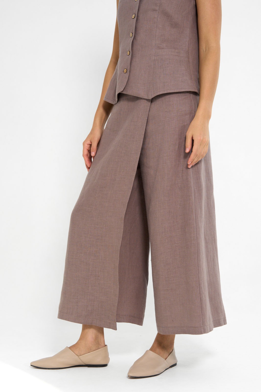 Юбка – брюки с запахом по переду и сзади. А-образного силуэта. Длина брюк 7/8. Застежка на потайную тесьму-молнию в левом боку. Пояс притачной с резинкой  по бокам.
