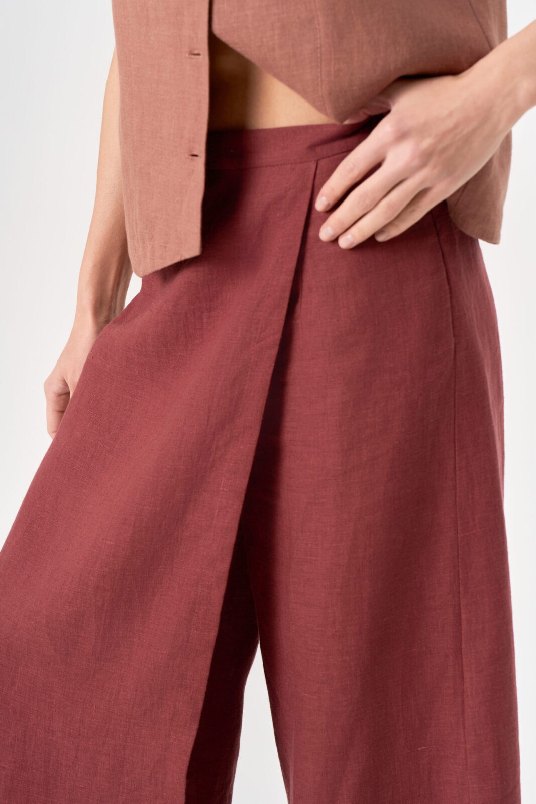 Юбка – брюки с запахом по переду и сзади. А-образного силуэта. Длина брюк 7/8. Застежка на потайную тесьму-молнию в левом боку. Пояс притачной с резинкой  по бокам.