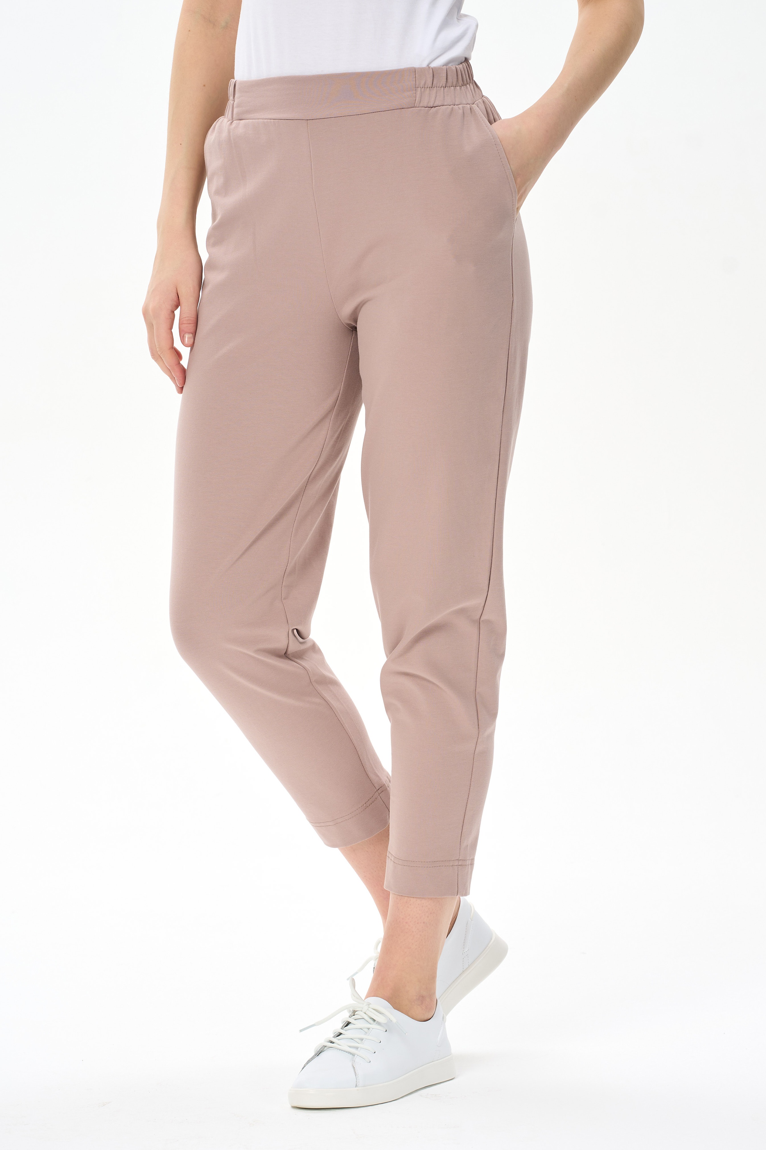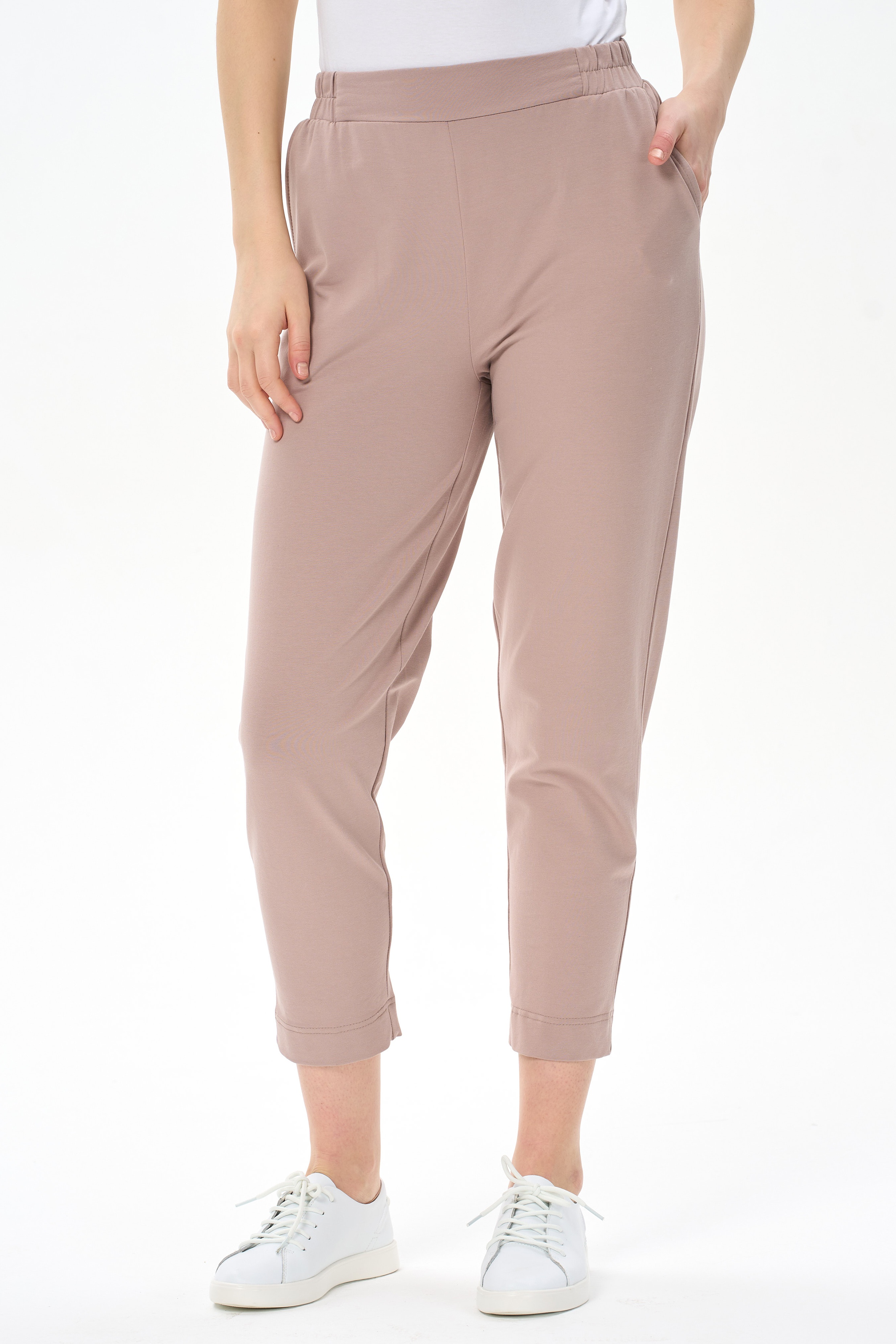 92% хлопок, 8% эластан Повседневные брюки-бананы из хлопкового футера 2х нитки (без начеса). Модель с карманами. Пояс с планкой и эластичной лентой внутри. Длина брюк регулируется отворотами. Рост модели 175см.