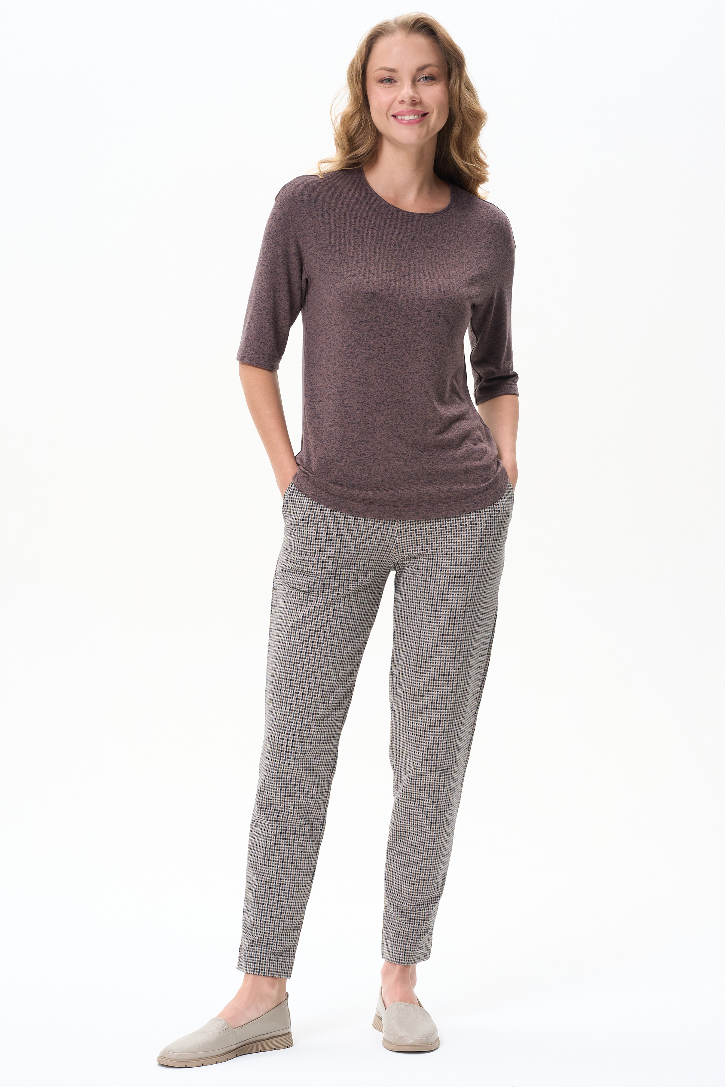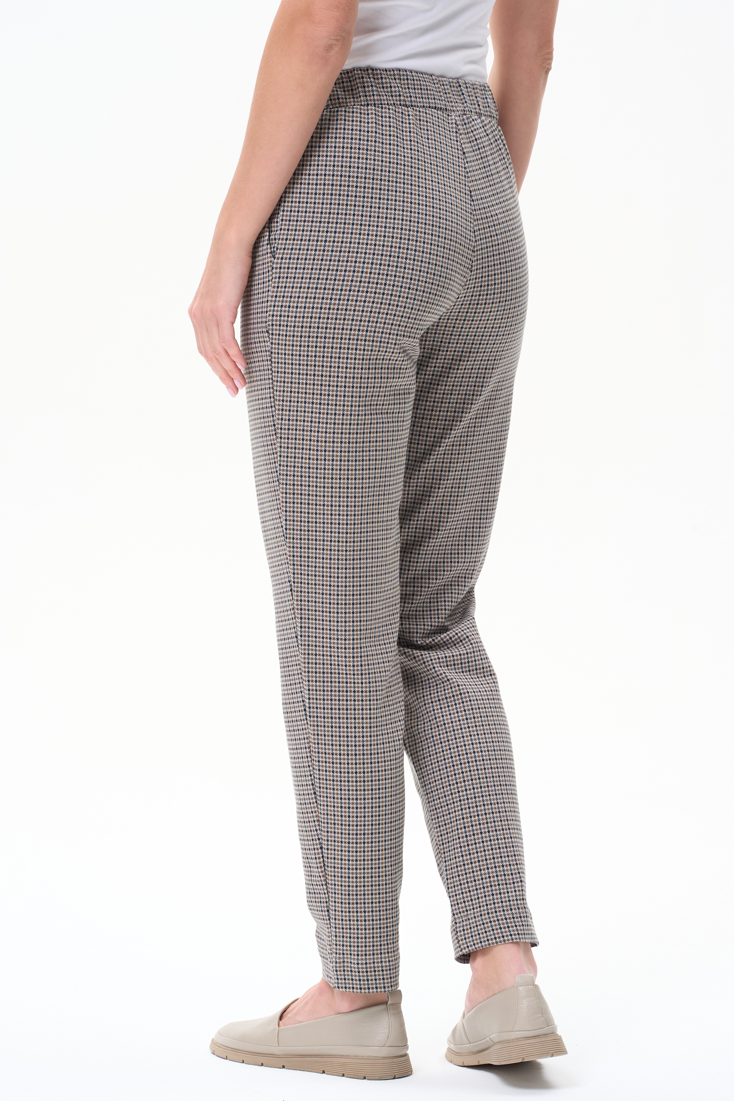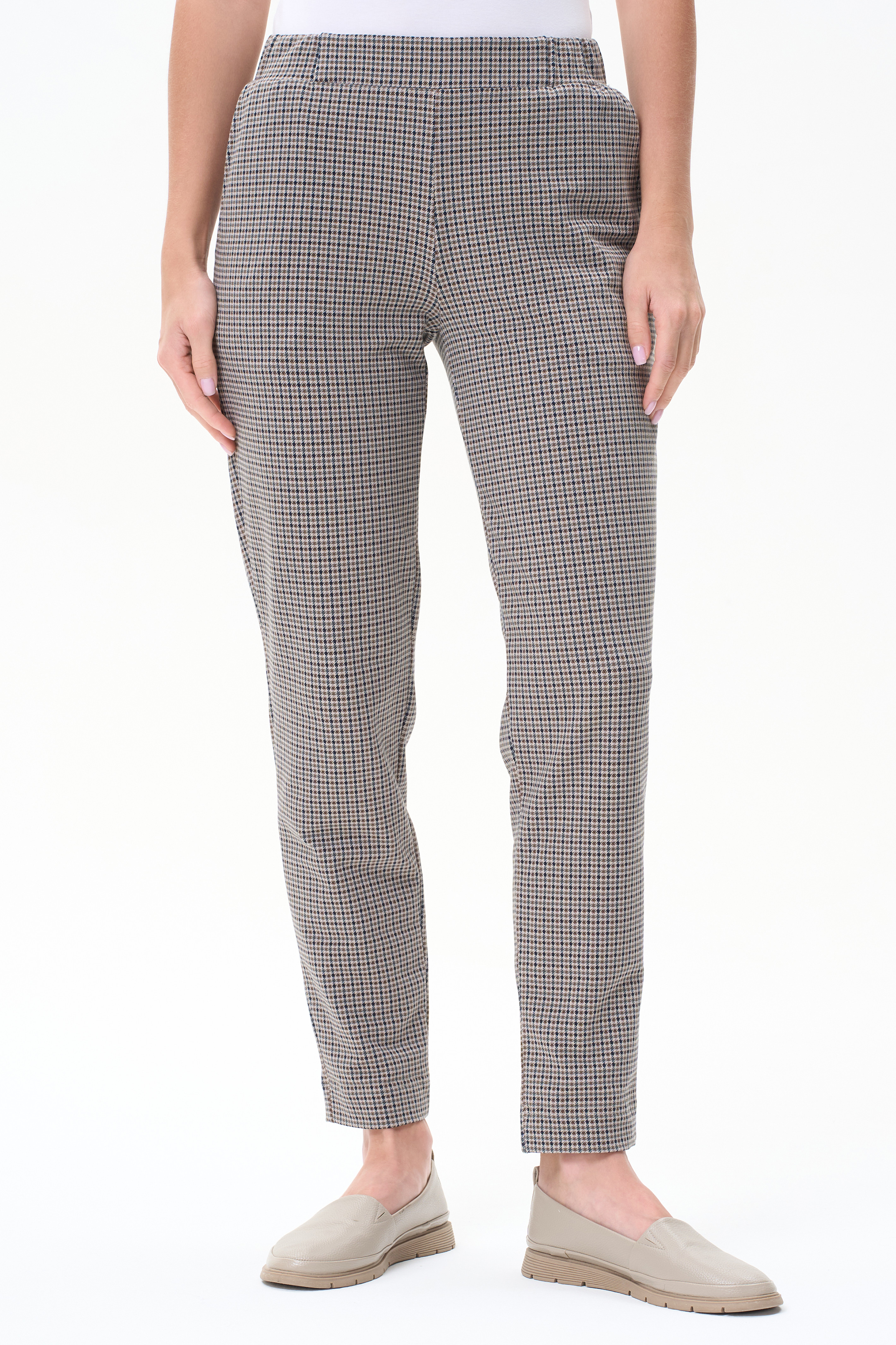 92% хлопок, 8% эластан Укороченные чуть зауженные брюки из тонкого футера 240 гр мелкая клетка в бежево-кормчневых оттенках. Модель с классическими карманами, пояс с планкой и эластичной лентой внутри. Комфортная, универсальная модель для городских образов, отдыха и прогулок. Рост модели 175 см