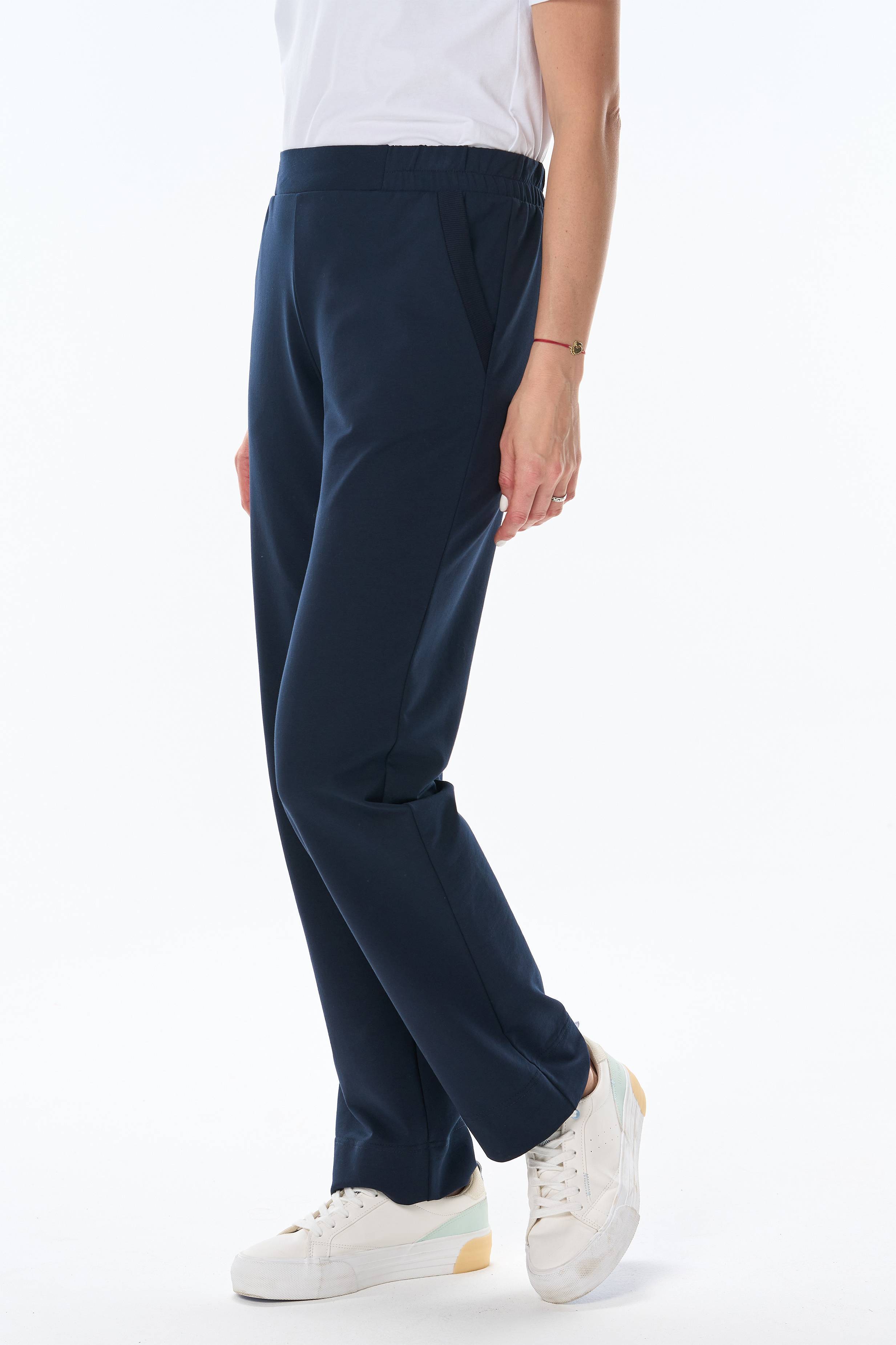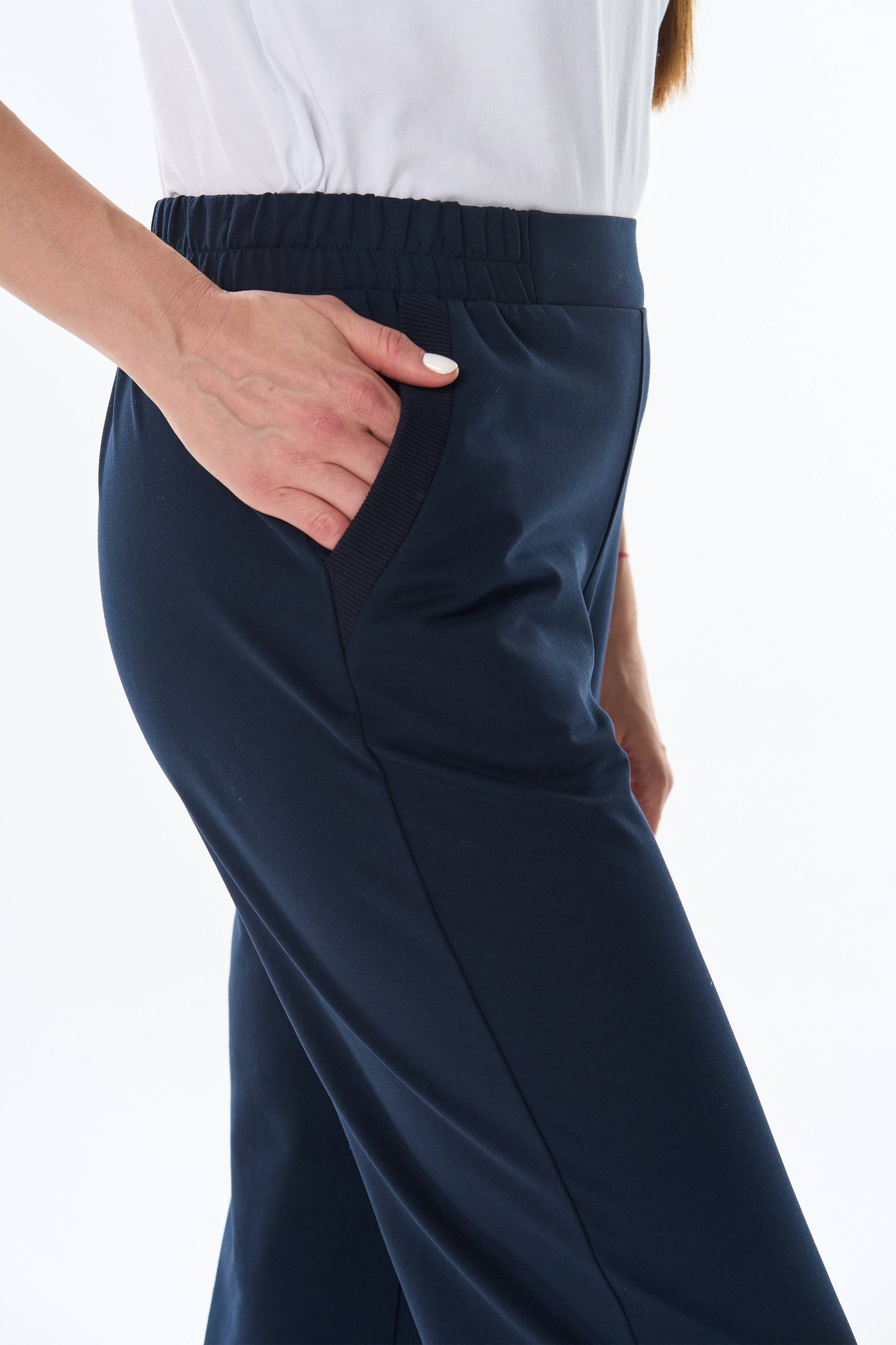 Повседневные, прямые брюки с карманами из хлопкового футера. Пояс с планкой и эластичной лентой внутри. Фигурный вход в карман оформлен кашкорсе. Длина брюк по боковому шву (без пояса) в 44 размере - 100см. Рост модели на фото 170