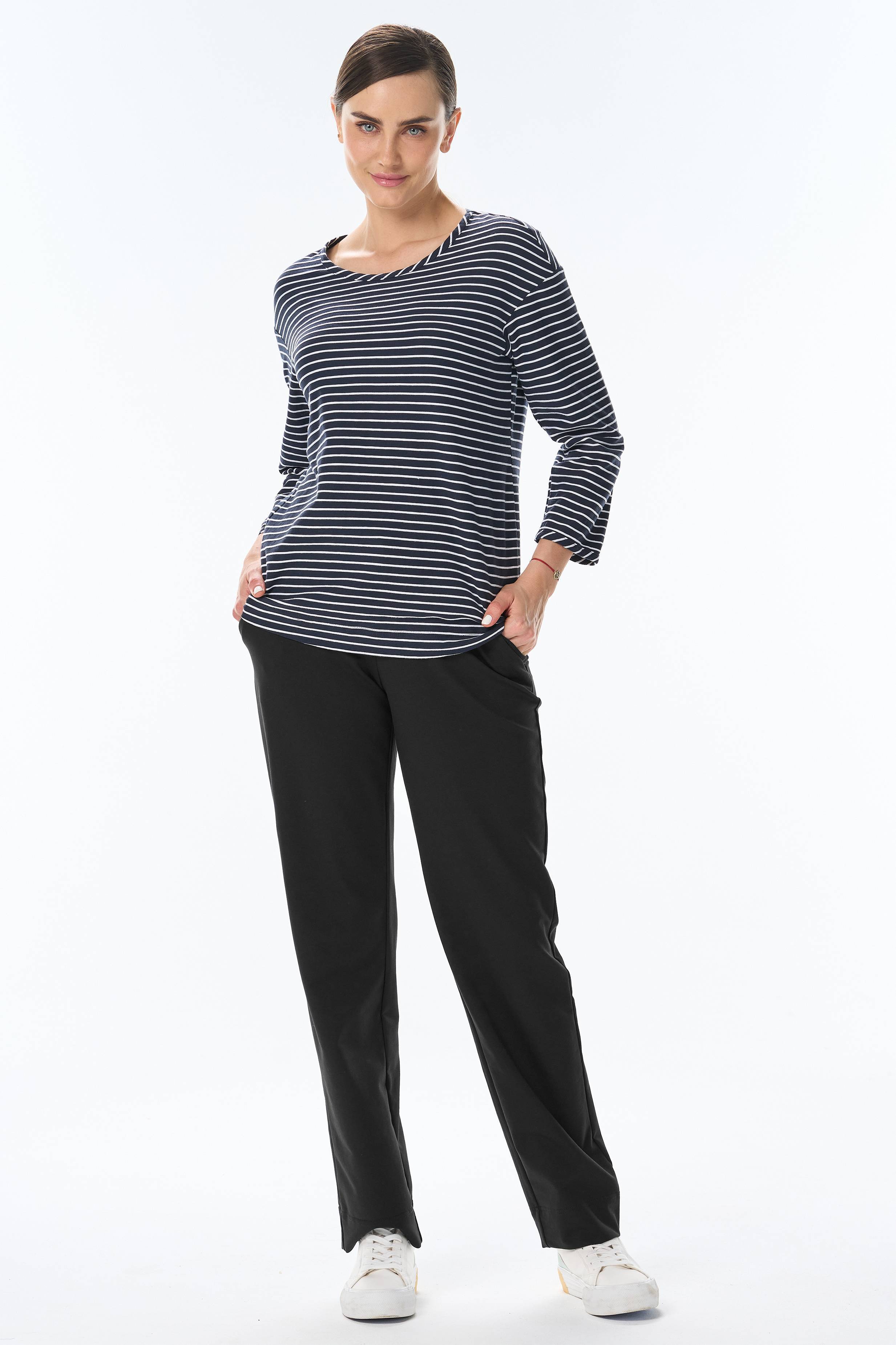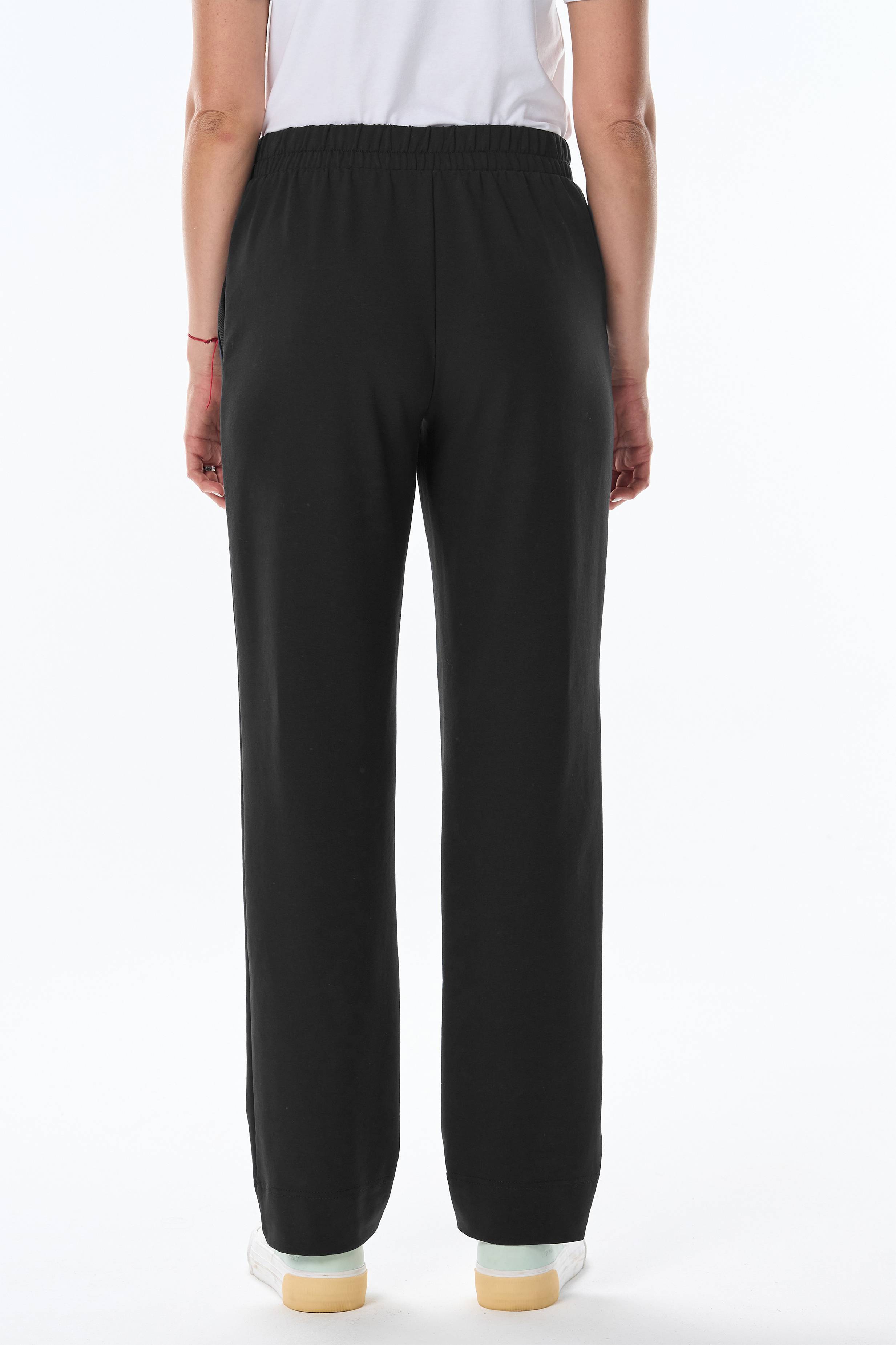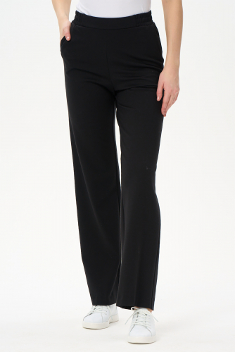 Повседневные, прямые, брюки с карманами из хлопкового футера. Пояс с планкой и эластичной лентой внутри. Фигурный вход в карман оформлен кашкорсе. Длина брюк по боковому шву (без пояса) в 44 размере 100см. Рост модели на фото 177