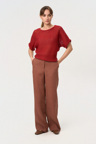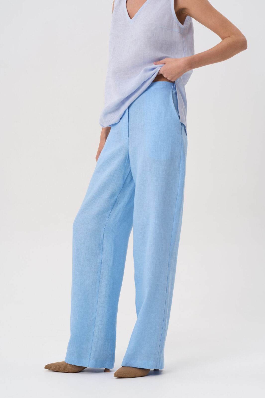 Брюки женские прямые. Пояс притачной с резинкой. Застежка гульфик на молнии. Боковые карманы в отрезном бочке.