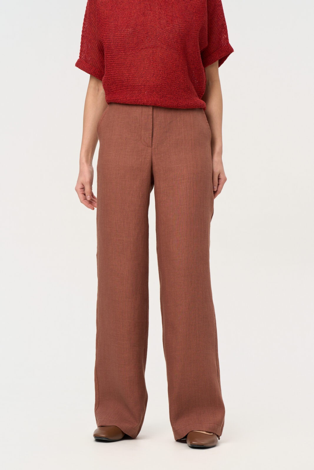 Брюки женские прямые. Пояс притачной с резинкой. Застежка гульфик на молнии. Боковые карманы в отрезном бочке.