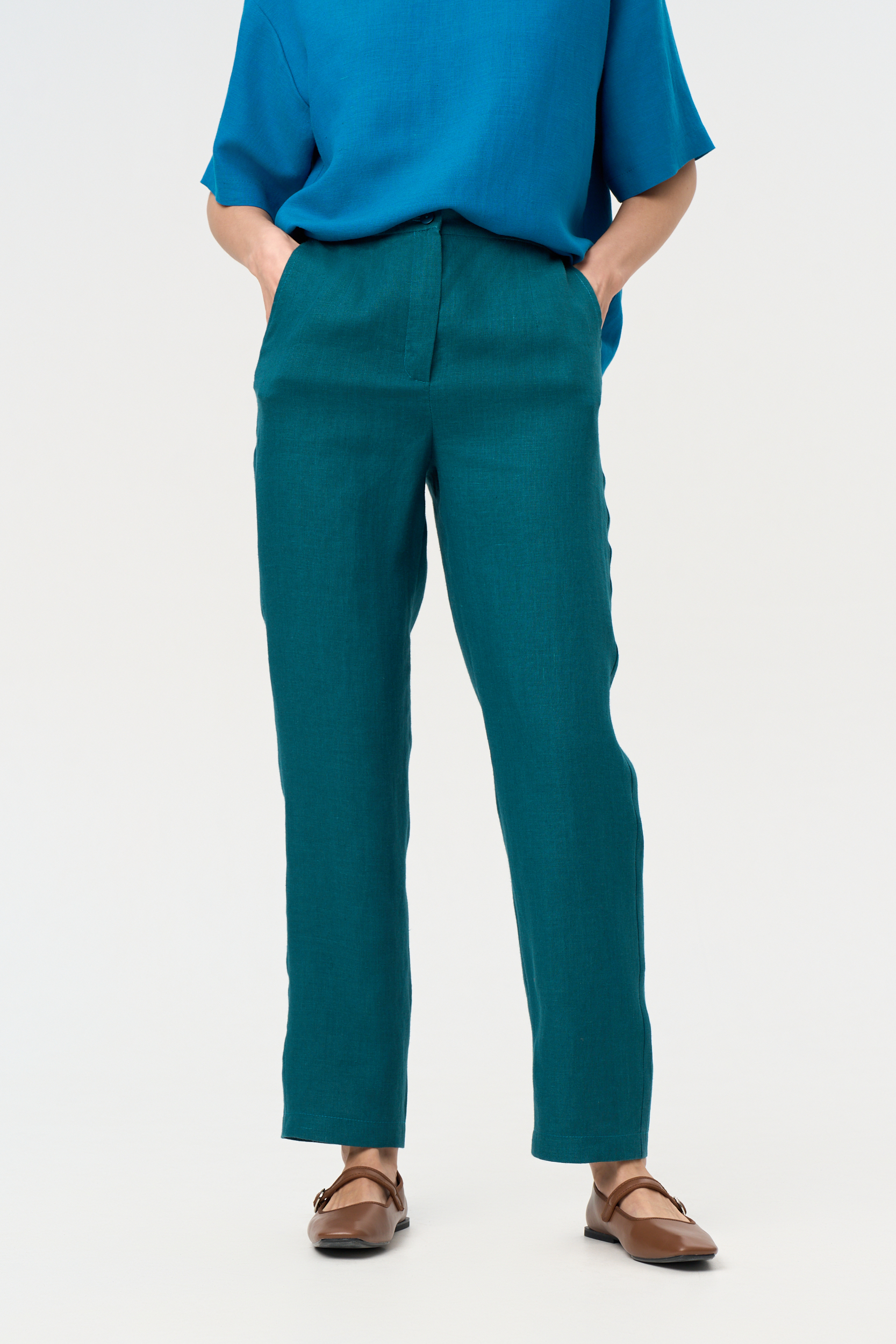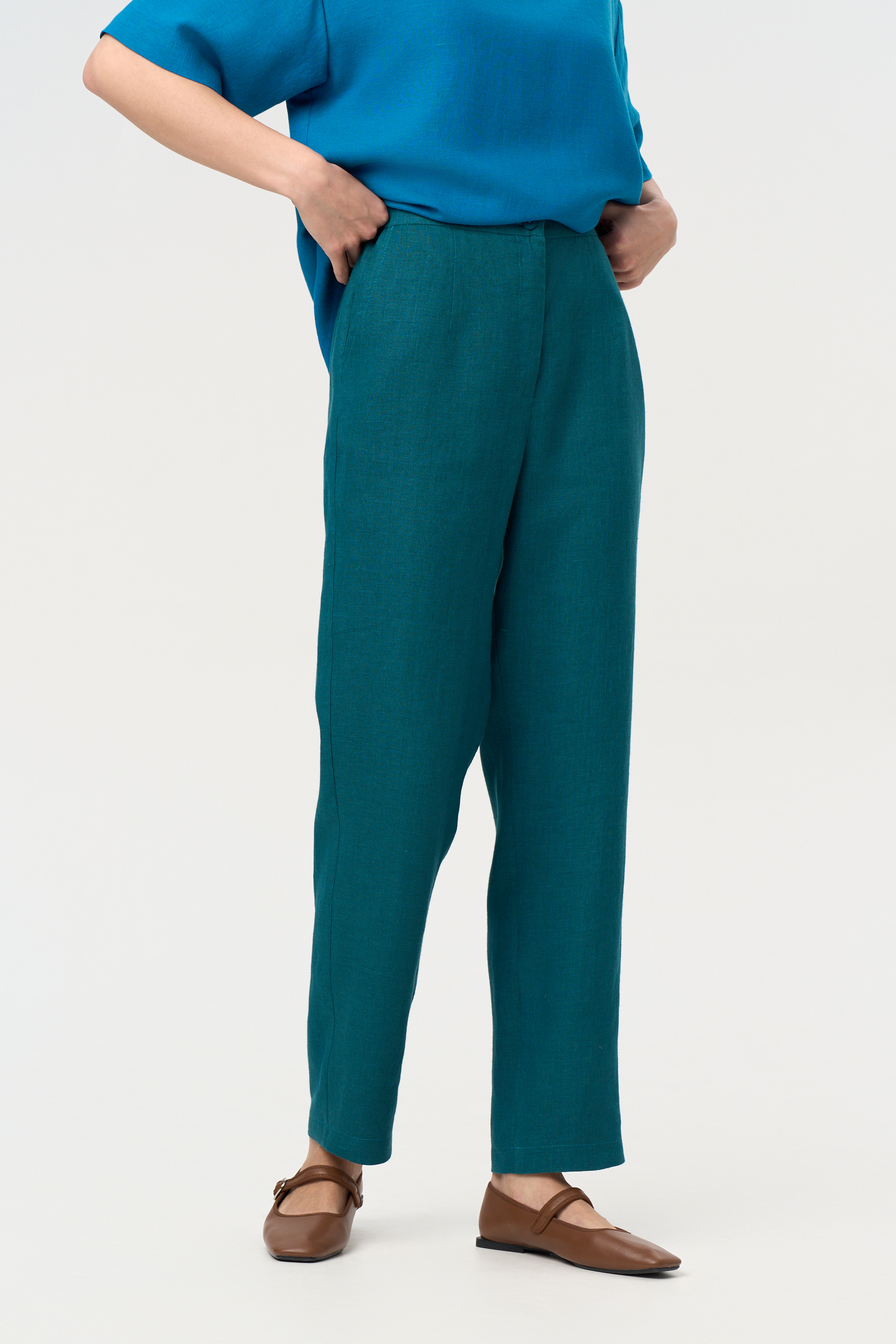 Брюки женские зауженные к низу. Пояс притачной с резинкой по бокам. Застежка гульфик на молнии. Карманы в отрезном бочке.