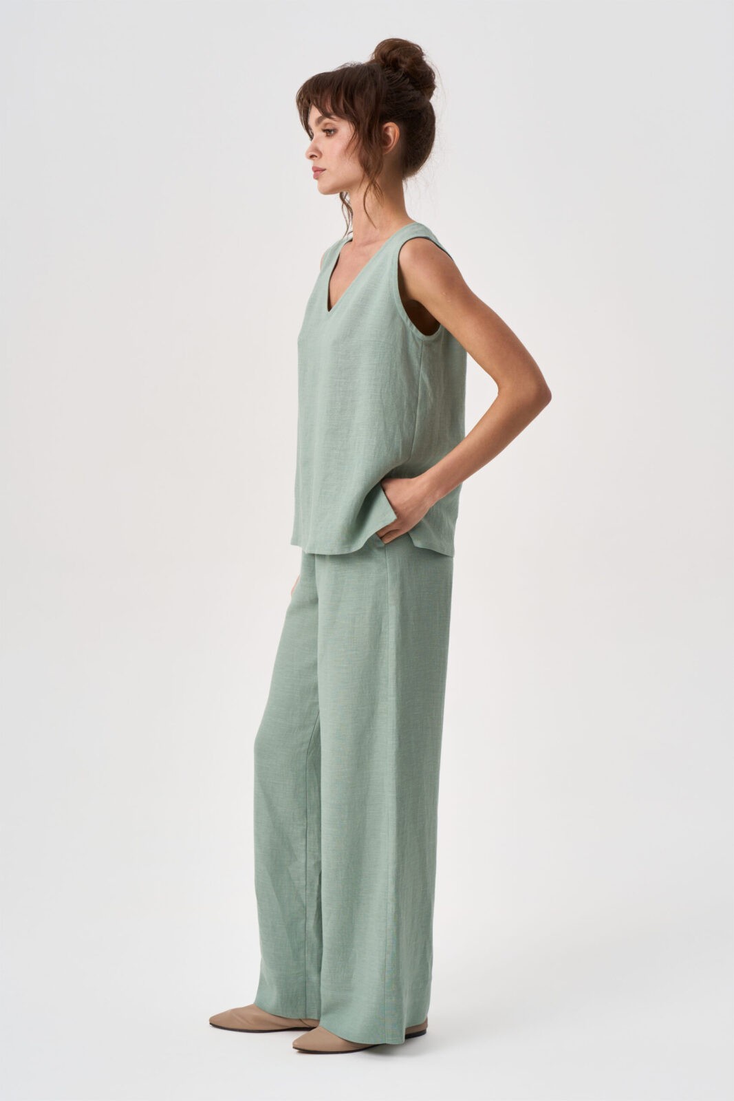 Брюки женские свободные расширенные к низу с широким цельнокроеным поясом на резинке. Карманы настрочные в отрезном бочке.