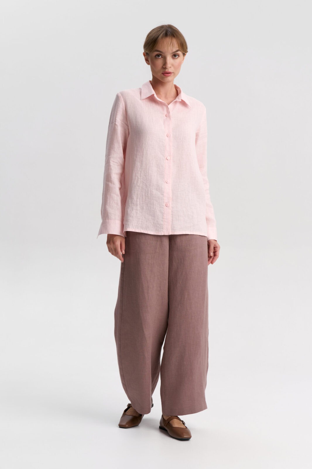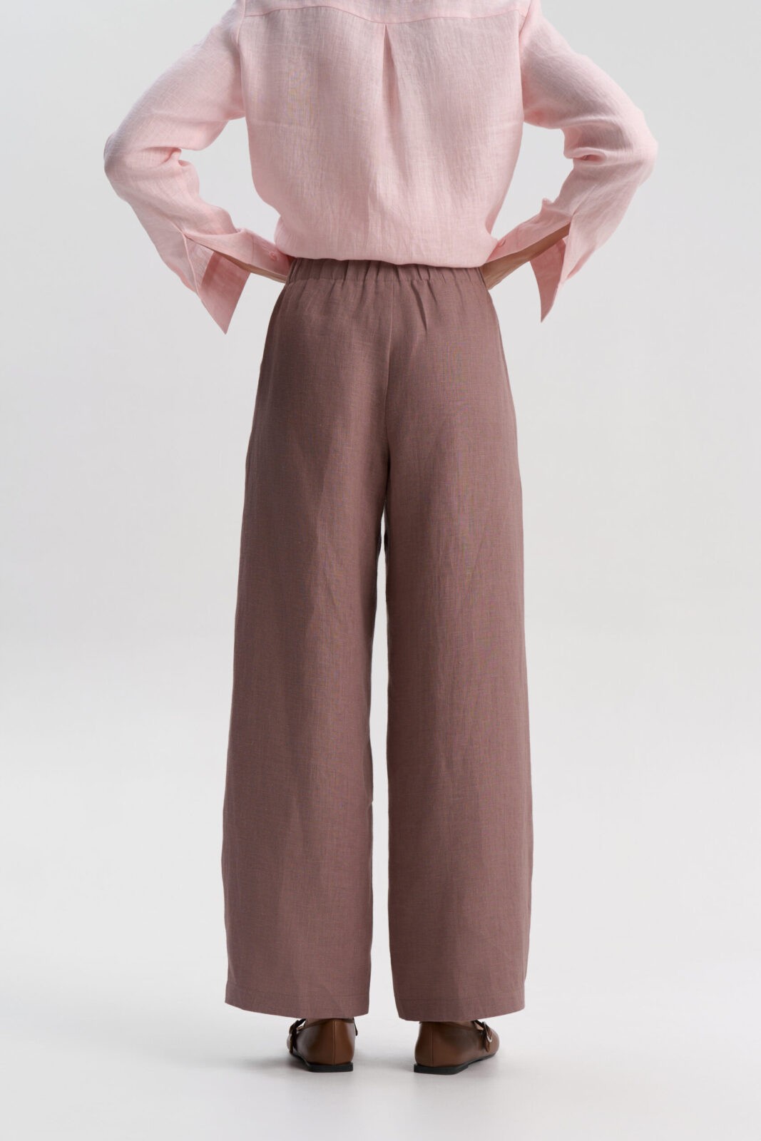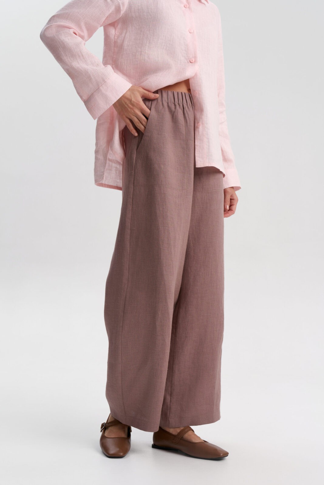 Брюки женские свободные, с небольшим заужением к низу. Пояс цельнокроеный на широкой резинке. Карманы настрочные в отрезном бочке.