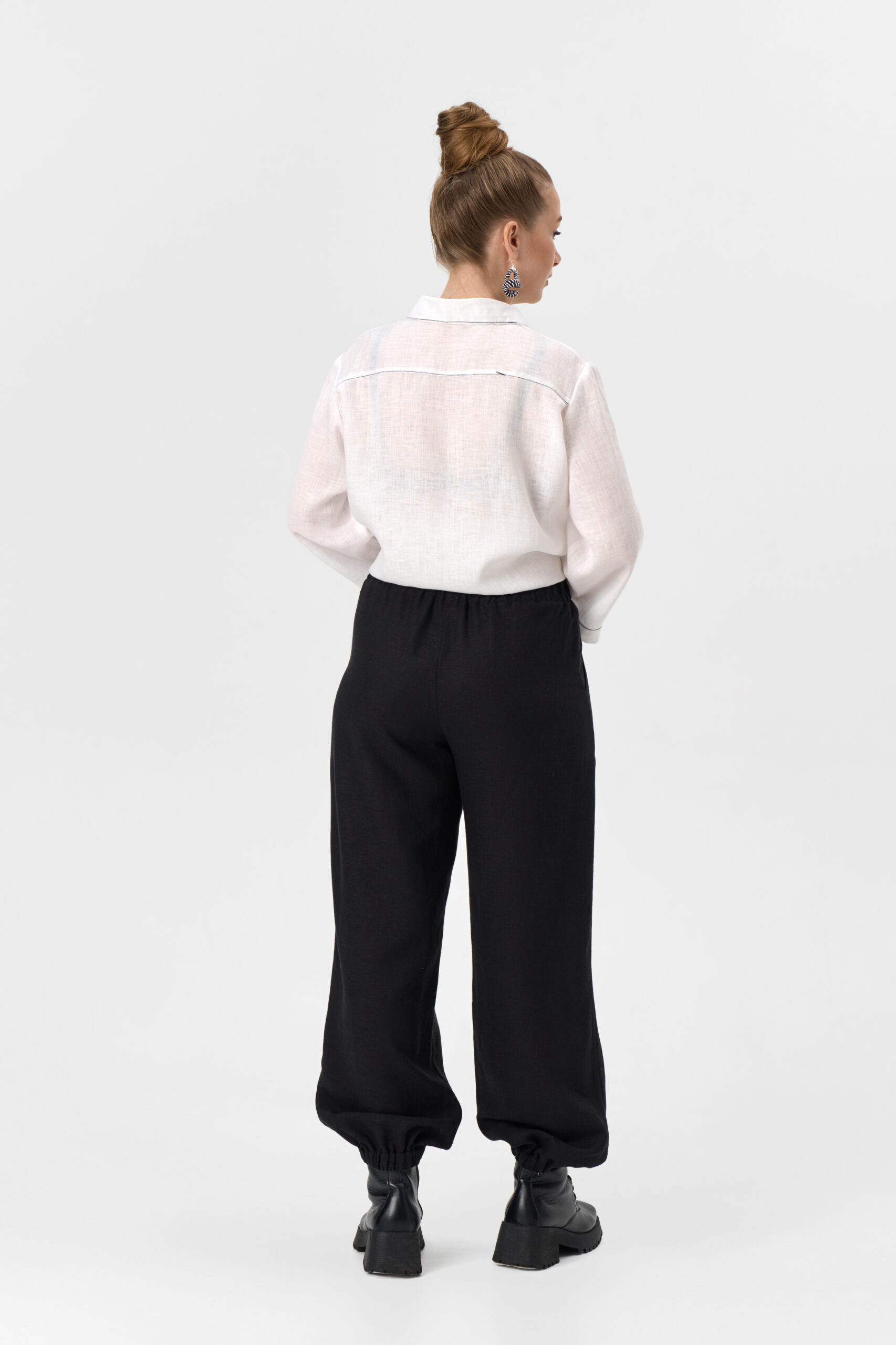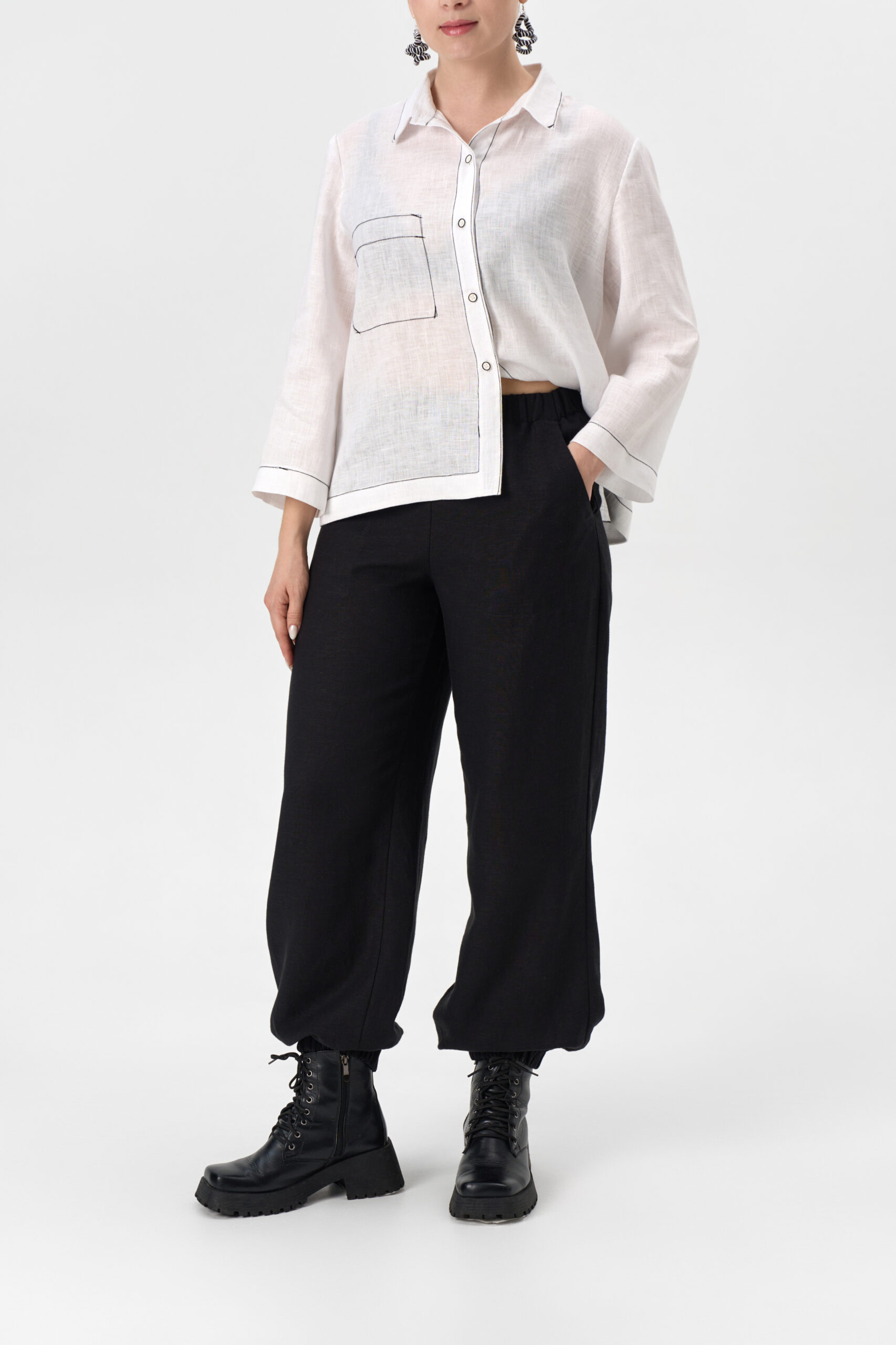 Брюки женские свободные в спортивном стиле с широким цельнокроеным поясом и манжетами на резинке. Карманы настрочные в отрезном бочке.