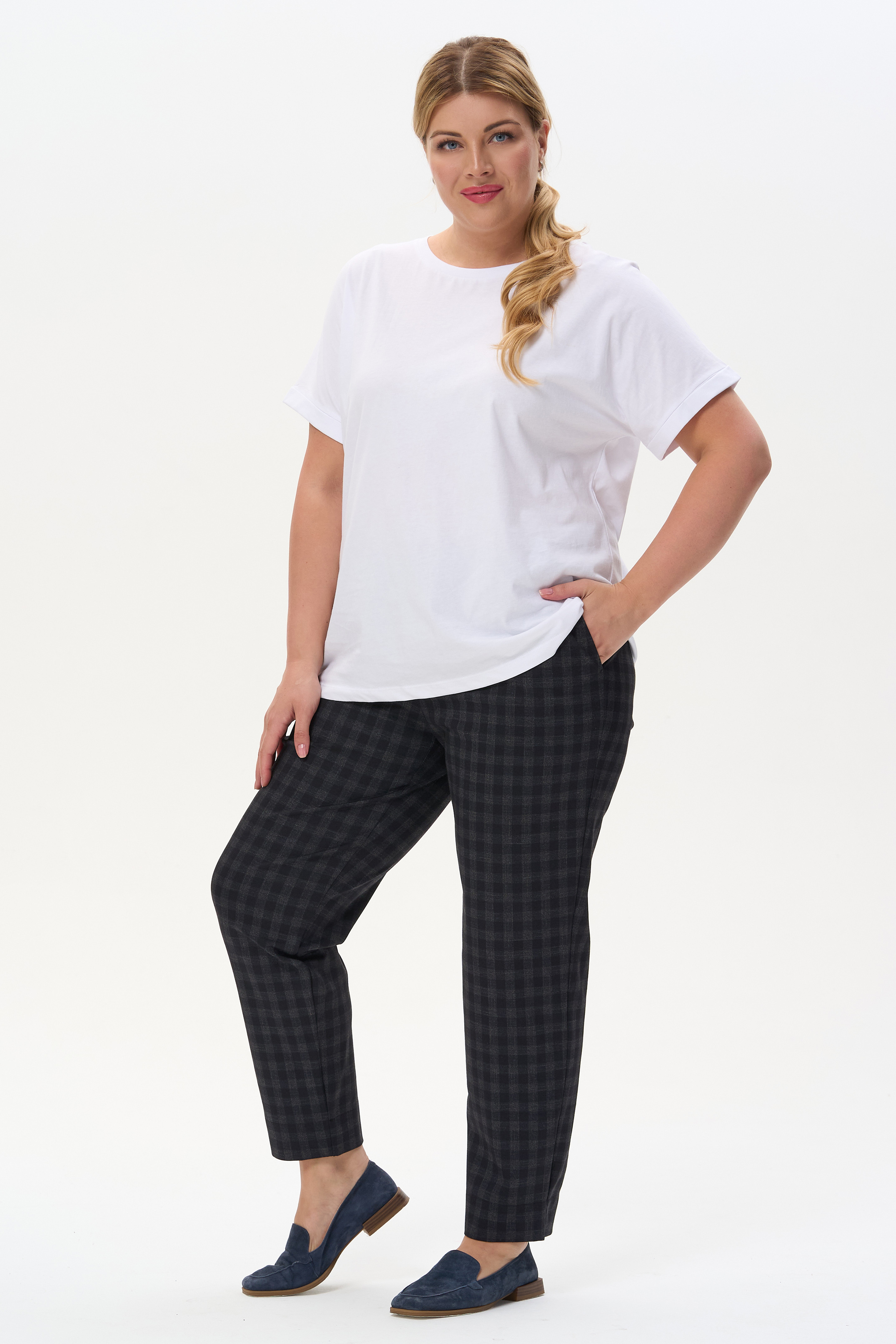 Укороченные, зауженные к низу брюки. Выполнены из вискозного трикотажного полотна. Пояс с эластичной лентой внутри. Спереди два фигурных кармана, по низу боковых швов разрезы. Длина по боковому шву (без пояса) в 44 размере 94 см. Рост модели на фото 178см.