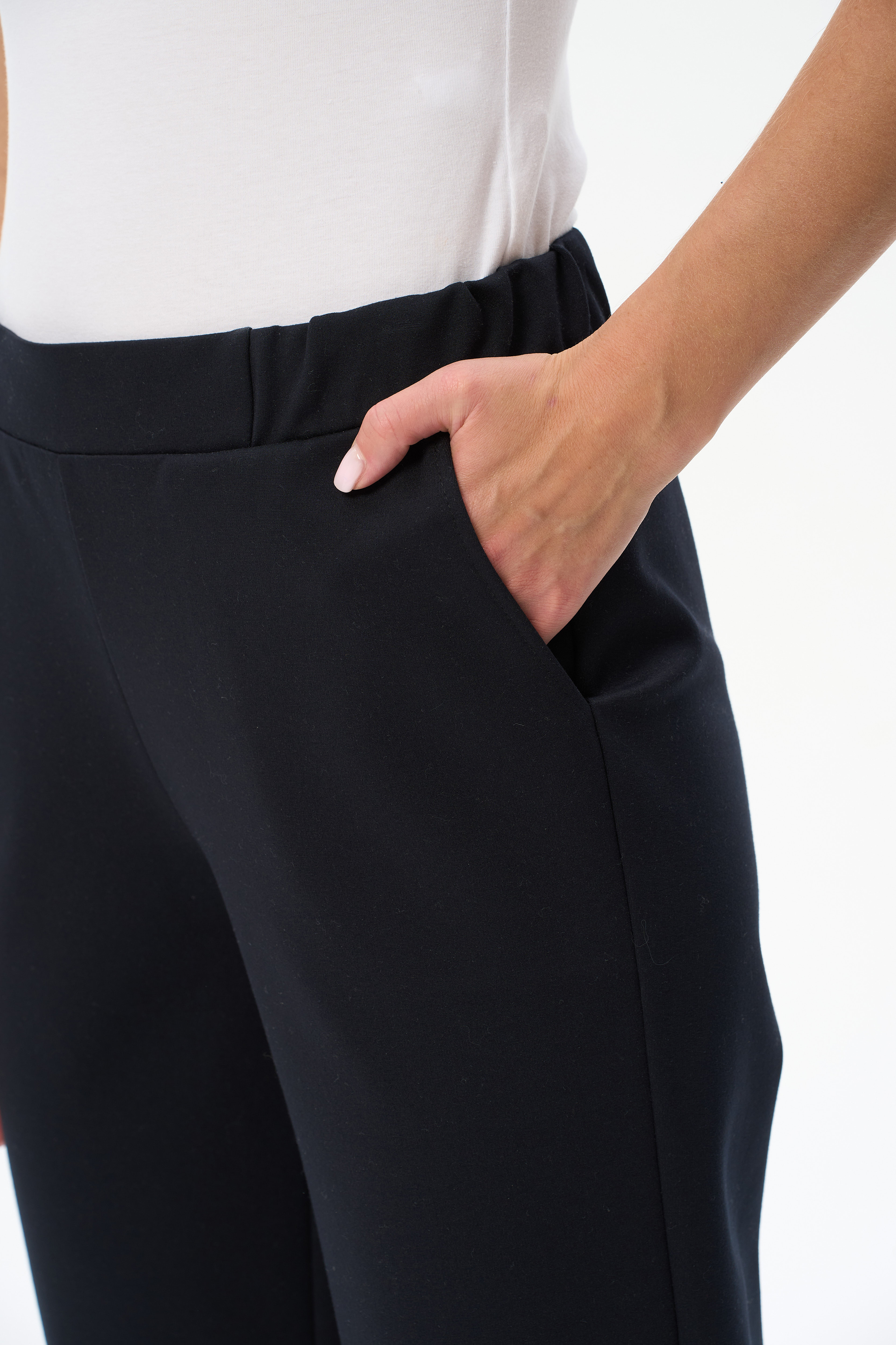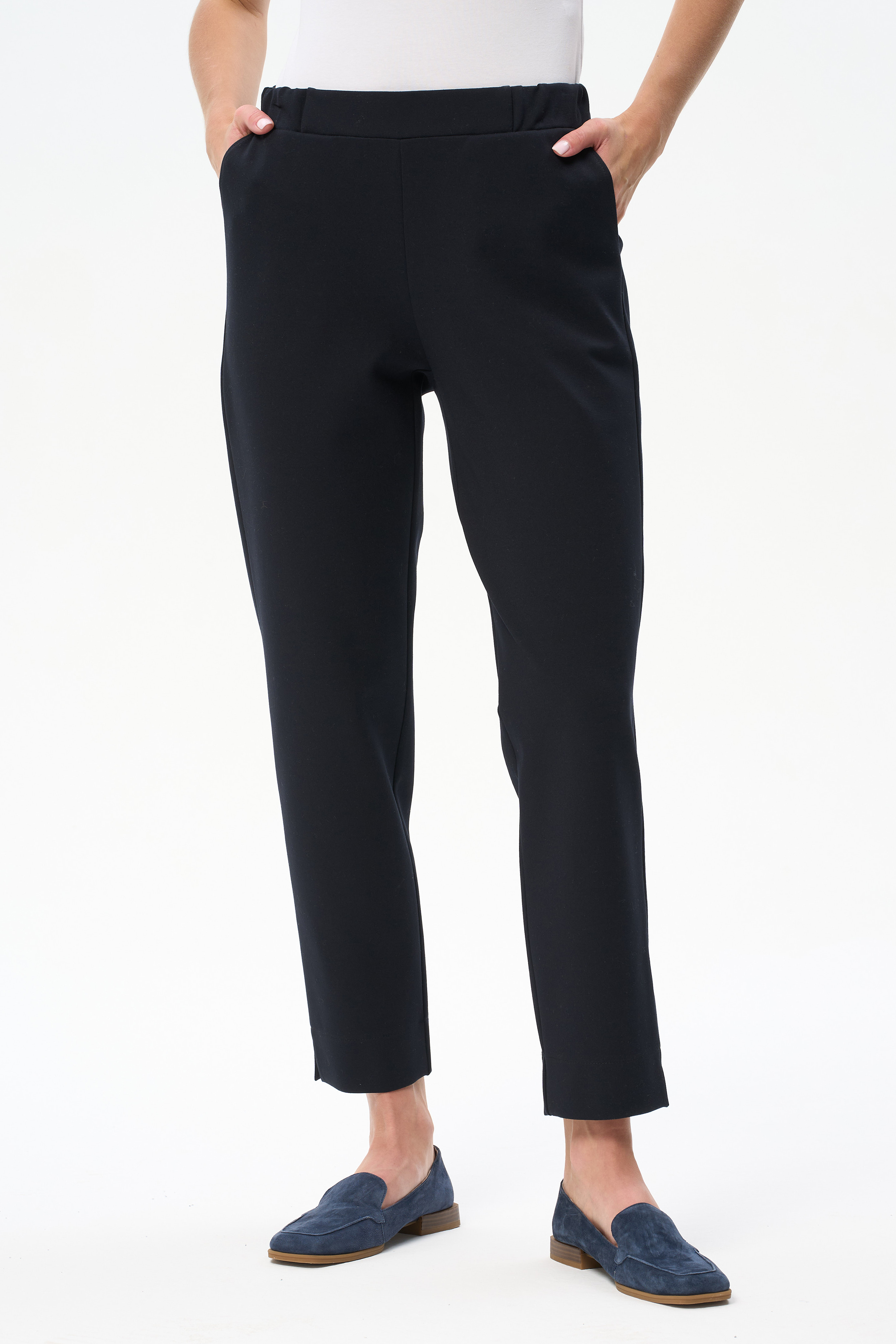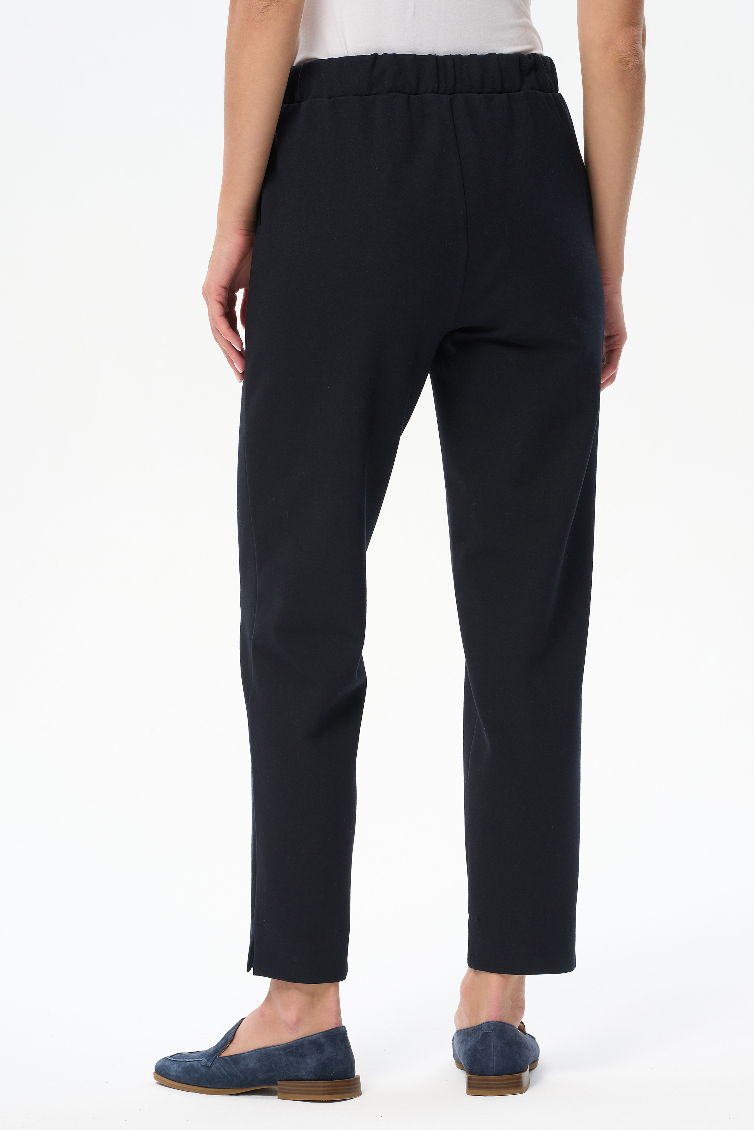 Зауженные брюки, выполнены из плотного трикотажного полотна- бистрейч. Пояс с планкой и эластичной лентой внутри. Фигурные карманы. По низу боковых швов разрезы. Длина по боковому шву (без пояса) в 44 размере 94 см. Рост модели на фото 178 см.