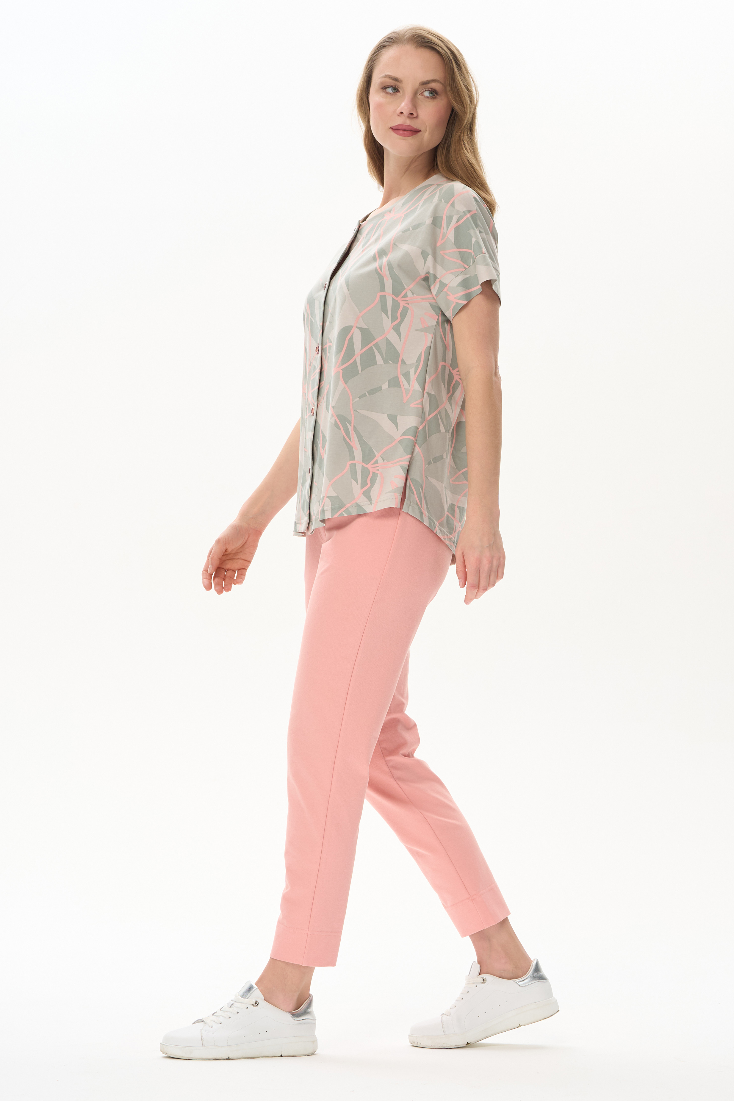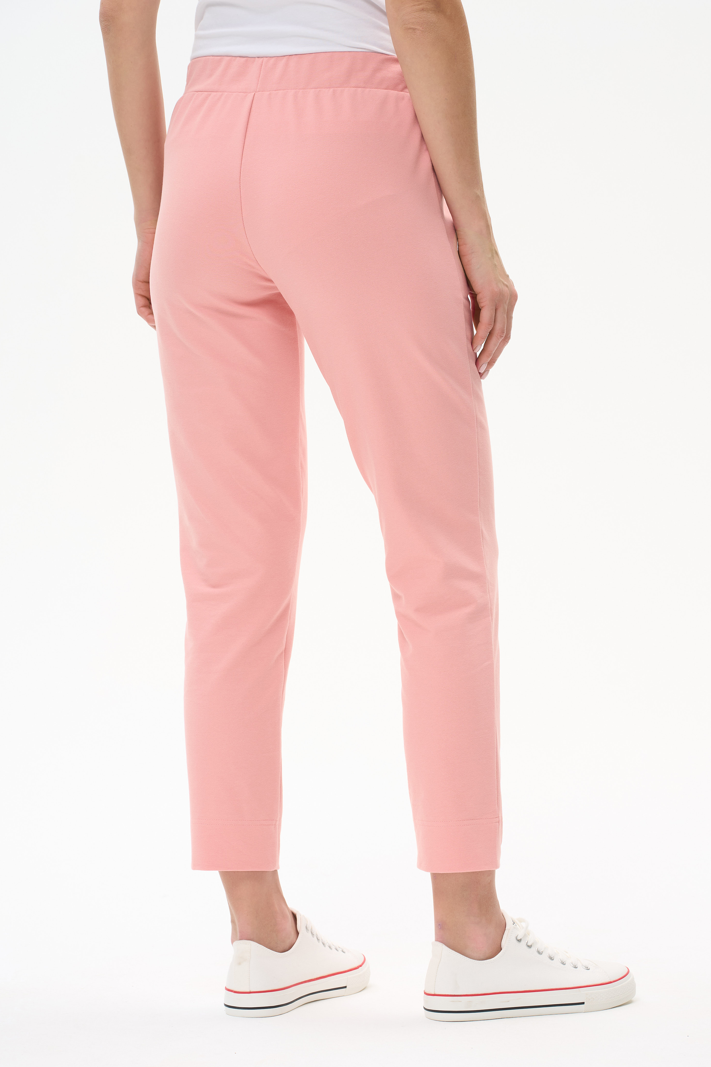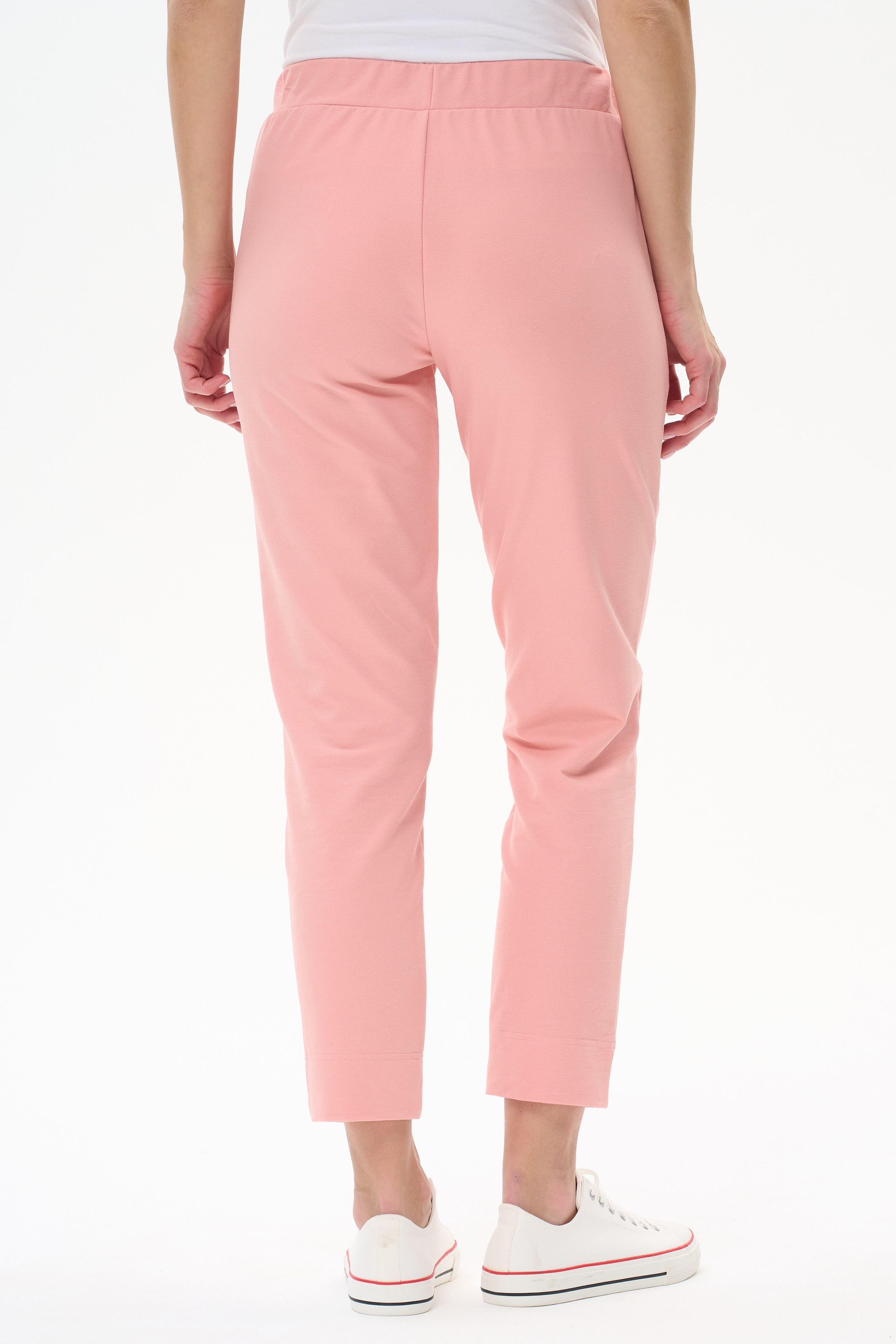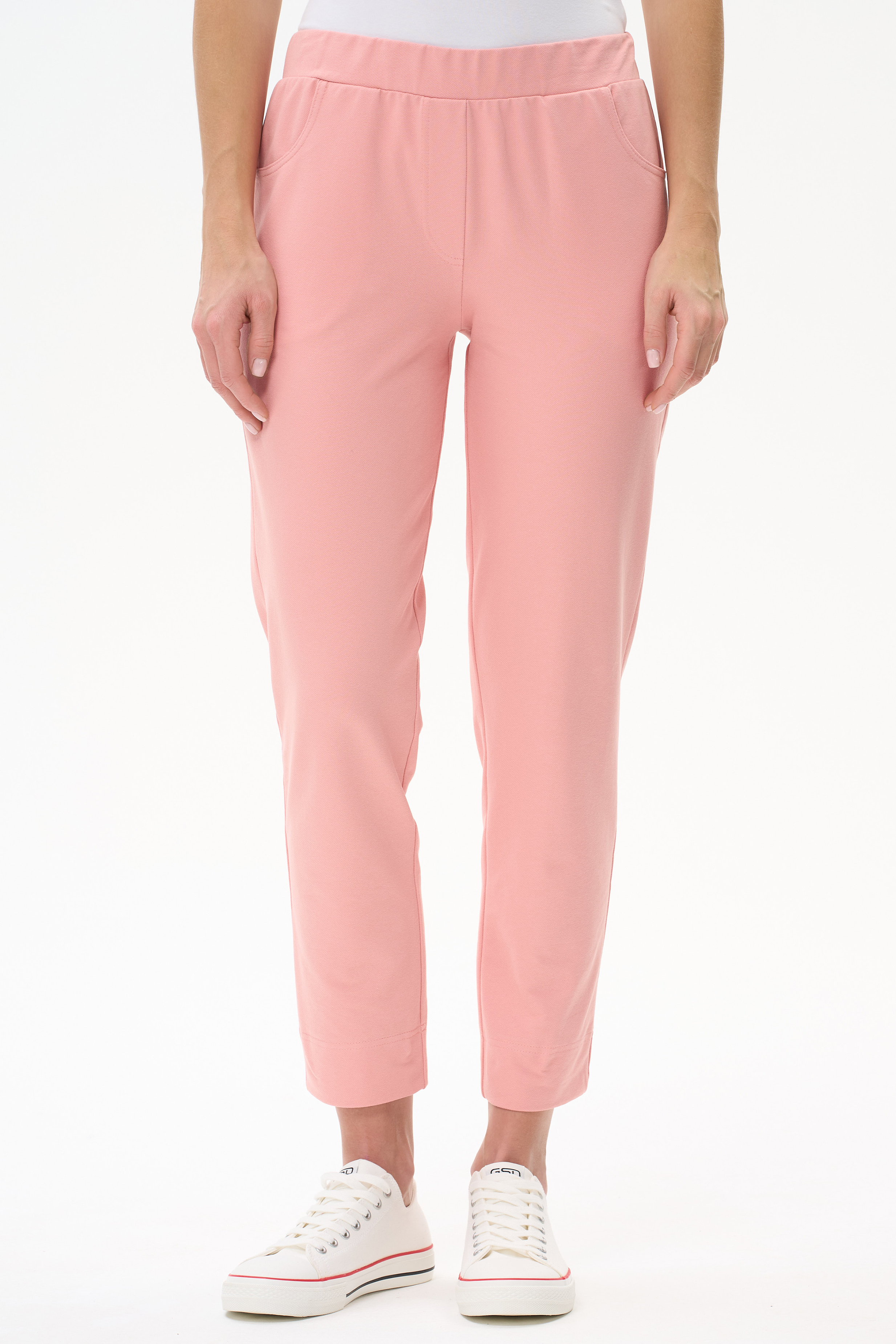 80% хлопок, 14% полиэстер, 6% эластан Зауженные брюки с карманами, из хлопкового полотна джинскотт. Пояс с эластичной лентой внутри. Длина брюк регулируется подворотом. Длина по боковому шву (без учета пояса) в 44 размере 88см. Рост модели 177