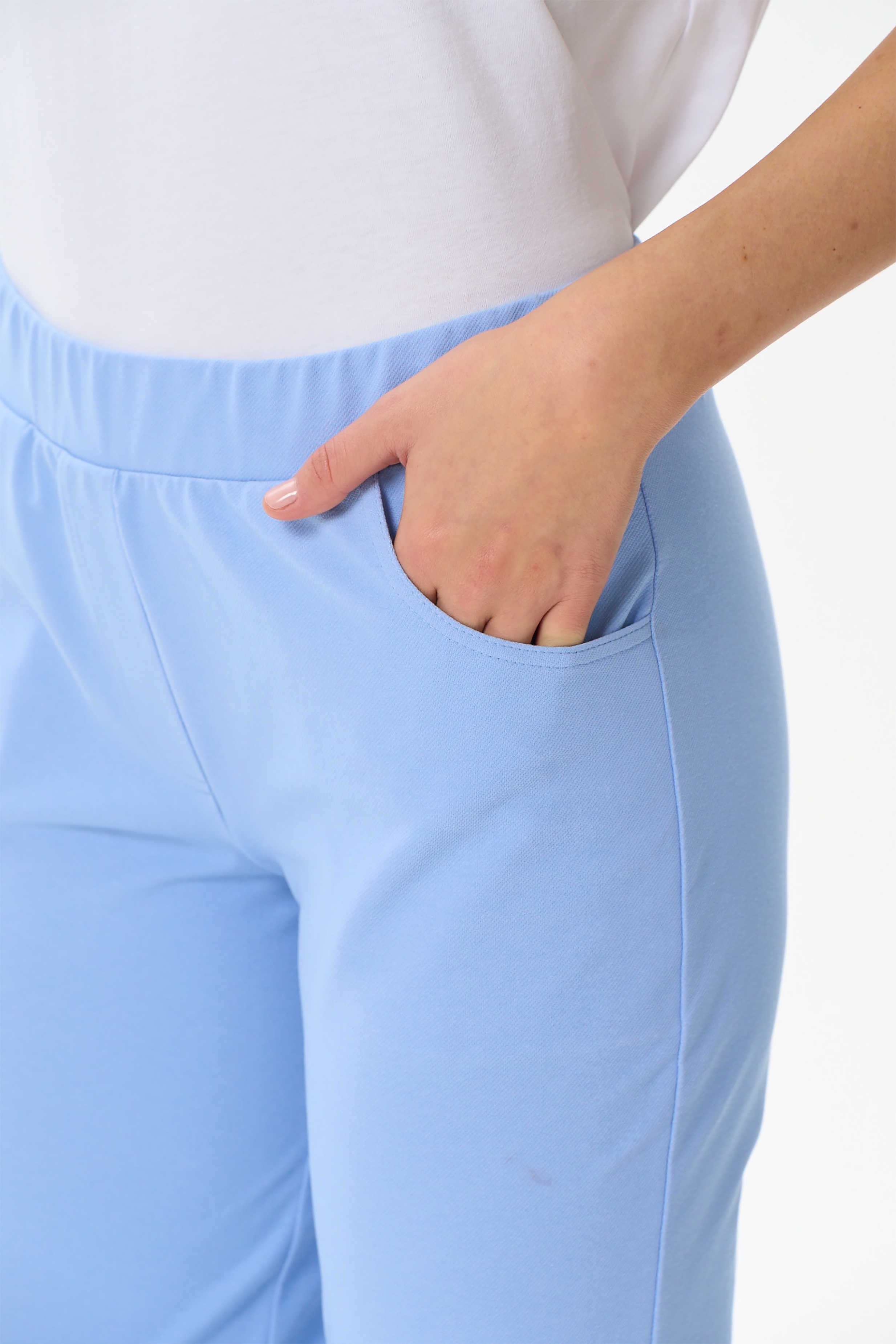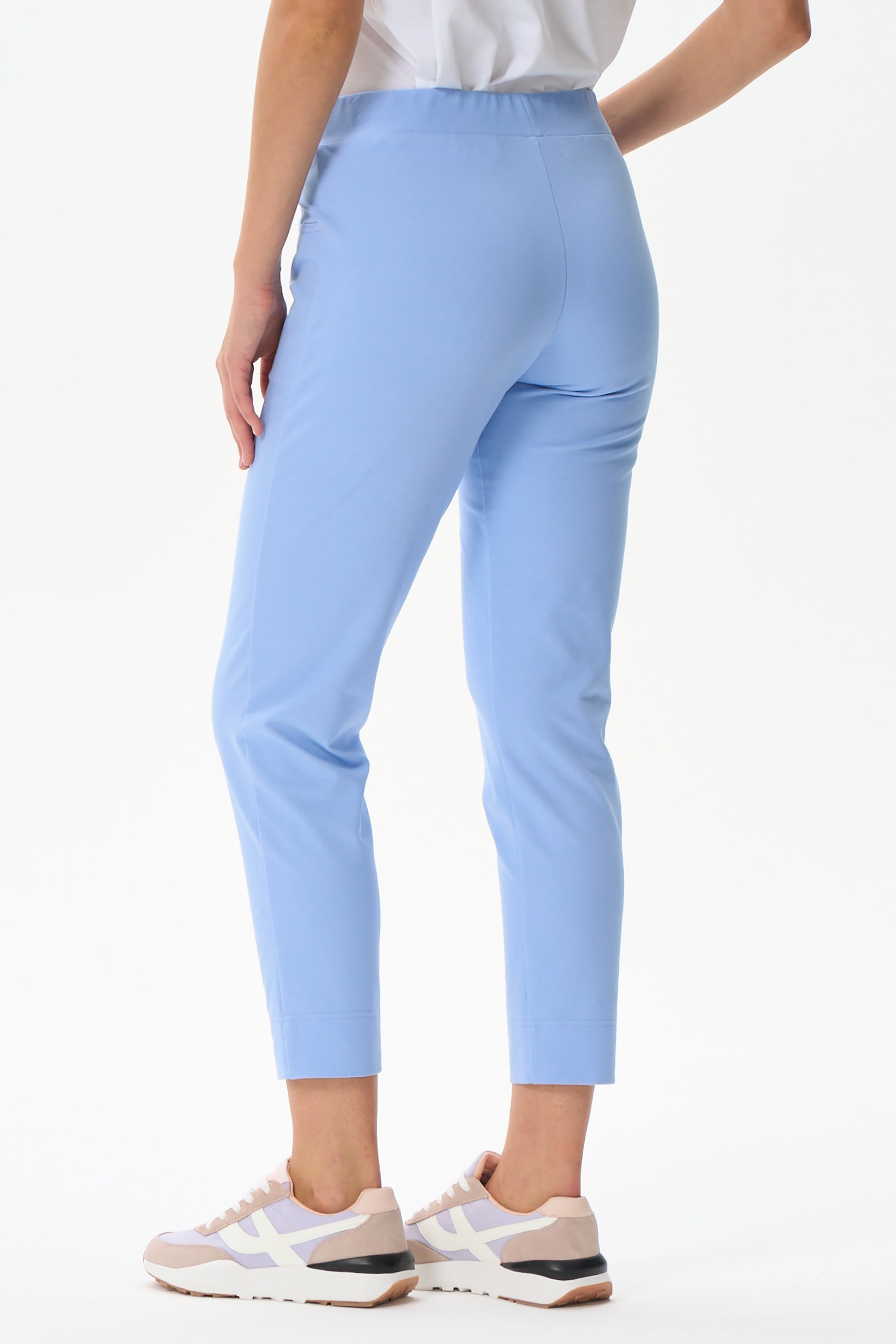80% хлопок, 14% полиэстер, 6% эластан Зауженные брюки с карманами, из хлопкового полотна джинскотт. Пояс с эластичной лентой внутри. Длина брюк регулируется подворотом. Длина по боковому шву (без учета пояса) в 44 размере 88см. Рост модели 177
