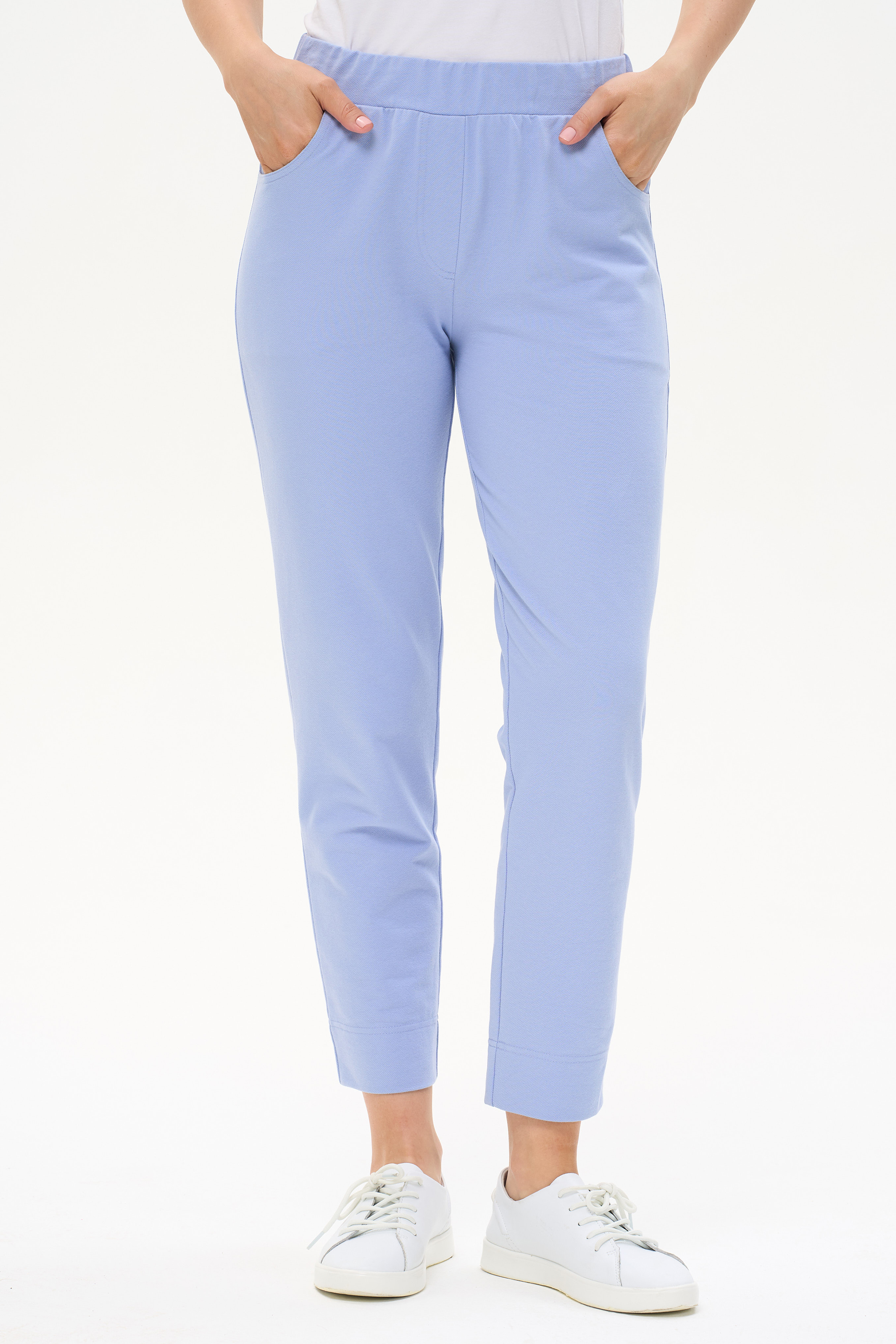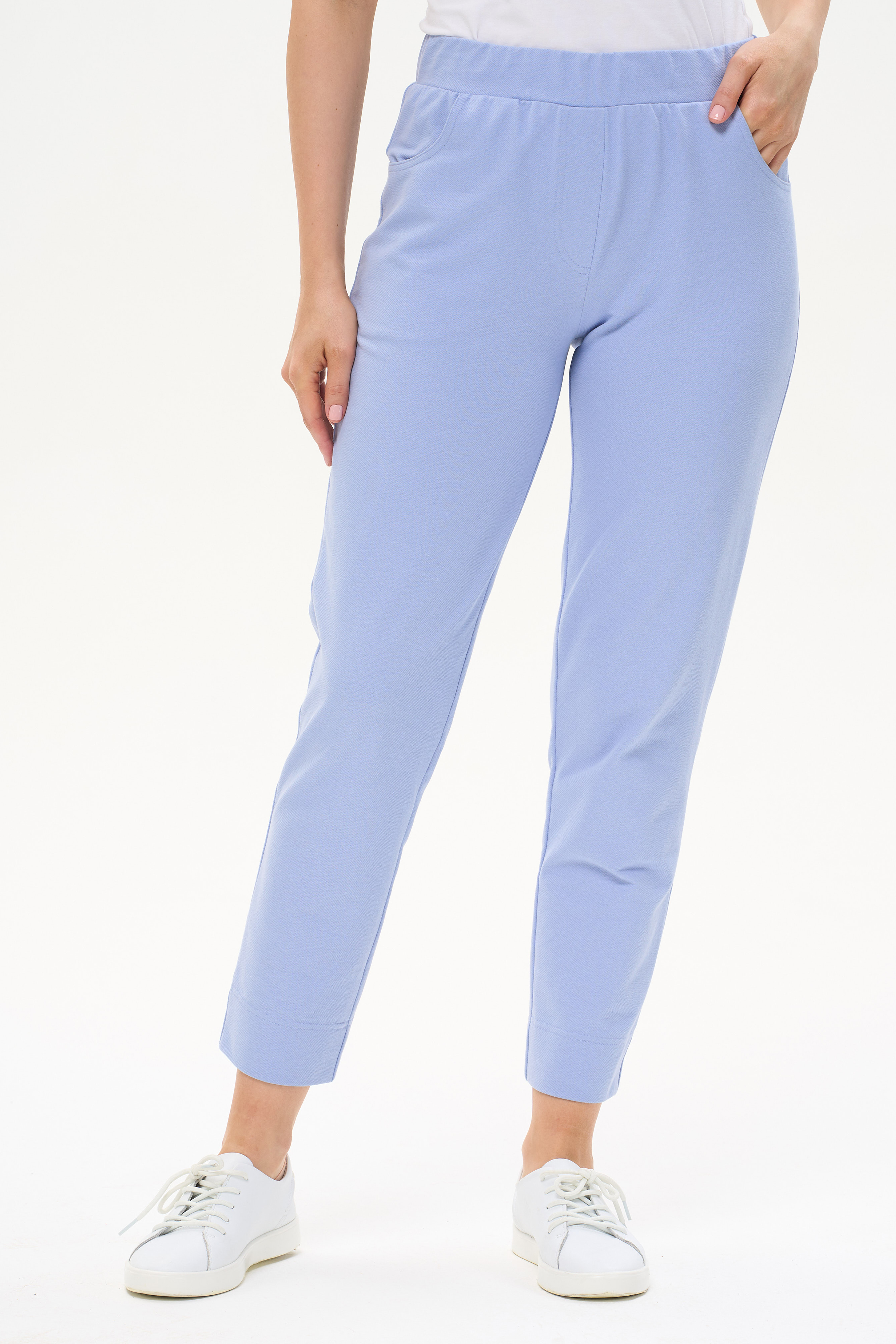 80% хлопок, 14% полиэстер, 6% эластан Зауженные брюки с карманами, из хлопкового полотна джинскотт. Пояс с эластичной лентой внутри. Длина брюк регулируется подворотом. Длина по боковому шву (без учета пояса) в 44 размере 88см. Рост модели 177
