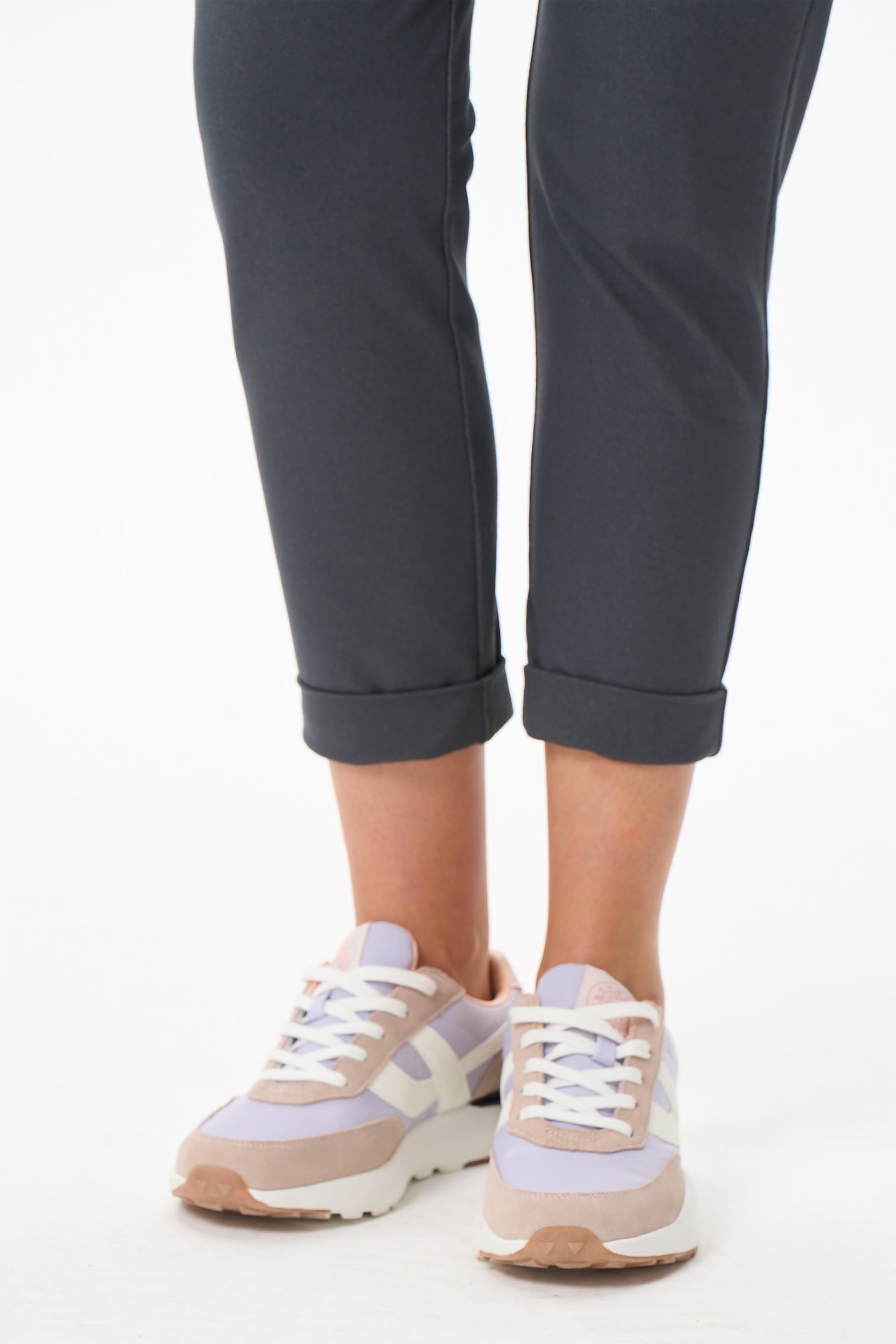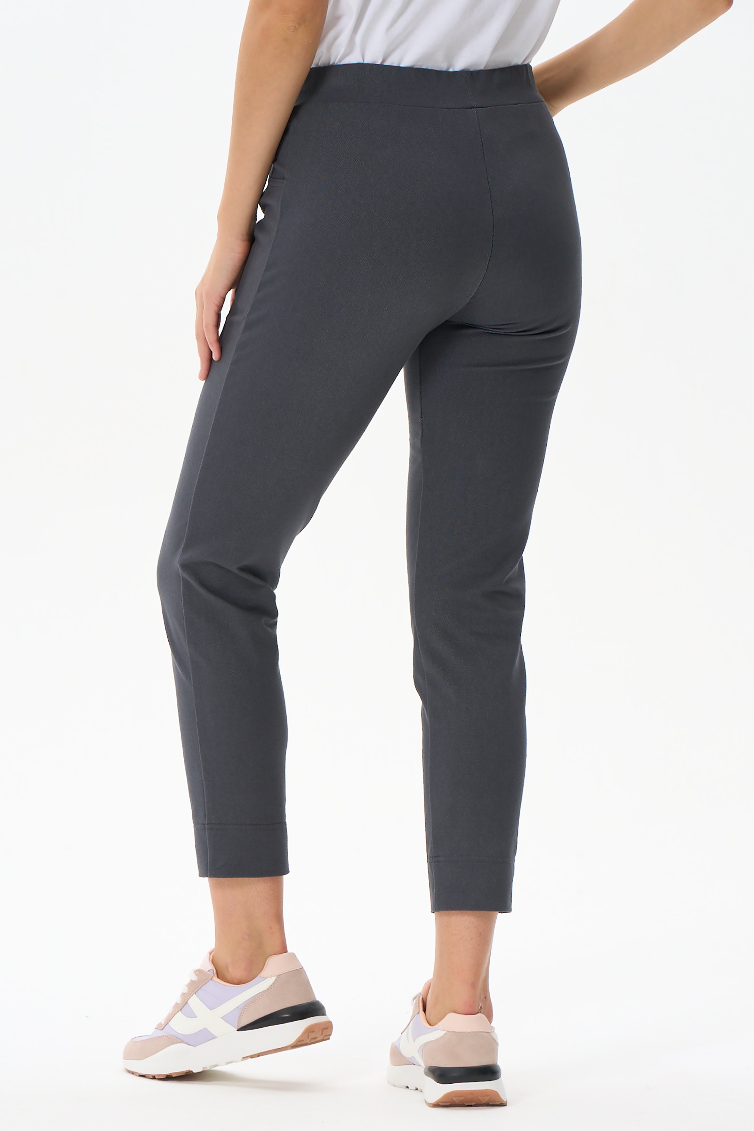 80% хлопок, 14% полиэстер, 6% эластан Зауженные брюки с карманами, из хлопкового полотна джинскотт. Пояс с эластичной лентой внутри. Длина брюк регулируется подворотом. Длина по боковому шву (без учета пояса) в 44 размере 88см. Рост модели 177
