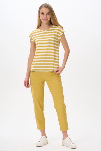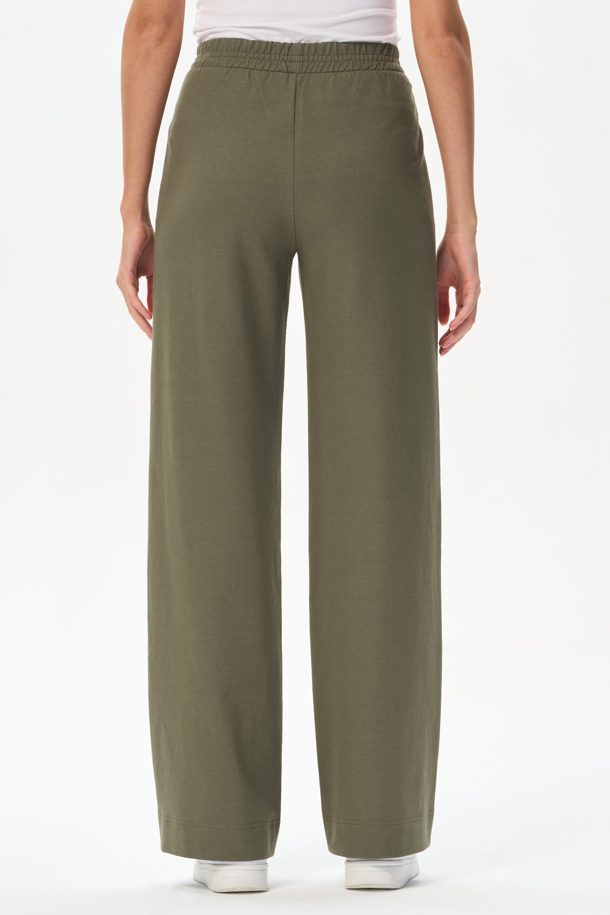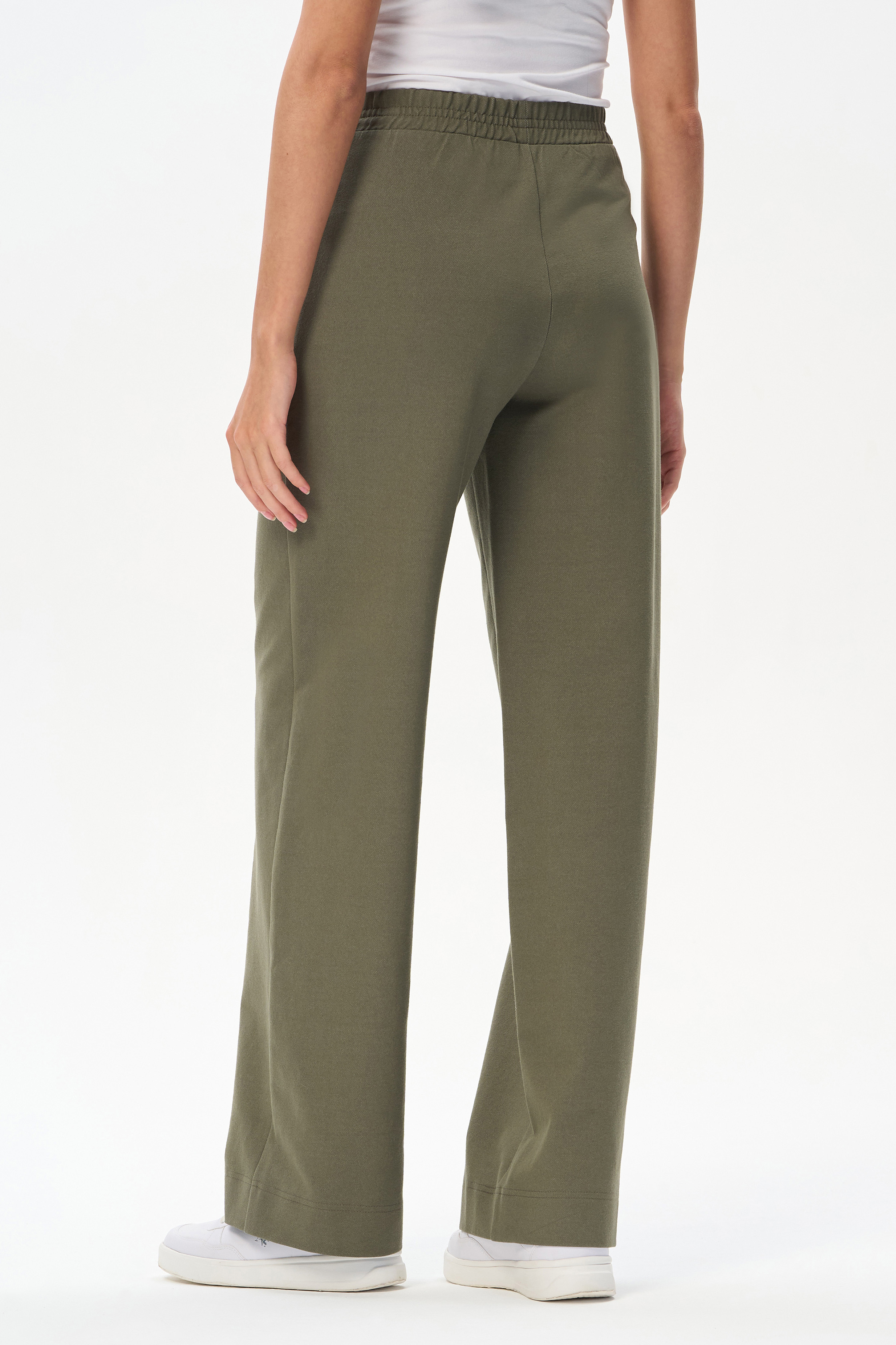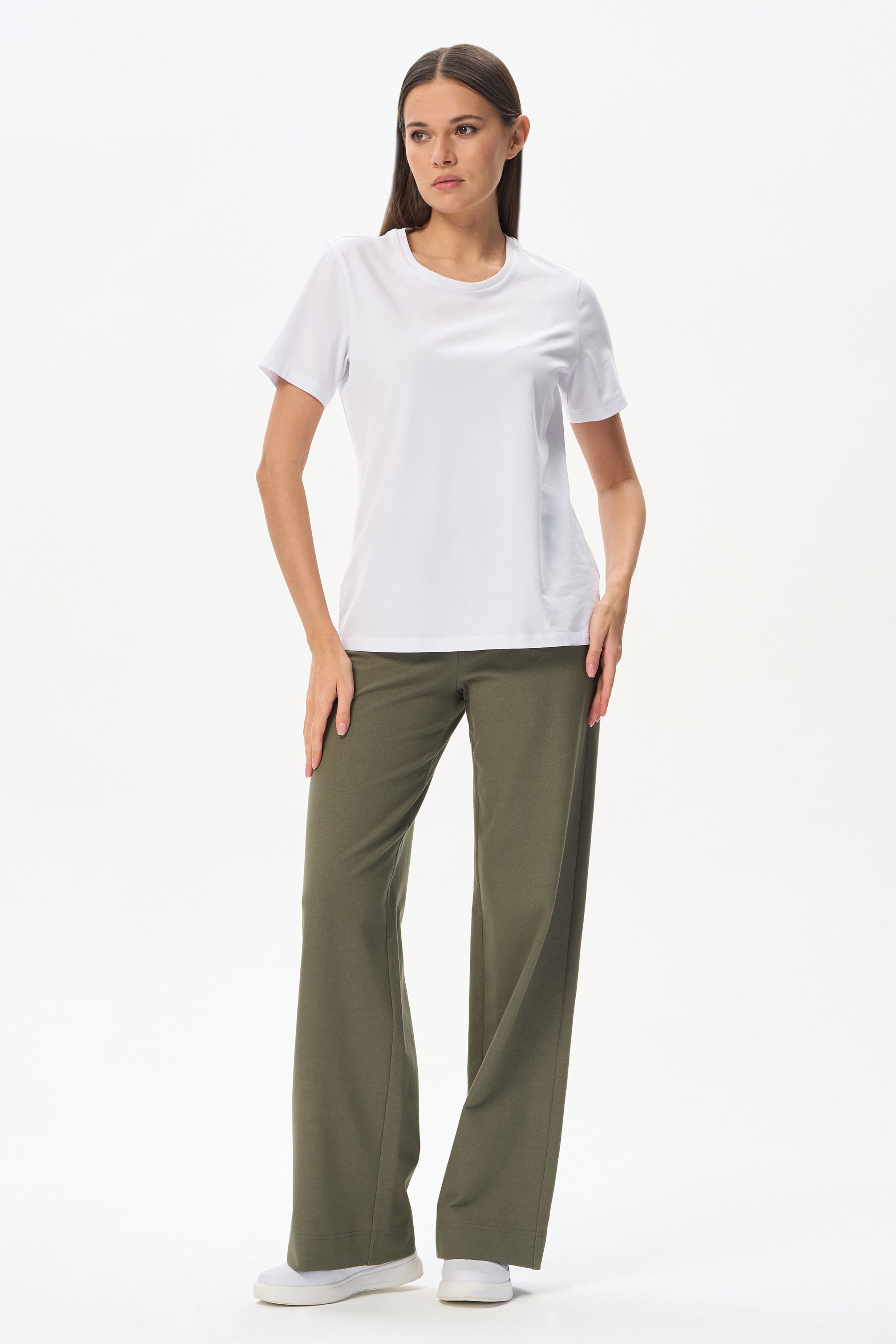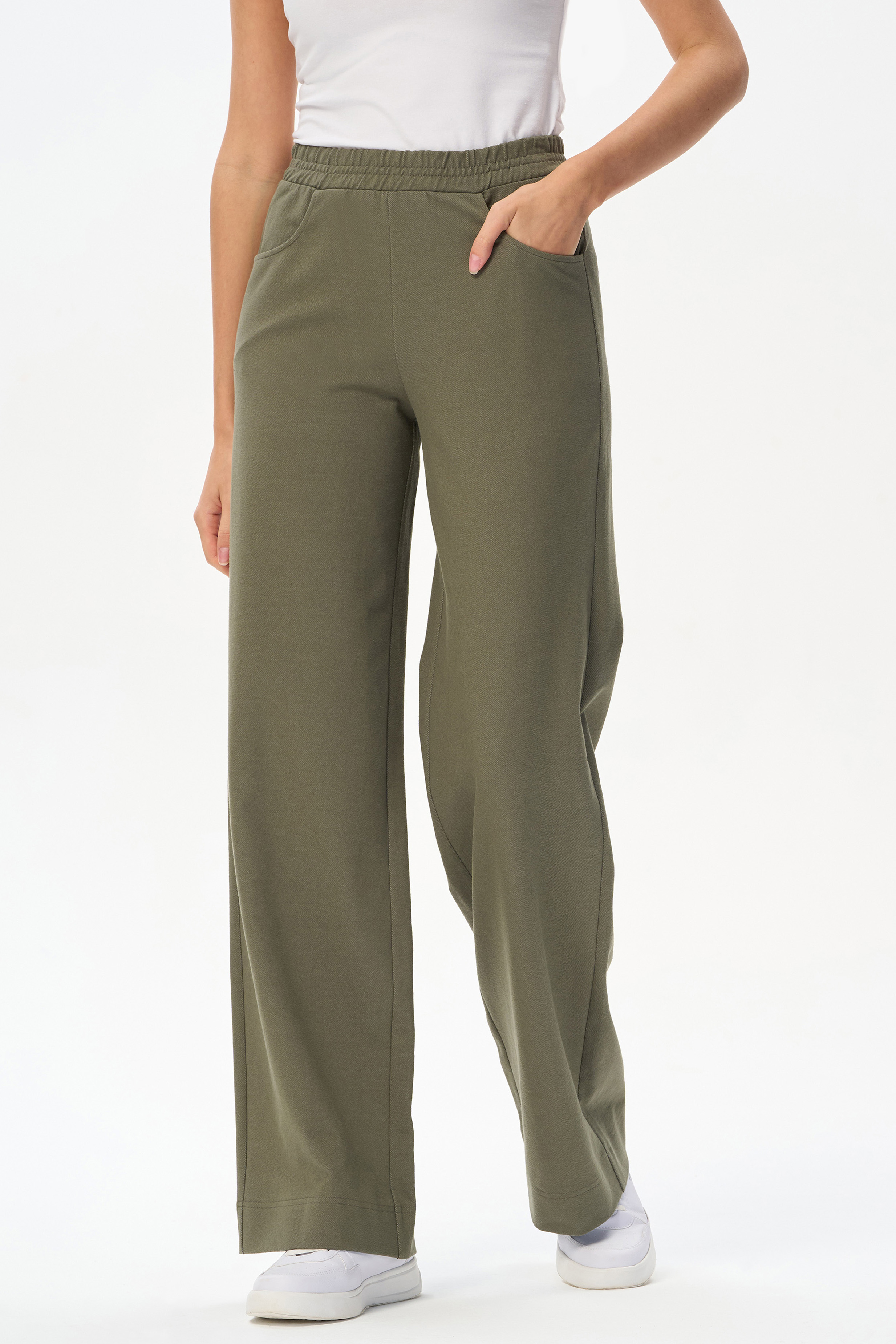 80% хлопок, 14% полиэстер, 6% эластан Прямые брюки с высокой посадкой. Выполнены из хлопковой трикотажной джинсы. Спереди фигурные карманы, пояс с эластичной лентой внутри. Длина по боковому шву (без пояса ) в 44 размере - 104см. Рост модели 175.