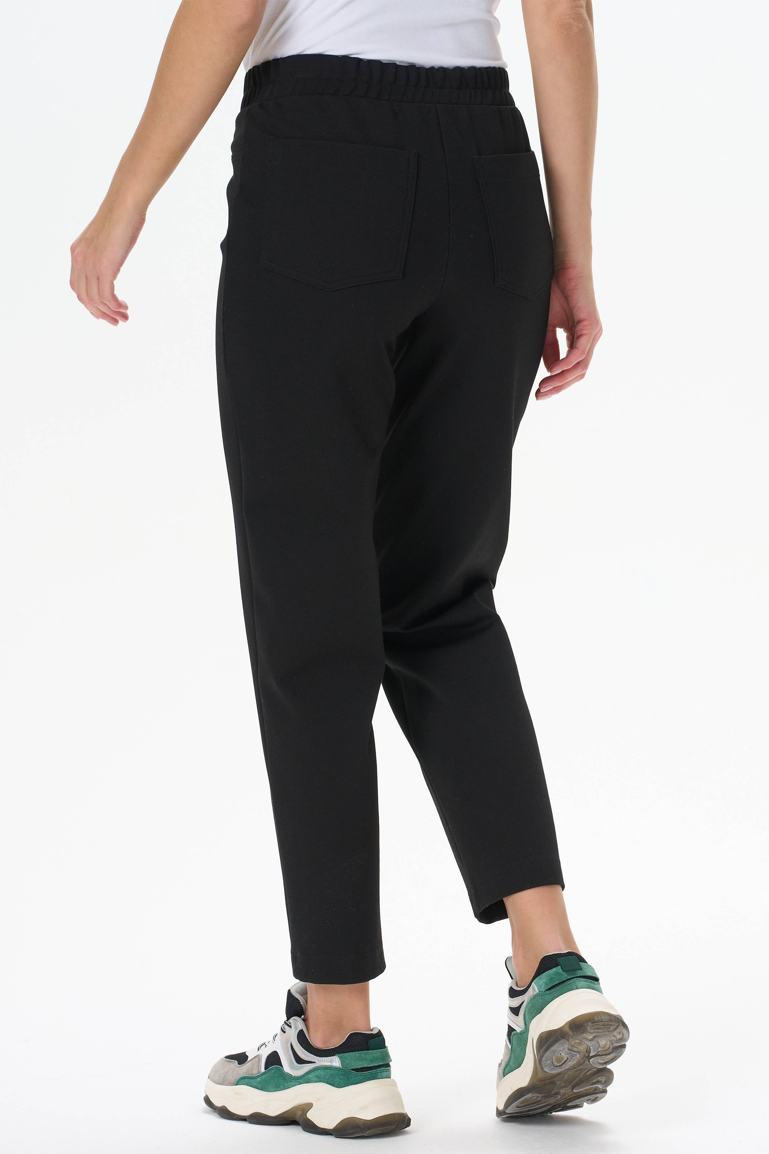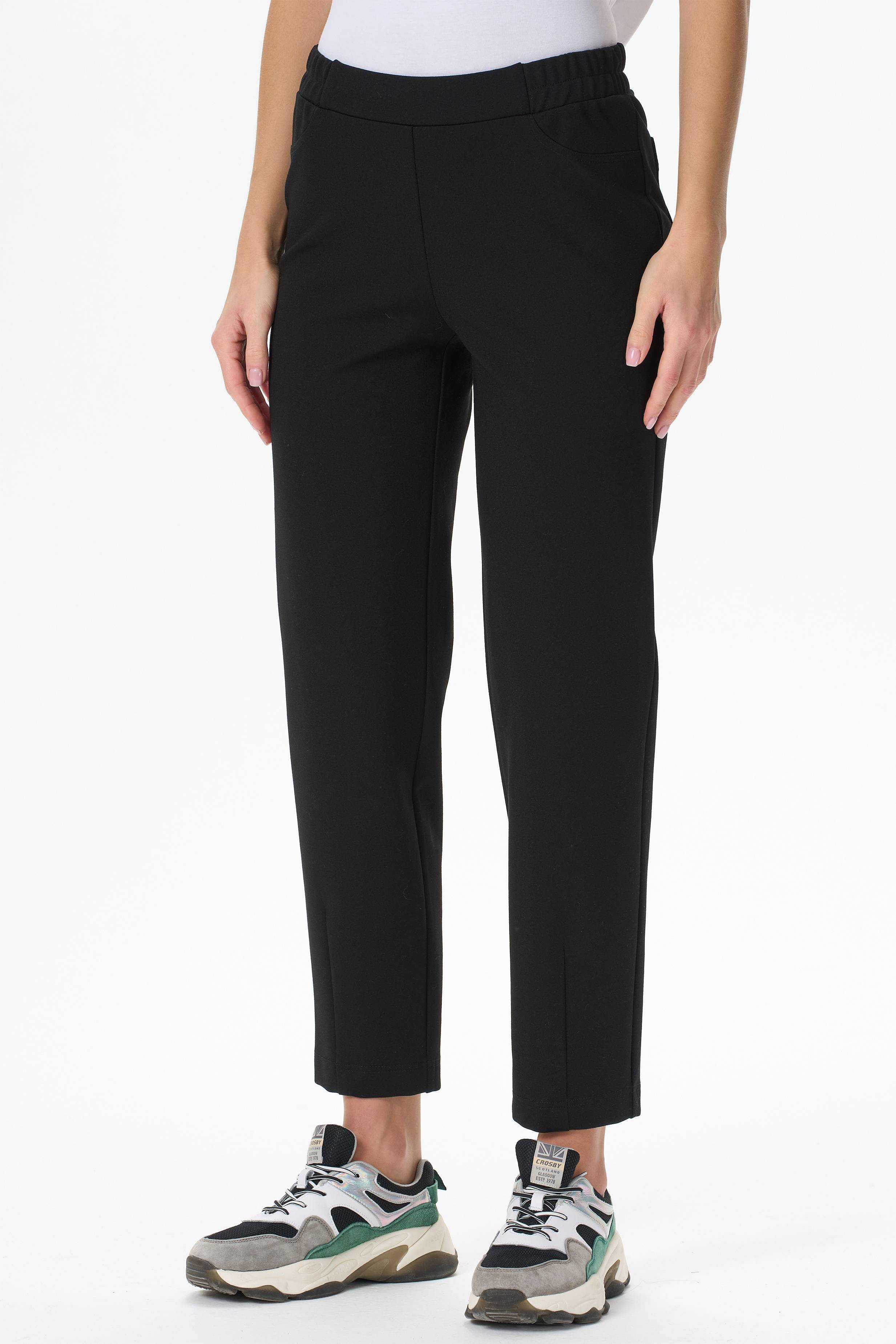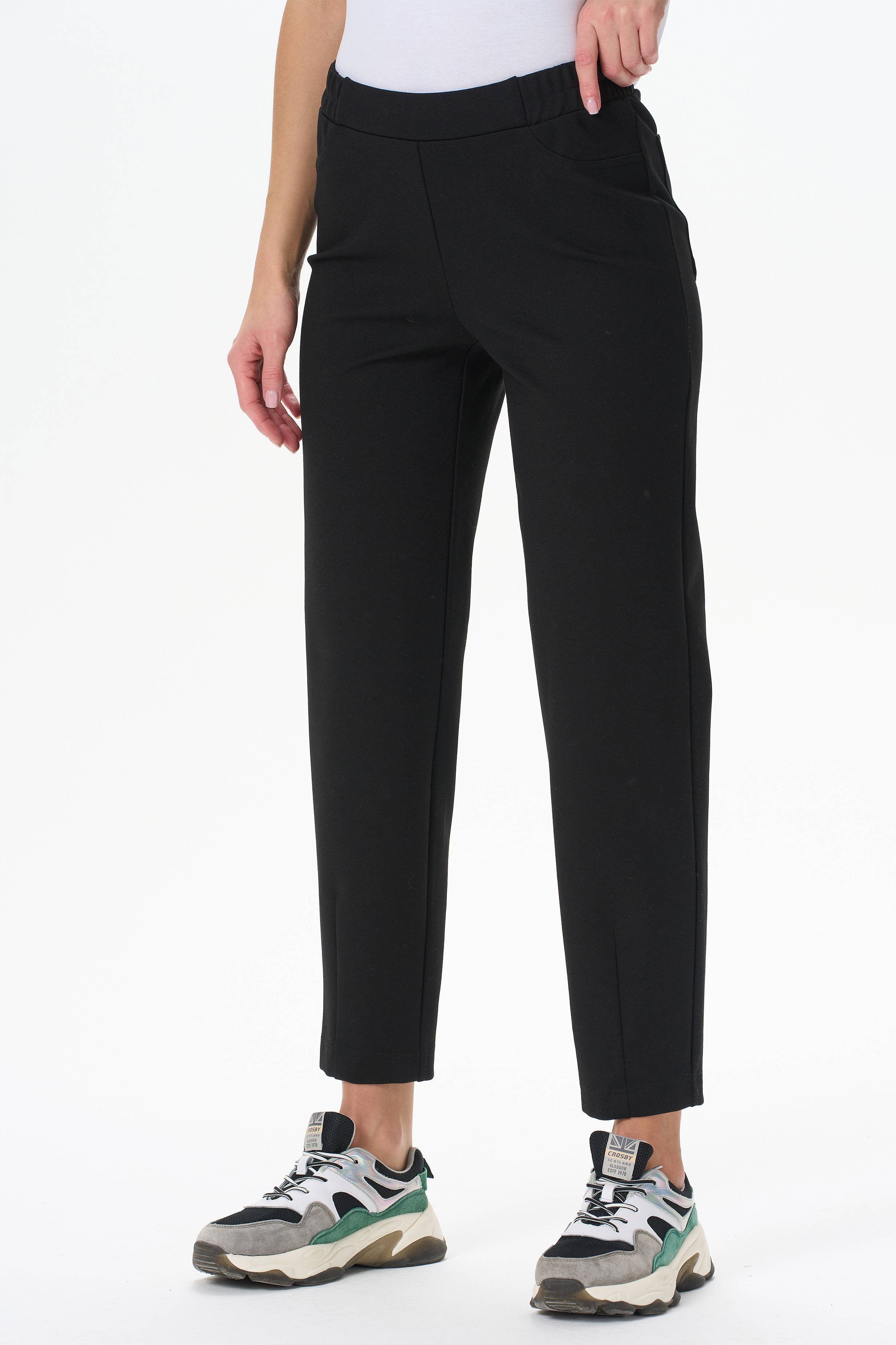 65% вискоза, 27% полиэстер, 8% эластан Утепленные зауженные брюки. Выполнены из плотного трикотажного полотна- бистрейч с начесом. Пояс с эластичной лентой внутри. Сзади два накладных кармана. Длина по боковому шву (без пояса) в 44 размере 93см. Рост модели на фото 178 см.